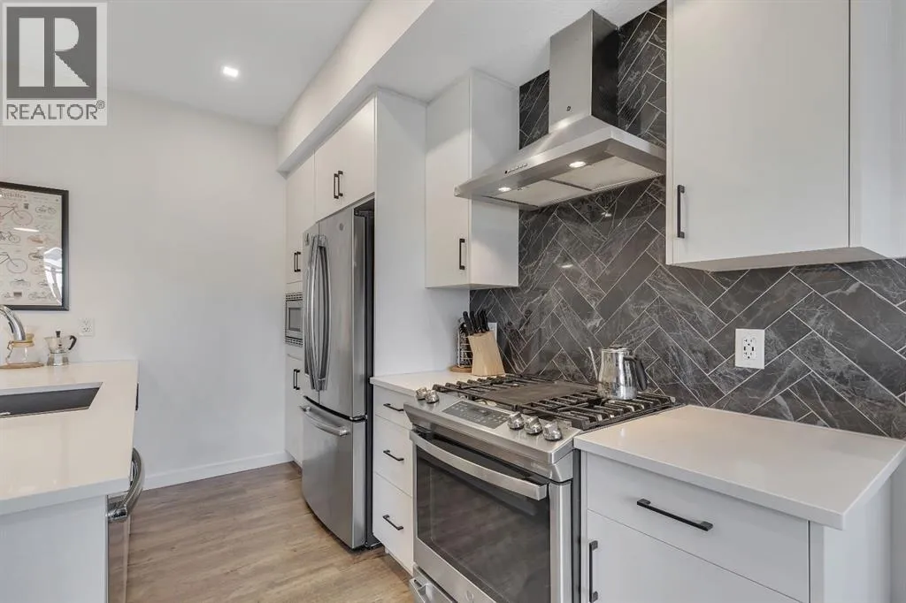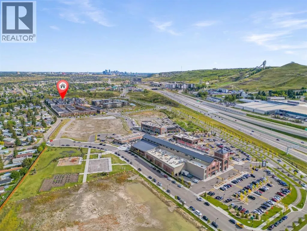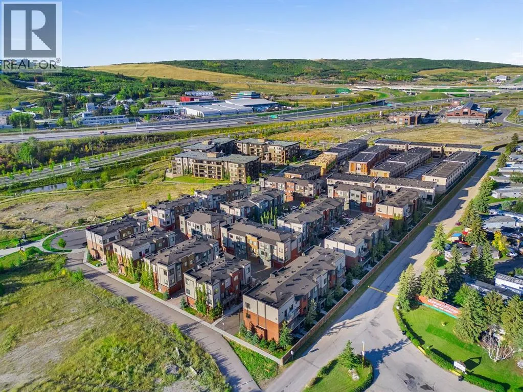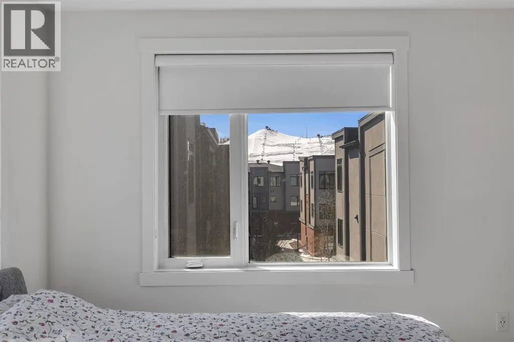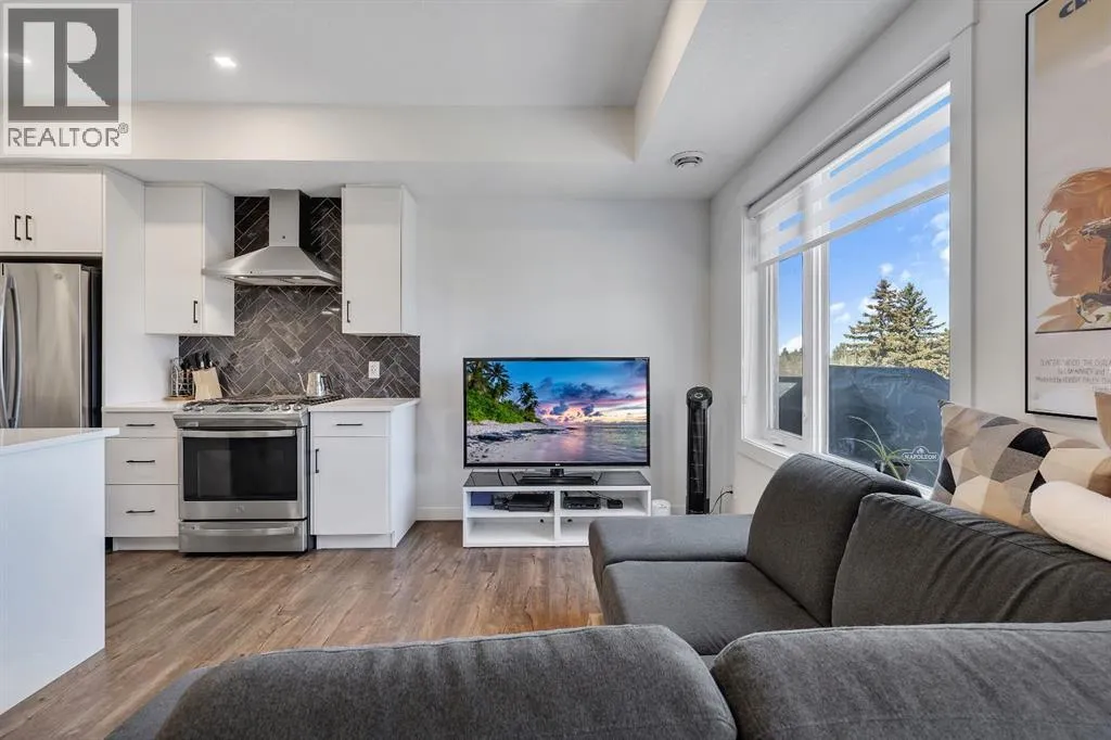 private, secure single attached garage and a full builder show home upgrade package. It perfectly blends the privacy of a townhome with the convenience of an apartment style layout. Upon entry, you are greeted by a welcoming foyer with under stair storage, leading to two flights of stairs up to your exclusive top floor retreat. The upper level opens into a spacious living and dining area, complemented by a beautifully upgraded kitchen featuring stainless steel gourmet appliances, a gas stove, chimney hood fan, built in microwave, and a full herringbone tile backsplash. Just off the living room, enjoy a large glass panelled balcony with sweeping views toward Bowness and the surrounding green space, perfect for relaxing or entertaining. With only a limited number of upper level units, just 8 in the community, this home offers a rare opportunity for elevated privacy and scenic outlooks over established greenery and ridge pathways. The single level floor plan includes two well appointed bedrooms and two full bathrooms. The primary suite is enhanced by additional corner windows, providing abundant natural light with east facing and south backing exposure. It also features a spacious closet and a private ensuite with a walk in shower, upgraded tile work, and quartz countertops. Built with quality and attention to detail, this home includes vinyl plank flooring from Divine Flooring’s Voyage line, quartz countertops throughout, upgraded stainless steel appliances, enhanced tile work in the kitchen and bathrooms, upgraded carpet and underlay, window coverings, and 9 foot ceilings. Greenwich is a vibrant, g rowing community offering excellent walkability to nearby amenities such as the Calgary Farmers’ Market, Analog Coffee, Market Wines, and Mash Pizza. Residents also enjoy access to established walking and biking trails, two playgrounds, and an off leash dog park. Conveniently located just 18 minutes to downtown Calgary, 12 minutes to the University of Calgary and Foothills Hospital, and only 45 minutes to the mountains, this home offers the perfect balance of urban convenience and outdoor lifestyle.Discover what makes Greenwich one of NW Calgary’s premier communities to call home. (id:62650)