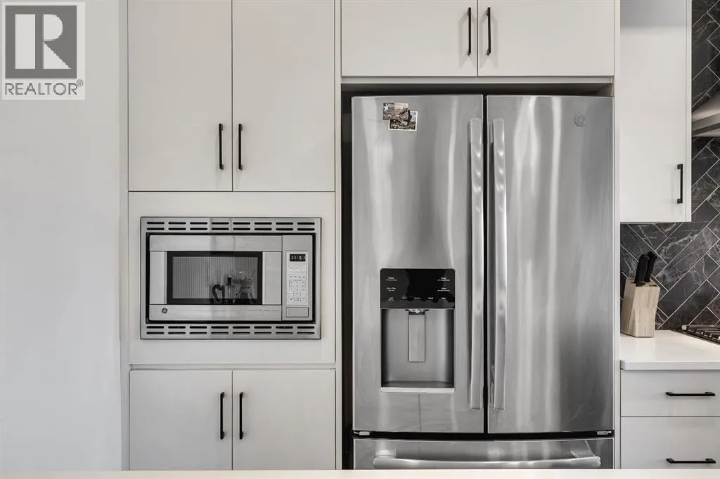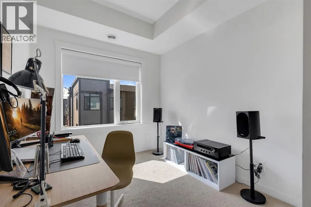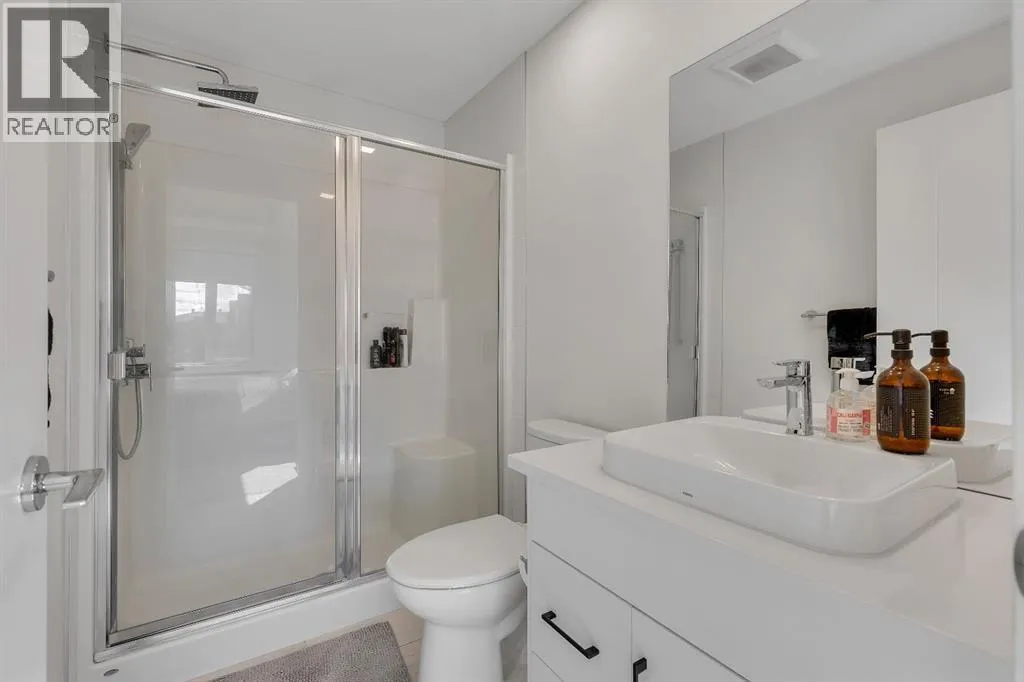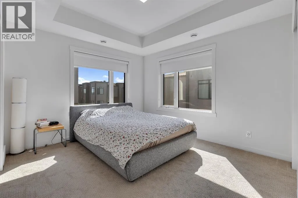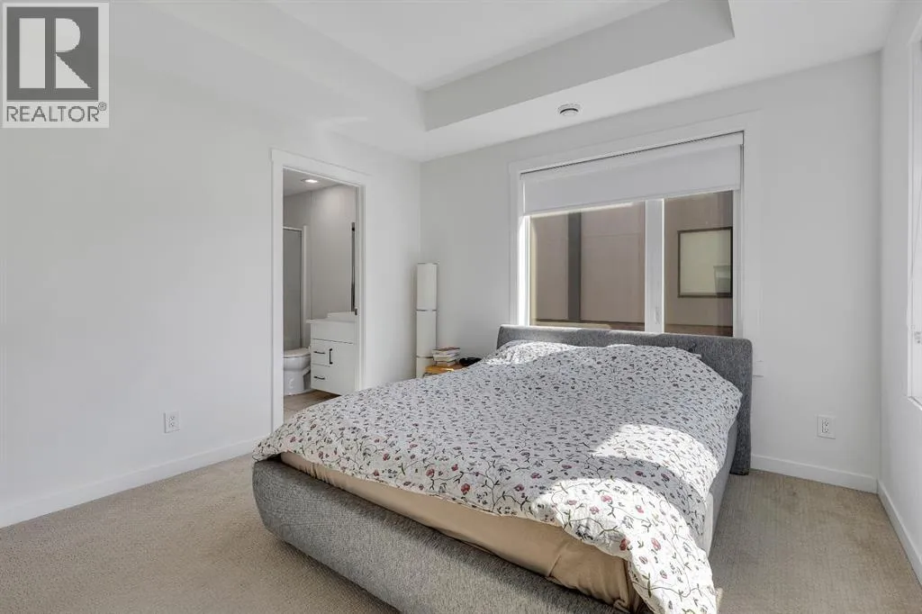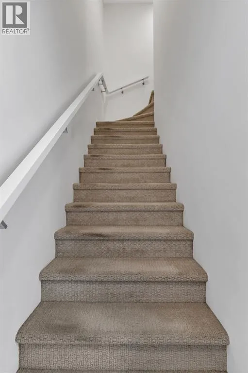 private, secure single attached garage and a full builder show home upgrade package. It perfectly blends the privacy of a townhome with the convenience of an apartment style layout. Upon entry, you are greeted by a welcoming foyer with under stair storage, leading to two flights of stairs up to your exclusive top floor retreat. The upper level opens into a spacious living and dining area, complemented by a beautifully upgraded kitchen featuring stainless steel gourmet appliances, a gas stove, chimney hood fan, built in microwave, and a full herringbone tile backsplash. Just off the living room, enjoy a large glass panelled balcony with sweeping views toward Bowness and the surrounding green space, perfect for relaxing or entertaining. With only a limited number of upper level units, just 8 in the community, this home offers a rare opportunity for elevated privacy and scenic outlooks over established greenery and ridge pathways. The single level floor plan includes two well appointed bedrooms and two full bathrooms. The primary suite is enhanced by additional corner windows, providing abundant natural light with east facing and south backing exposure. It also features a spacious closet and a private ensuite with a walk in shower, upgraded tile work, and quartz countertops. Built with quality and attention to detail, this home includes vinyl plank flooring from Divine Flooring’s Voyage line, quartz countertops throughout, upgraded stainless steel appliances, enhanced tile work in the kitchen and bathrooms, upgraded carpet and underlay, window coverings, and 9 foot ceilings. Greenwich is a vibrant, g rowing community offering excellent walkability to nearby amenities such as the Calgary Farmers’ Market, Analog Coffee, Market Wines, and Mash Pizza. Residents also enjoy access to established walking and biking trails, two playgrounds, and an off leash dog park. Conveniently located just 18 minutes to downtown Calgary, 12 minutes to the University of Calgary and Foothills Hospital, and only 45 minutes to the mountains, this home offers the perfect balance of urban convenience and outdoor lifestyle.Discover what makes Greenwich one of NW Calgary’s premier communities to call home. (id:62650)