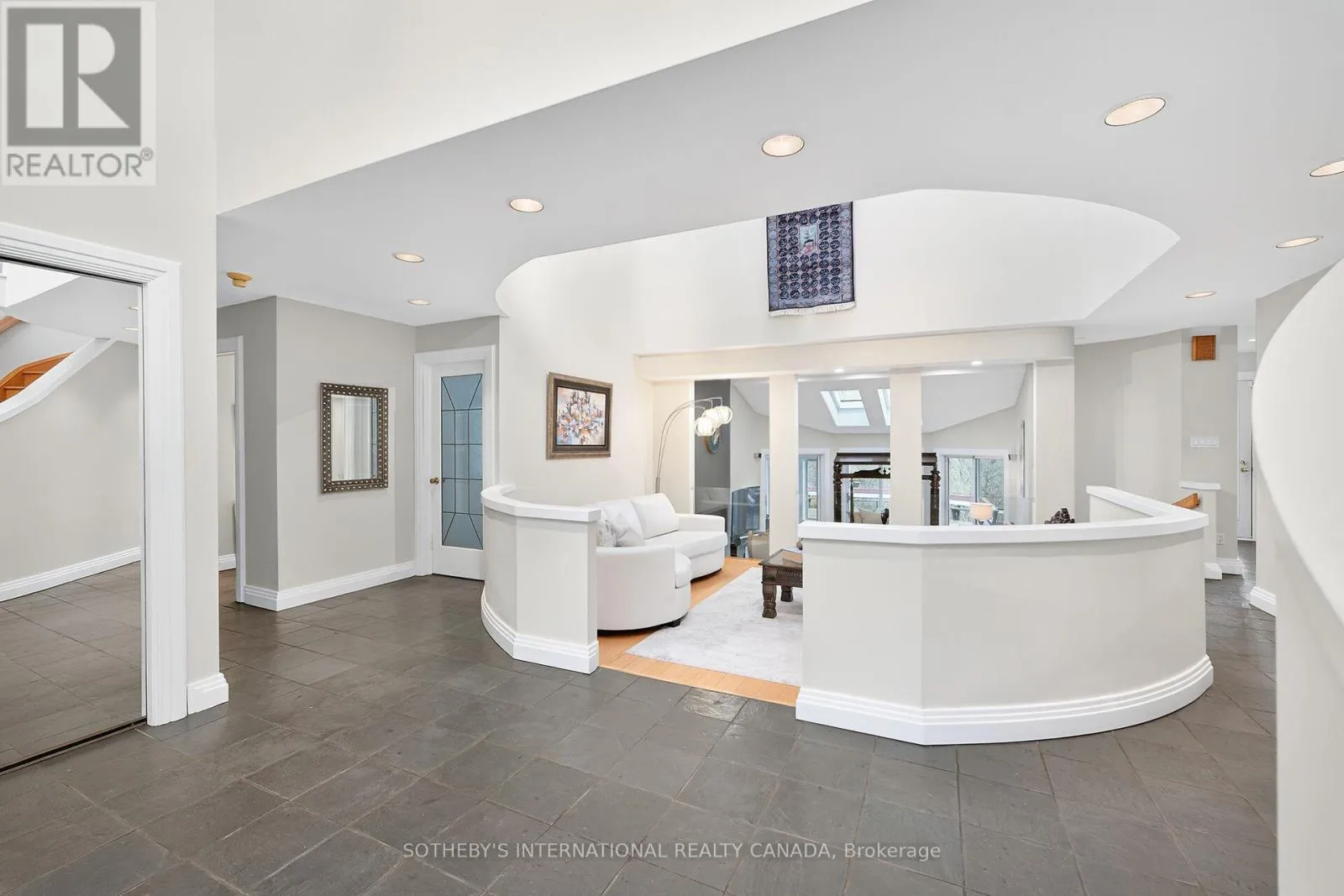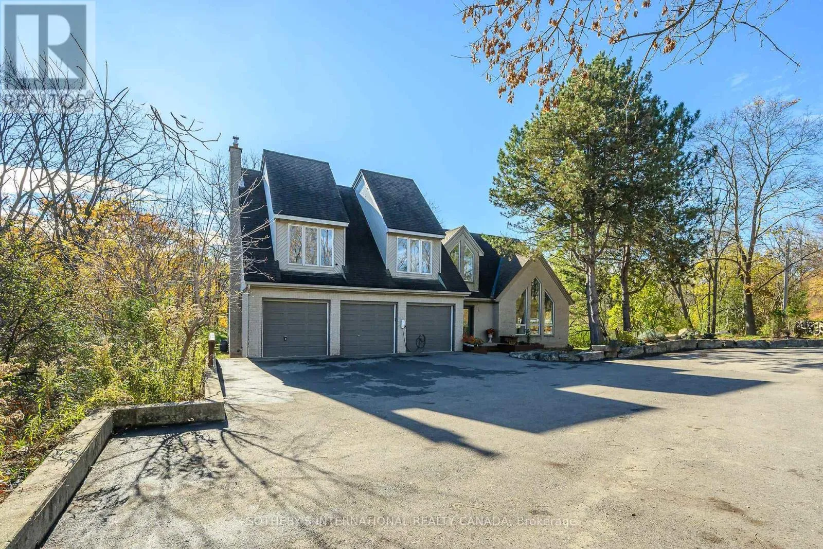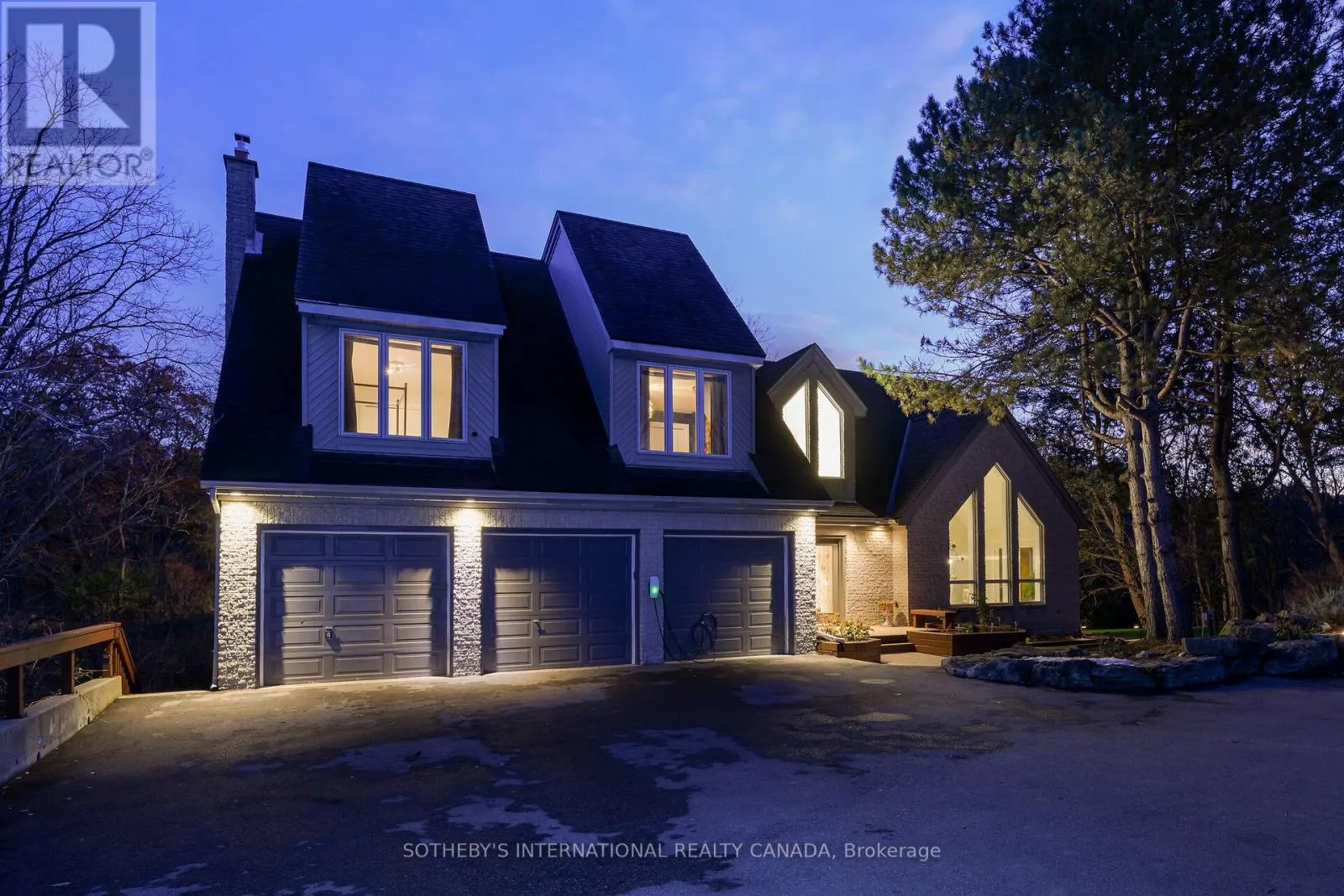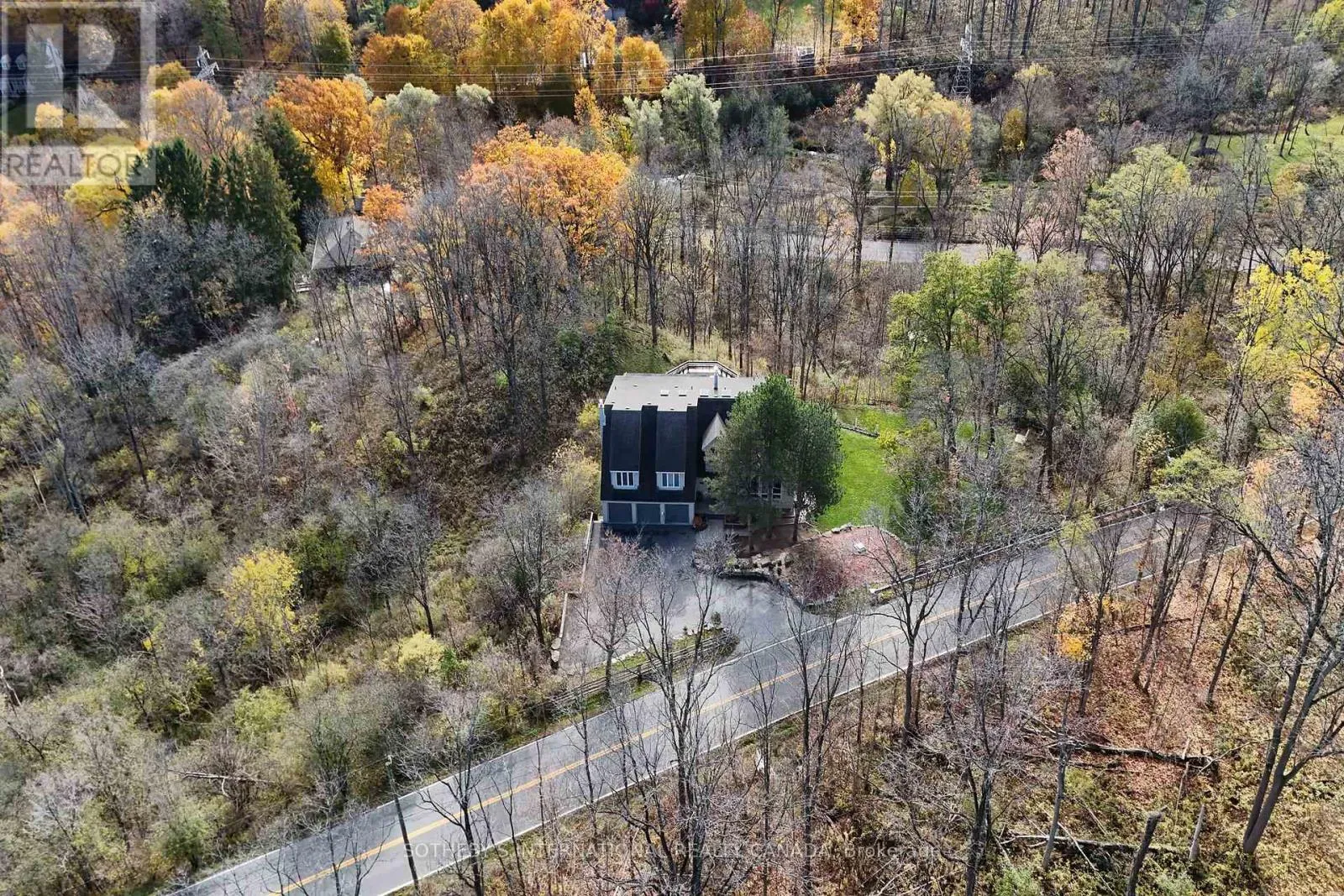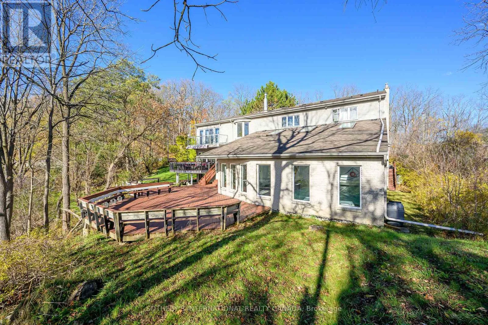 Breathtaking Ravine Views Meet Striking Architectural Design Set on over two acres of secluded woodland, this extraordinary custom-built estate blends dramatic architecture with natural serenity. From the moment you enter, soaring 23-ft ceilings and numerous skylights flood the home with sunlight, highlighting sweeping open-concept spaces and elegant curved upper hallways. Picturesque windows capture stunning ravine and forest views, creating a