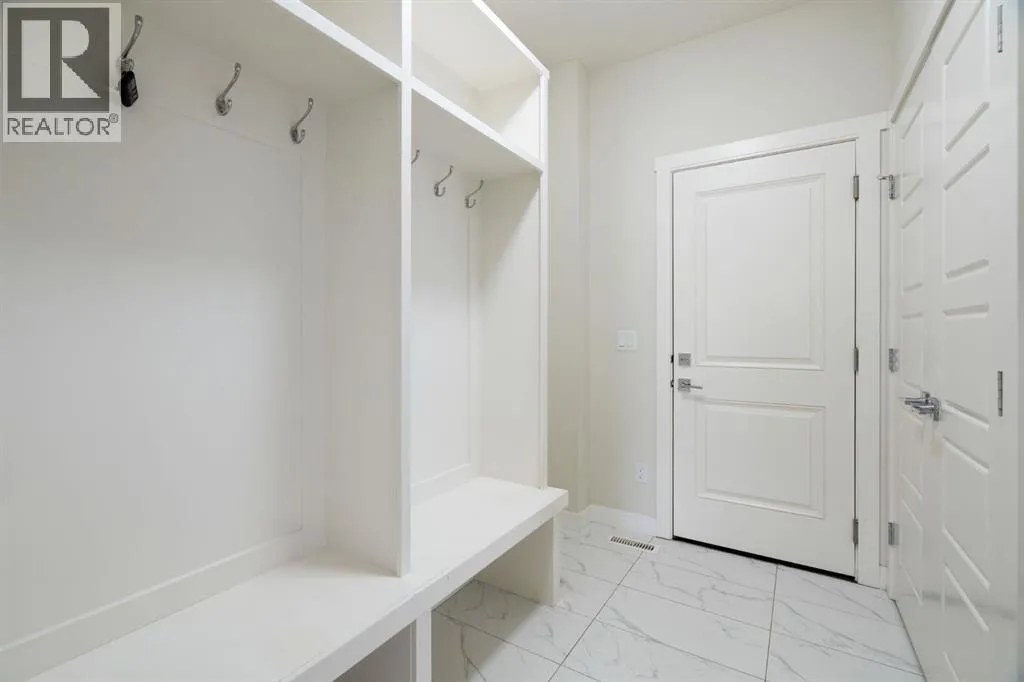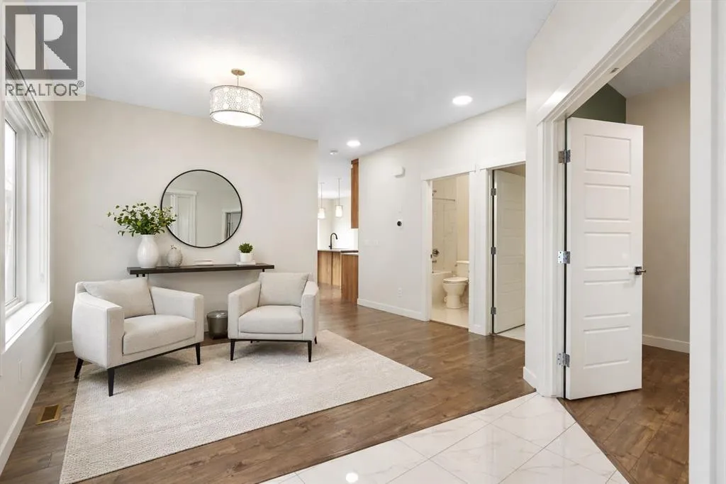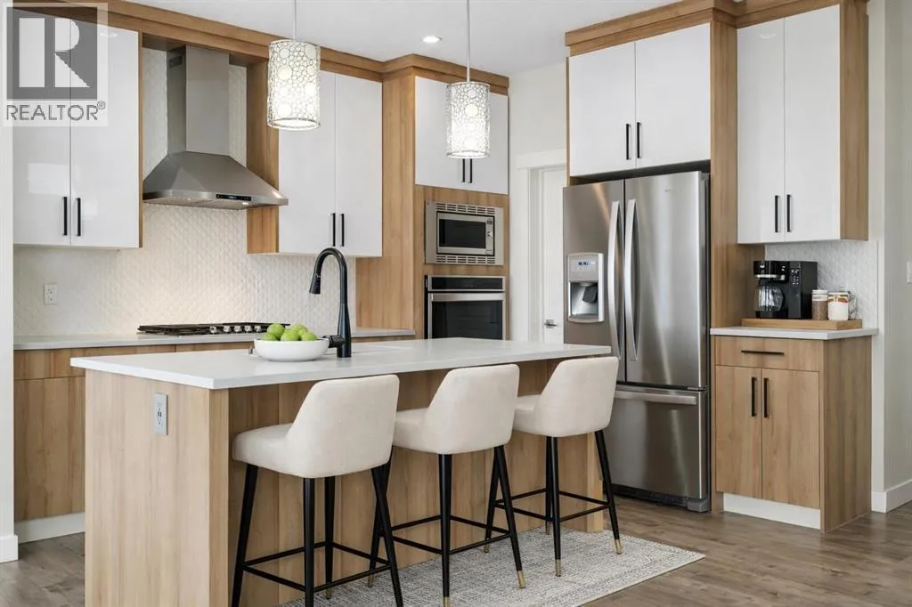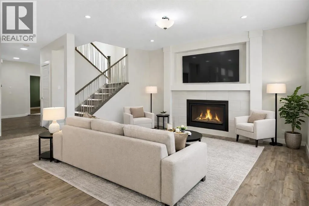 who need both function and flexibility.The main floor makes an immediate impression with a welcoming foyer and built-in sitting area. A main floor bedroom and full bathroom provide excellent versatility for guests, multi-generational living, or a dedicated home office. Everyday convenience is elevated with a mudroom featuring custom lockers and a walk-through pantry with MDF shelving, seamlessly connecting to the kitchen. The double attached garage ensures ample space for vehicles, storage, and all your gear.At the heart of the home, the kitchen is both stylish and highly functional, featuring a gas cooktop, chimney-style hood fan, wall-mount oven, quartz countertops, and a geometric tile backsplash. The design is completed with Scandinavian-inspired flat-panel cabinetry accented with warm wood tones and modern pendant lighting over the island. The adjacent living room is anchored by a gas fireplace, while the dining area leads directly to a rear deck with a gas line, perfect for outdoor entertaining. The fully landscaped and fenced yard backs directly onto trees, offering both privacy and a peaceful view.Upstairs, four generously sized bedrooms provide comfortable space for every family member. The bonus room showcases a stunning tray ceiling, and wrought iron railings enhance the open feel while allowing natural light to flow through. Both the bonus room and the primary bedroom overlook the treed reserve, adding to the home’s serene setting.The primary suite is a true retreat, featuring a tray ceiling, walk-through closet with built-in MDF shelving, and a spa-inspired ensuite complete with dual sinks, a standalone soaker tub, and a custom tile shower with both rain and handheld showerheads enclosed in full-height 10-mil glass. One of the secondary bedrooms includes its own private ensuite with a deep tub and tile surround, while the main bathroom also features a deep soaker tub with tile shower.A dedicated upper laundry room adds convenience with a sink, cabinetry, and top-loading washer.The walkout basement offers incredible future potential with its separate entrance, rough-in plumbing, and bright open layout, making it ideal for a future legal suite (subject to City approval), multi-generational living, or additional family space.Additional highlights include central air conditioning, Gemstone exterior lighting, professional cleaning throughout, and true move-in ready condition.This is a home designed not just for today—but for the way your family grows into the future. (id:62650)
