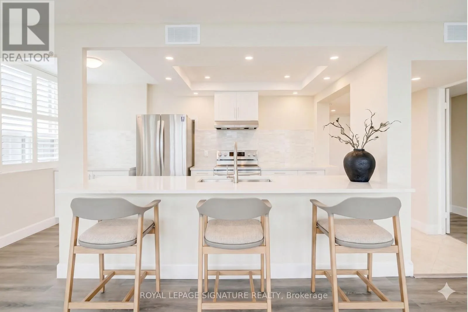 Experience open concept living at 120 Duke Street, where this meticulously redesigned corner unit has been transformed from a traditional three bedroom into an expansive, light-filled two-bedroom sanctuary. The heart of the home is a stunning chef’s kitchen featuring new cabinetry, marble backsplashes, and five premium appliances, seamlessly integrated into a massive living area defined by smooth ceilings, designer pot
