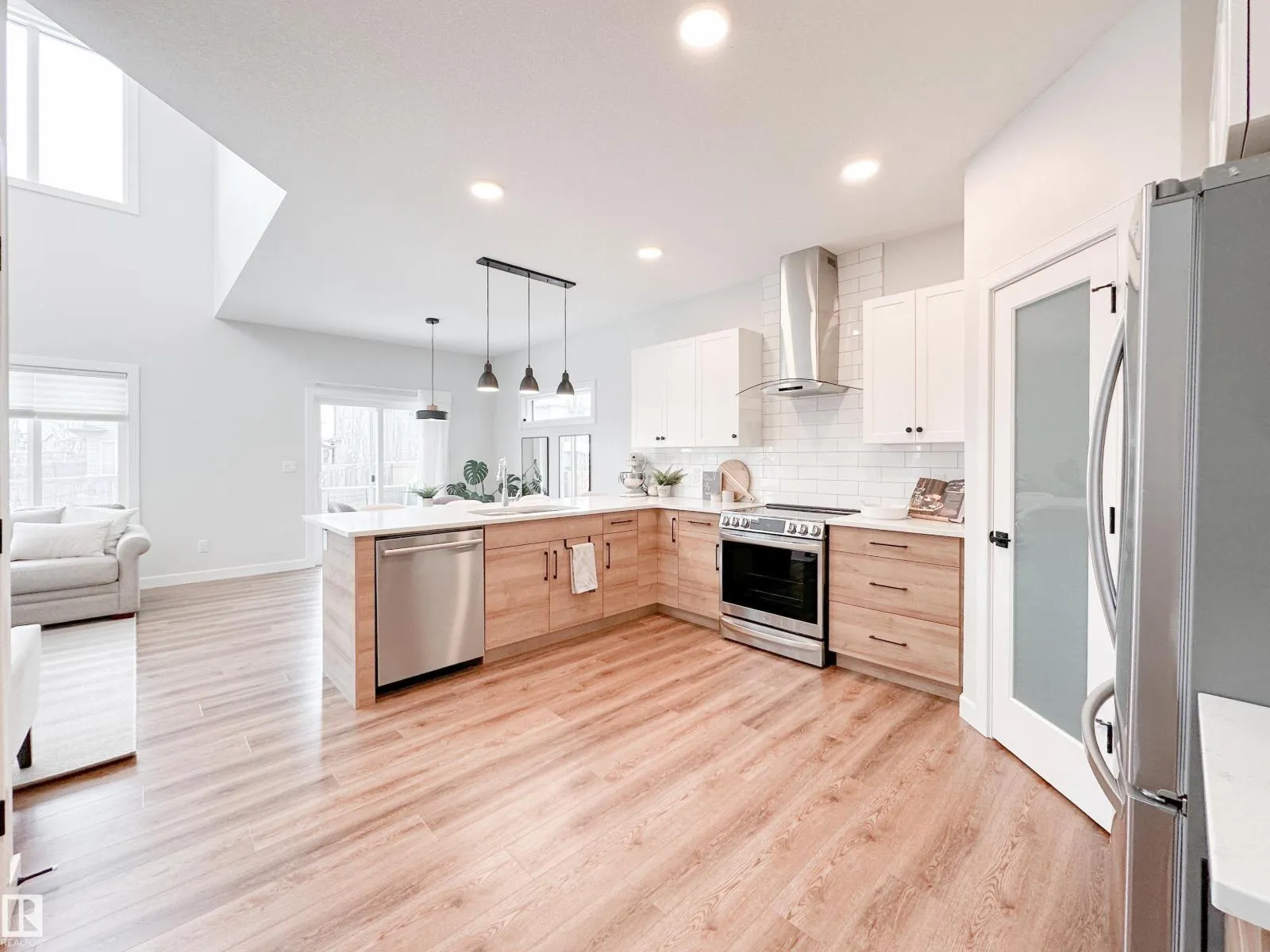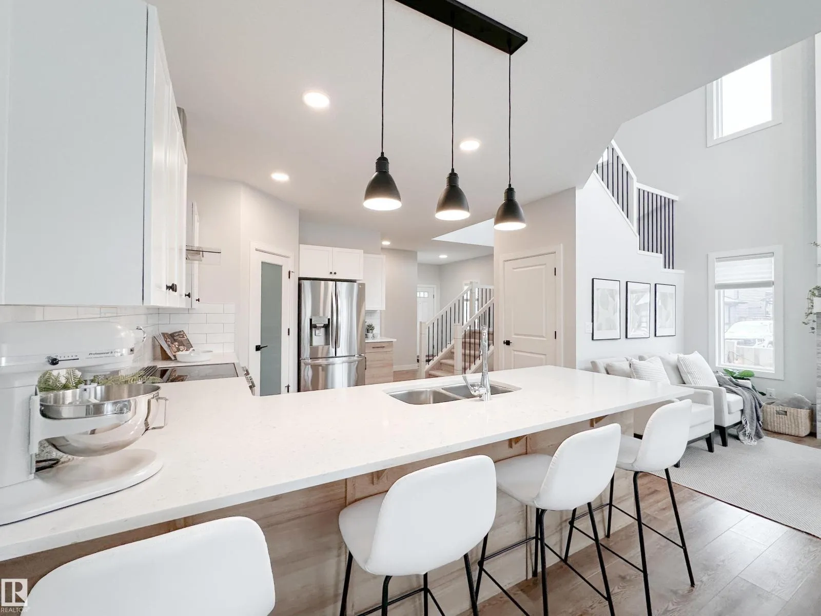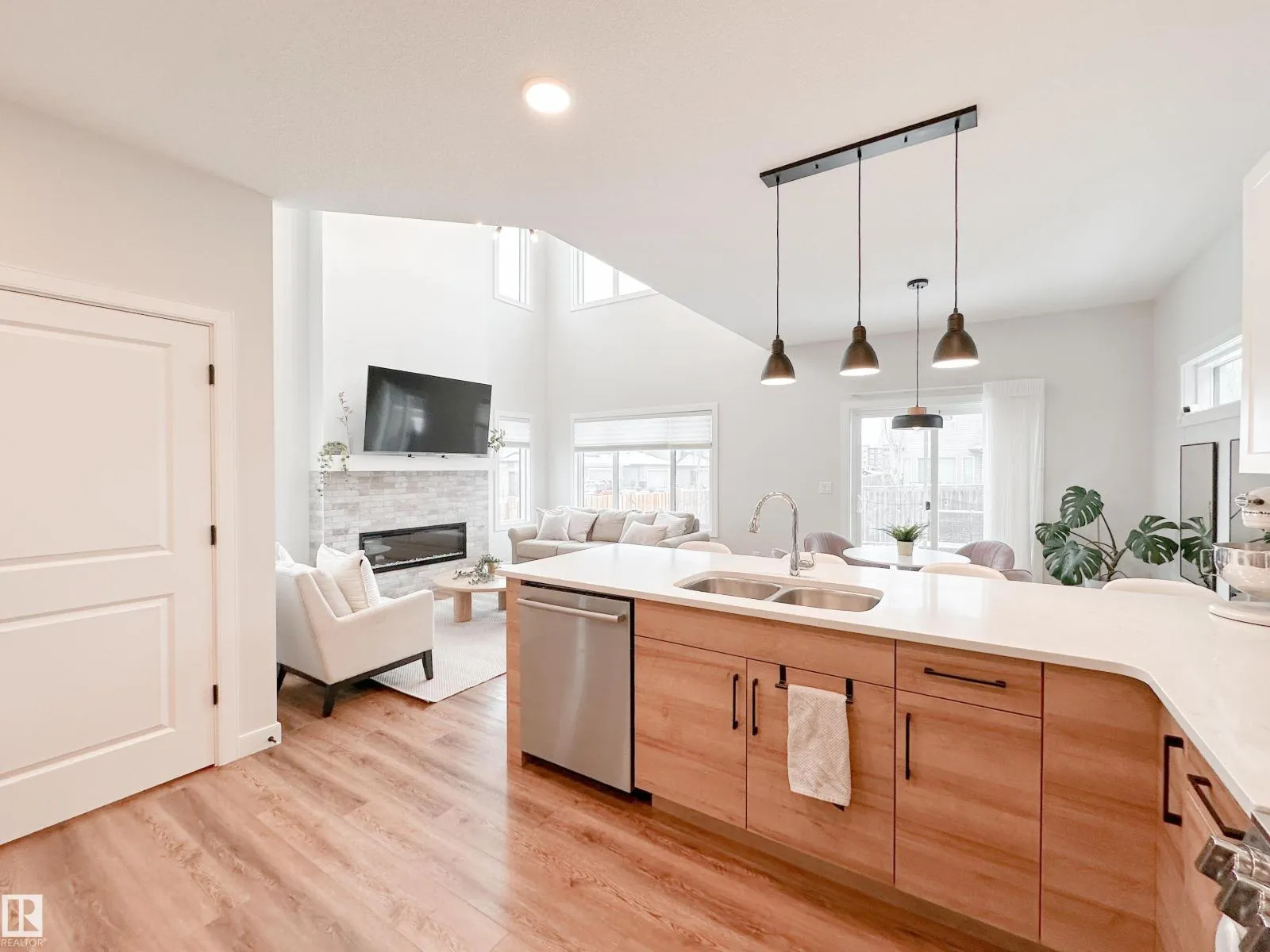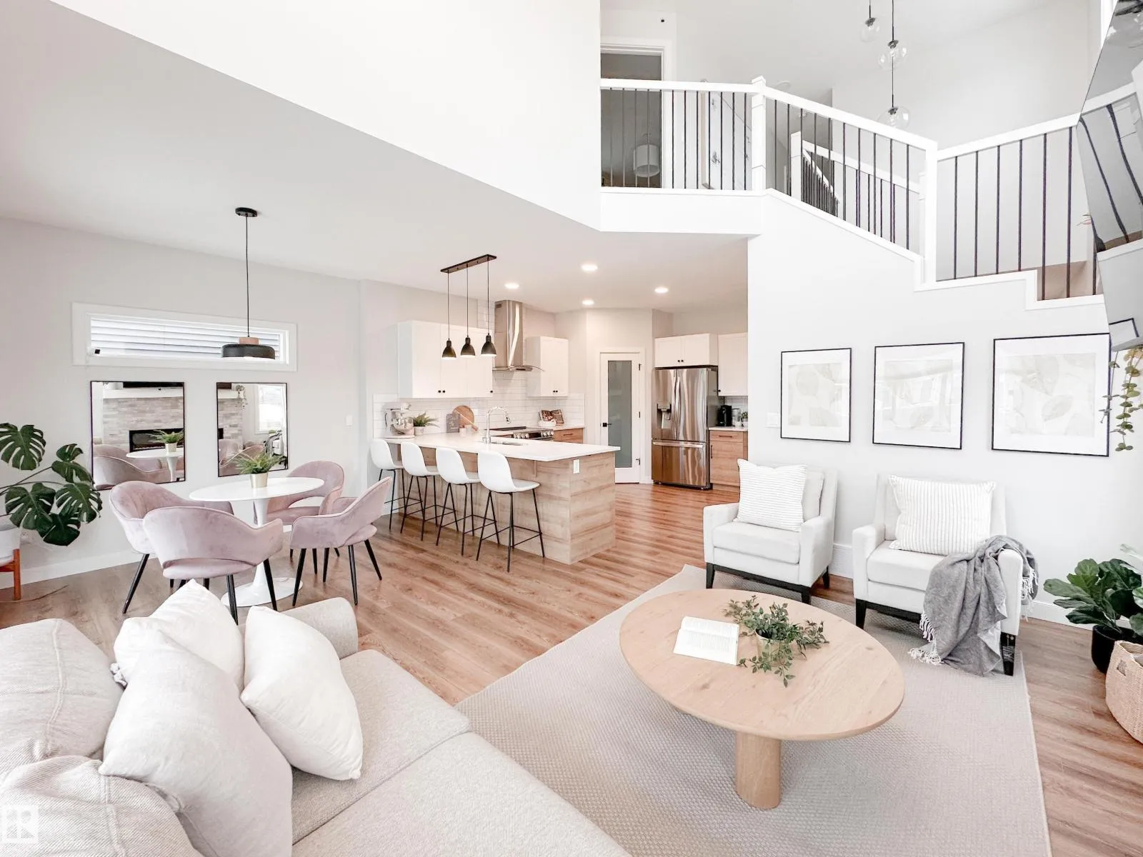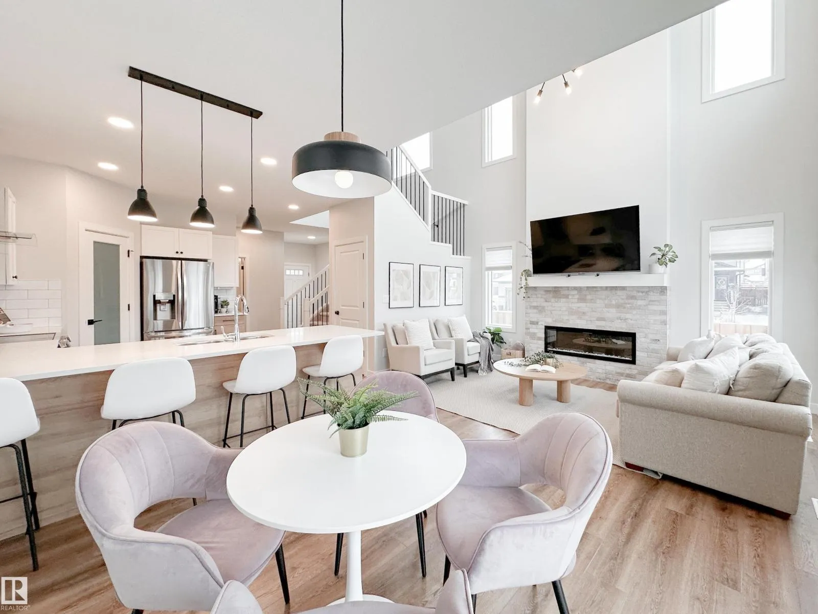 Discover refined living in this elegant 2-storey home, thoughtfully designed w/ a bright open-concept layout & soaring open-to-above living room. Expansive windows bathe the space in natural light, while an electric fireplace adds warmth and sophistication. The designer kitchen showcases white quartz countertops, a sleek tile backsplash, premium stainless steel appliances & a walk-through pantry for added convenience. The adjoining