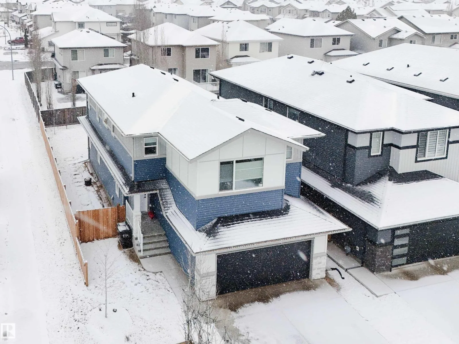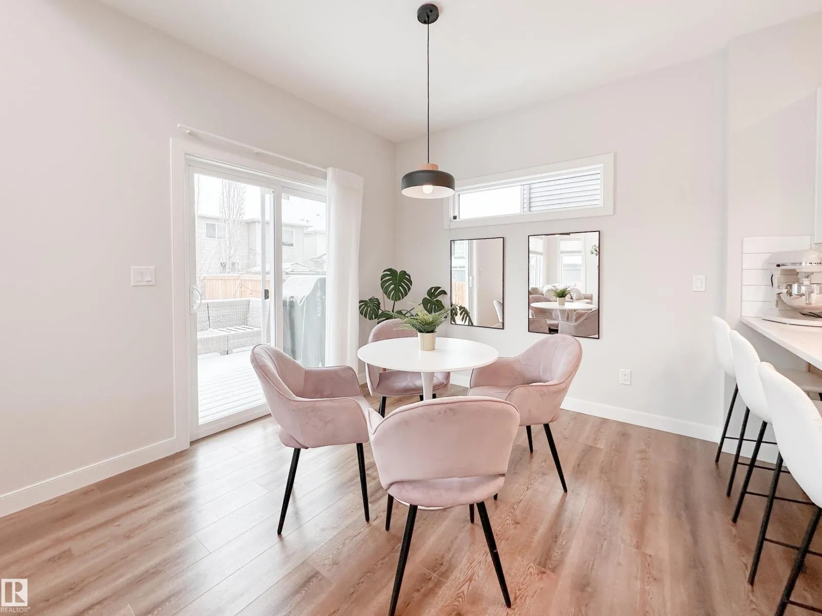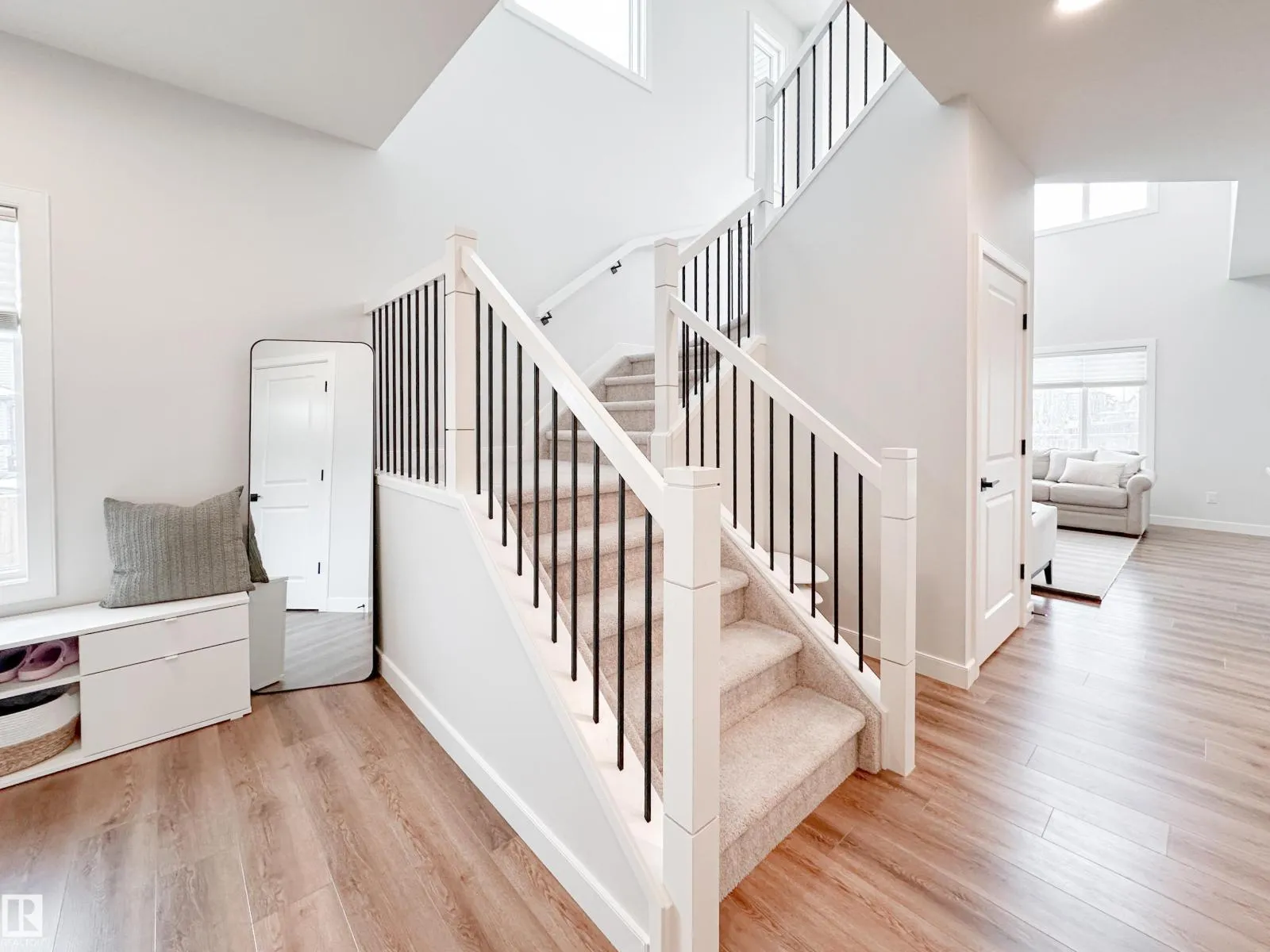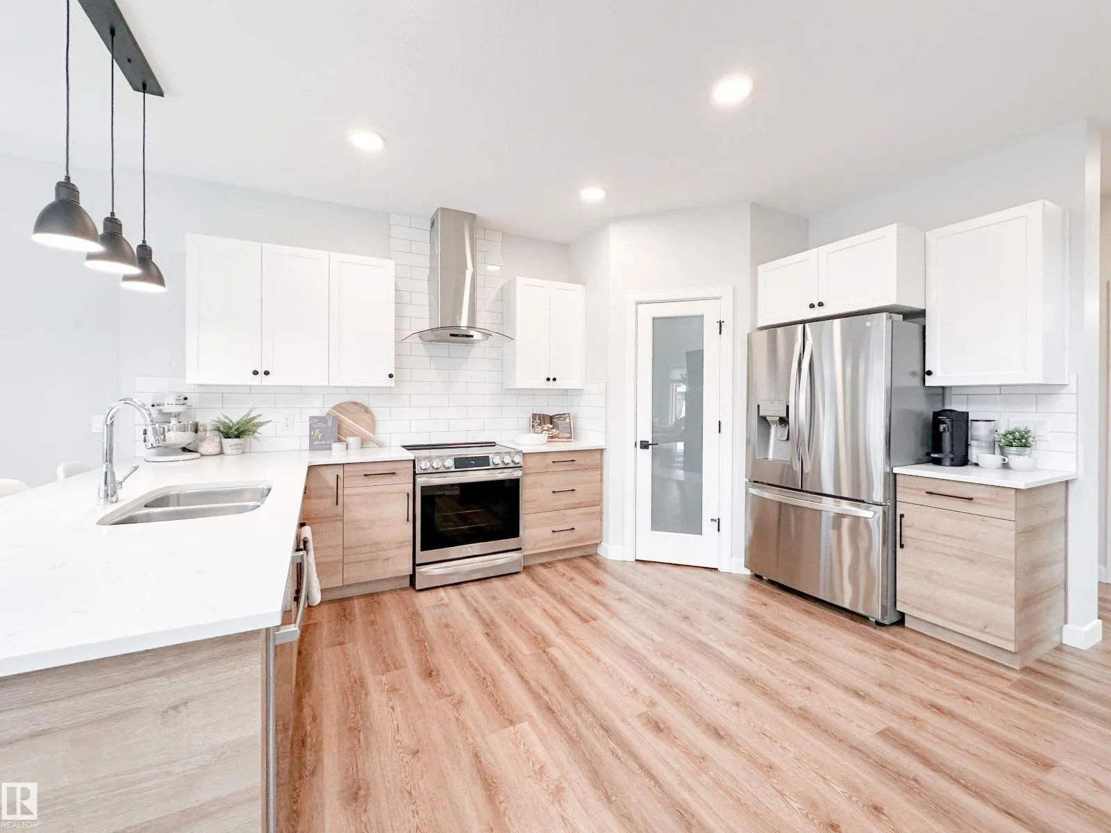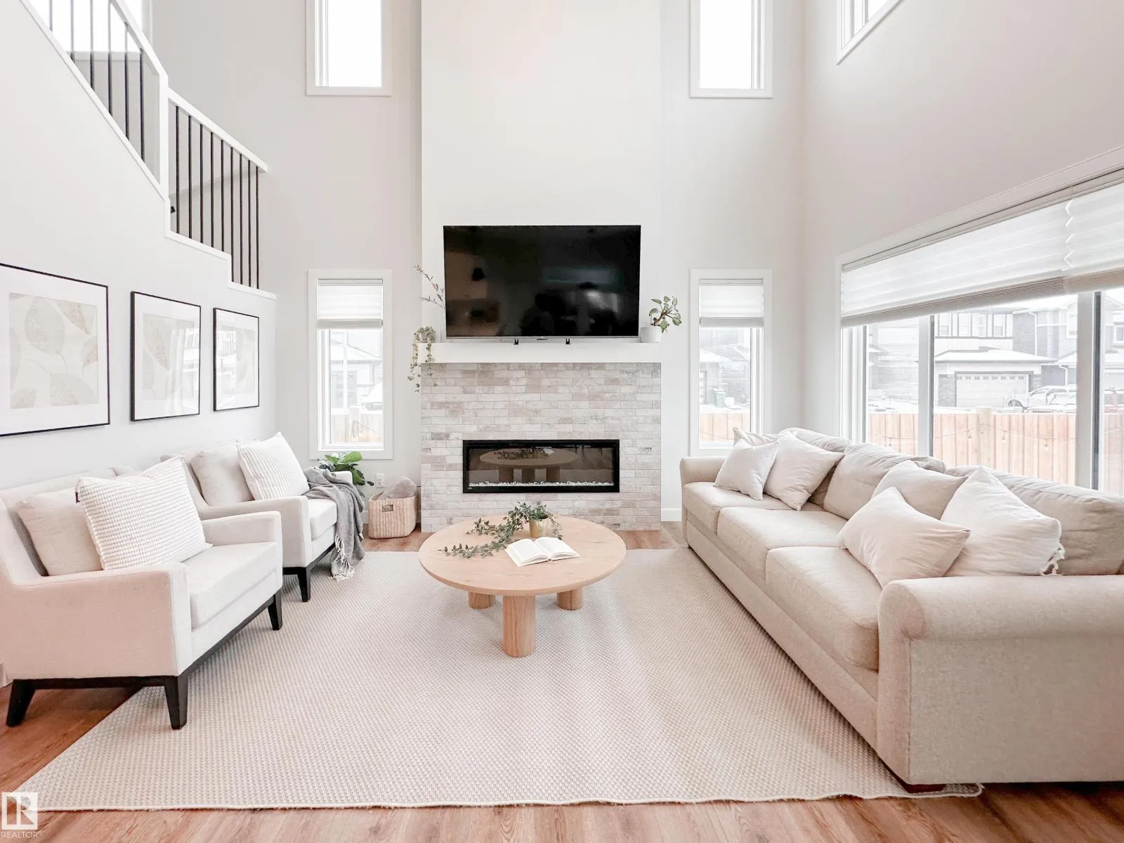 Discover refined living in this elegant 2-storey home, thoughtfully designed w/ a bright open-concept layout & soaring open-to-above living room. Expansive windows bathe the space in natural light, while an electric fireplace adds warmth and sophistication. The designer kitchen showcases white quartz countertops, a sleek tile backsplash, premium stainless steel appliances & a walk-through pantry for added convenience. The adjoining