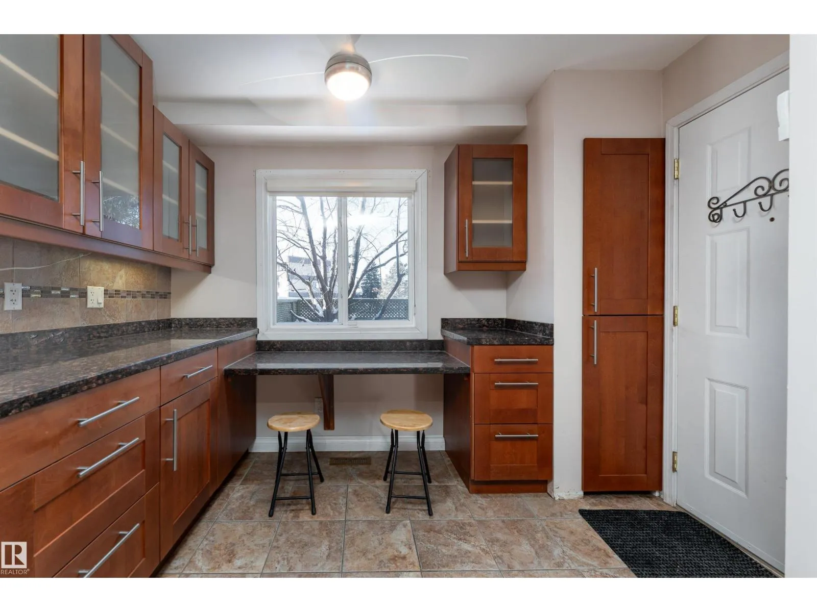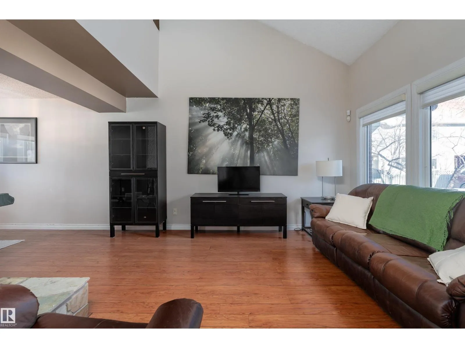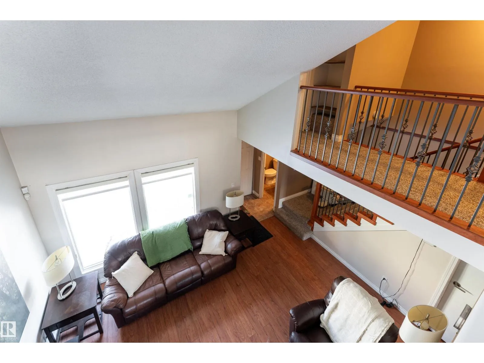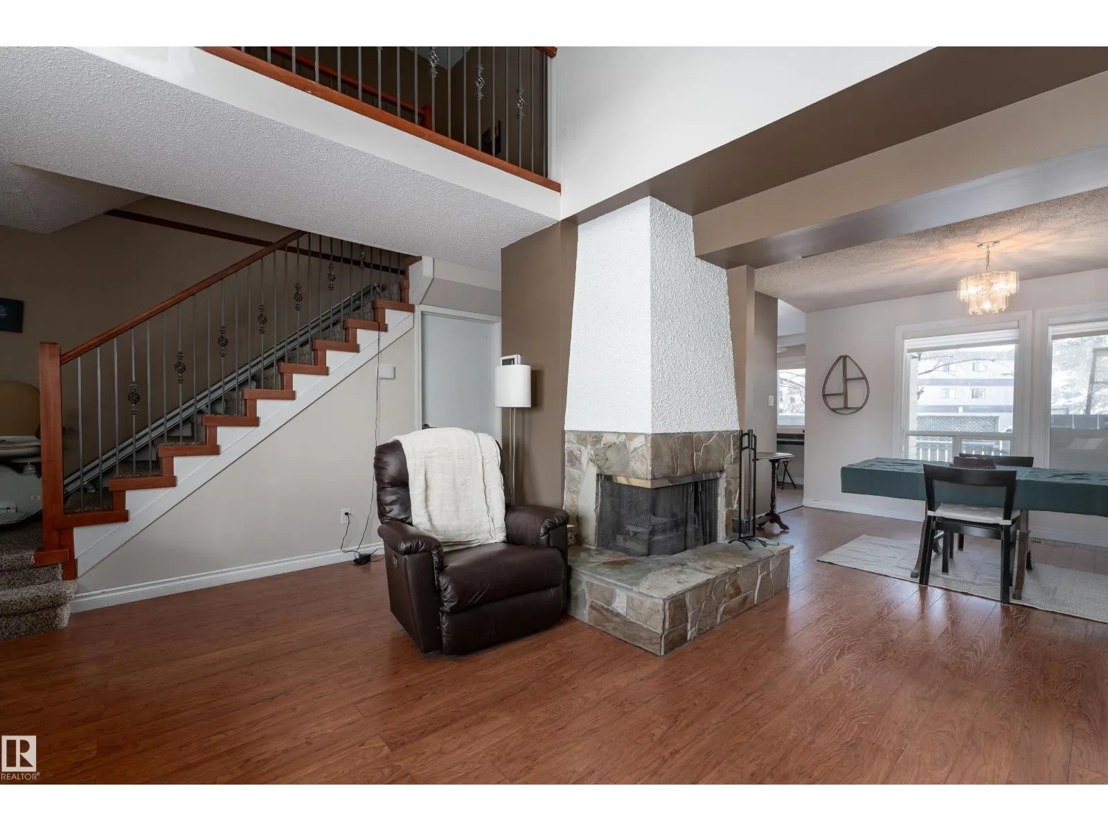 Stop searching and start packing because this uniquely designed 1,222 sq. ft. Hillview Crescent gem is the one you’ve been waiting for! The main floor features a grand living room with high vaulted ceilings and a cozy stone-surround wood fireplace. The modern kitchen is a dream. Designed with warm wood cabinetry, beautiful tile backsplash, dark counters, and a bright breakfast