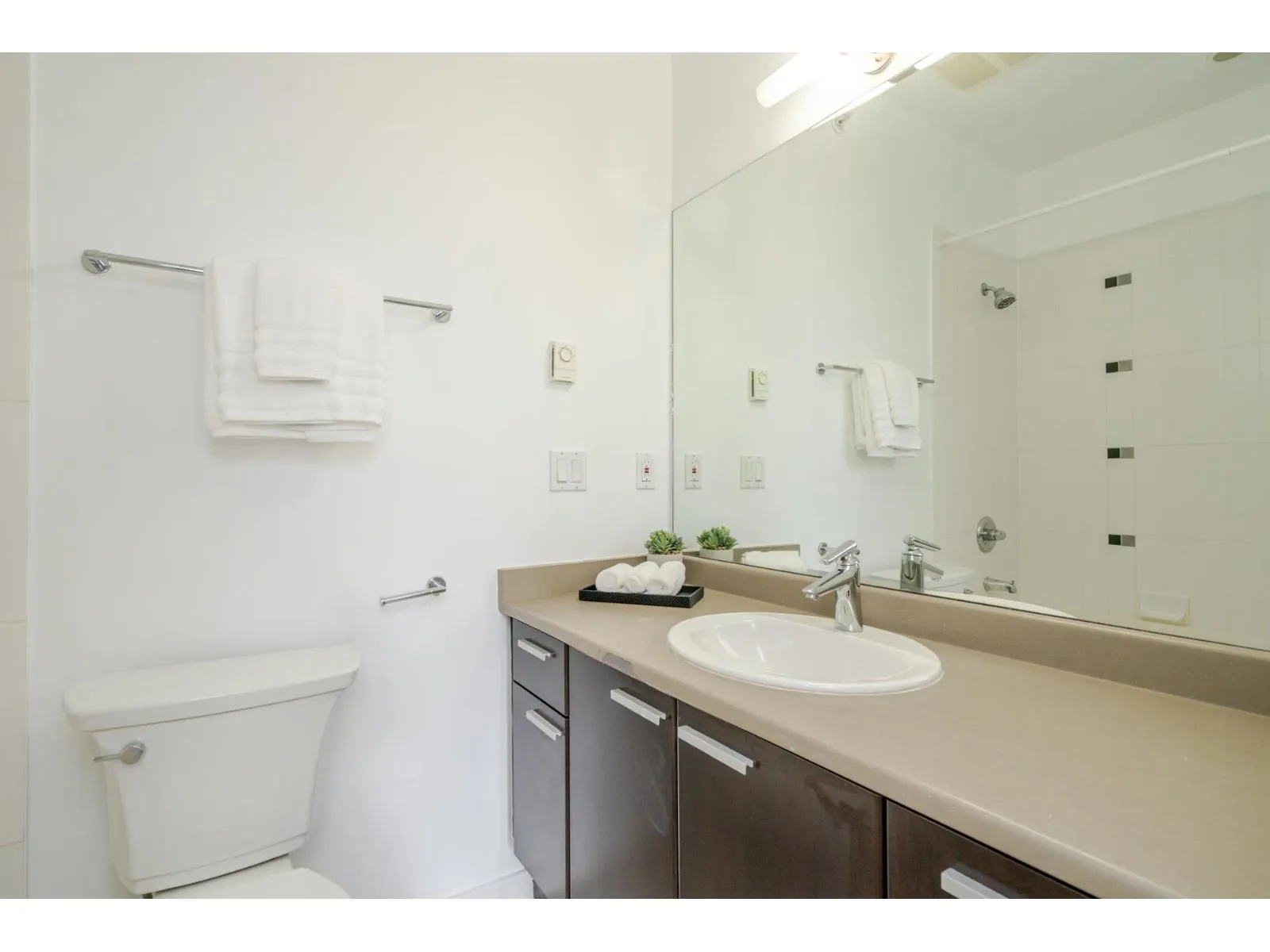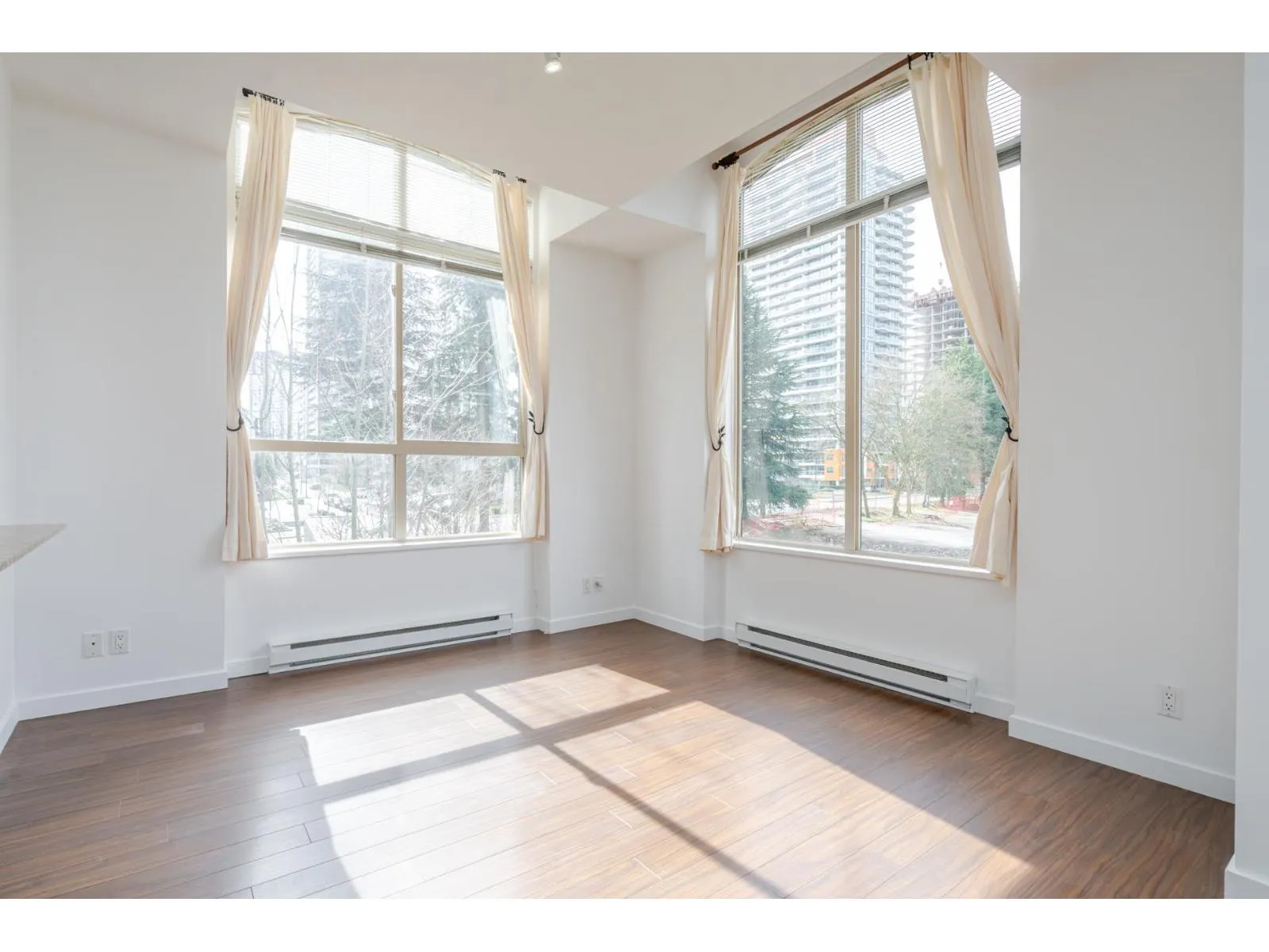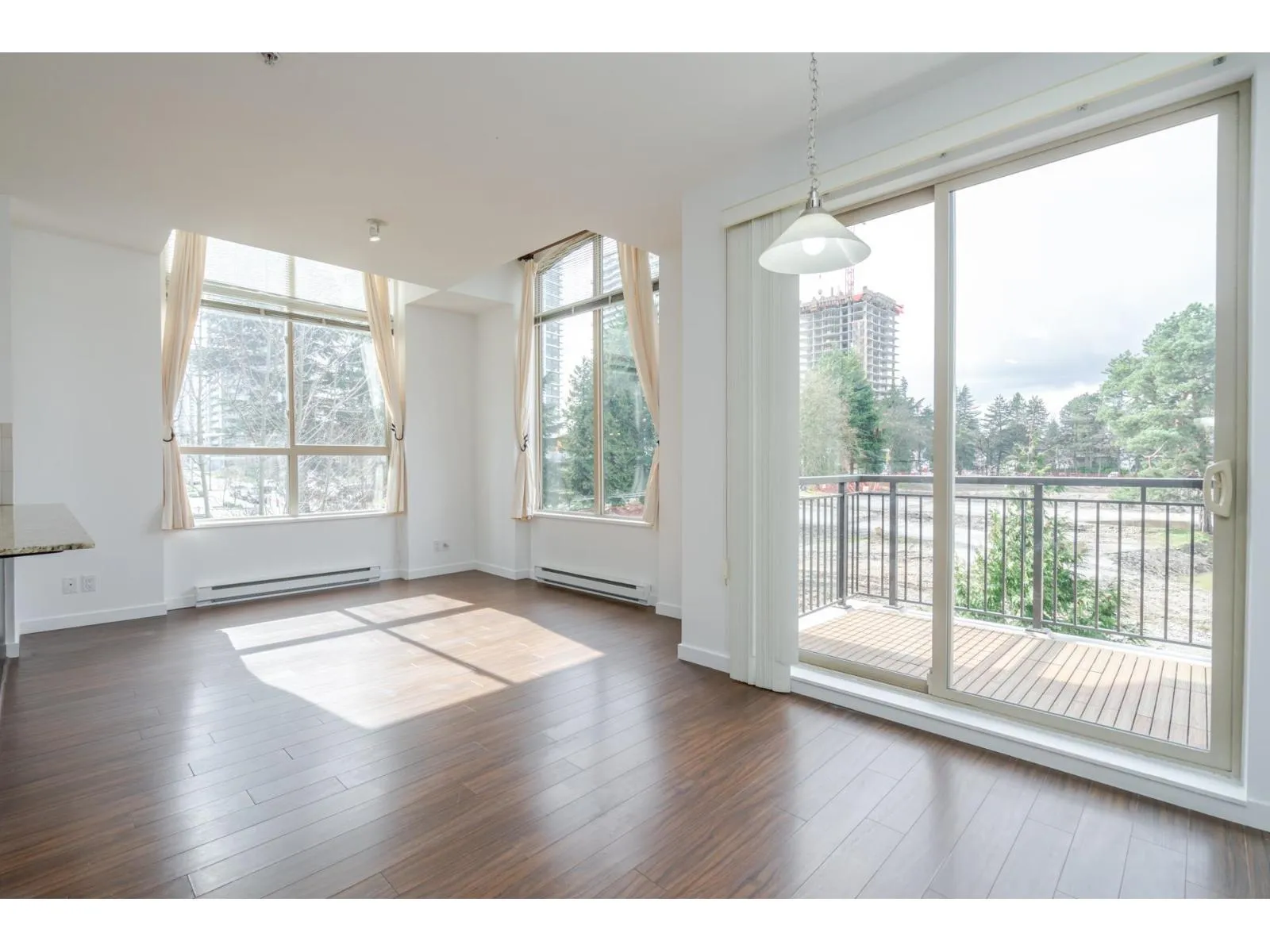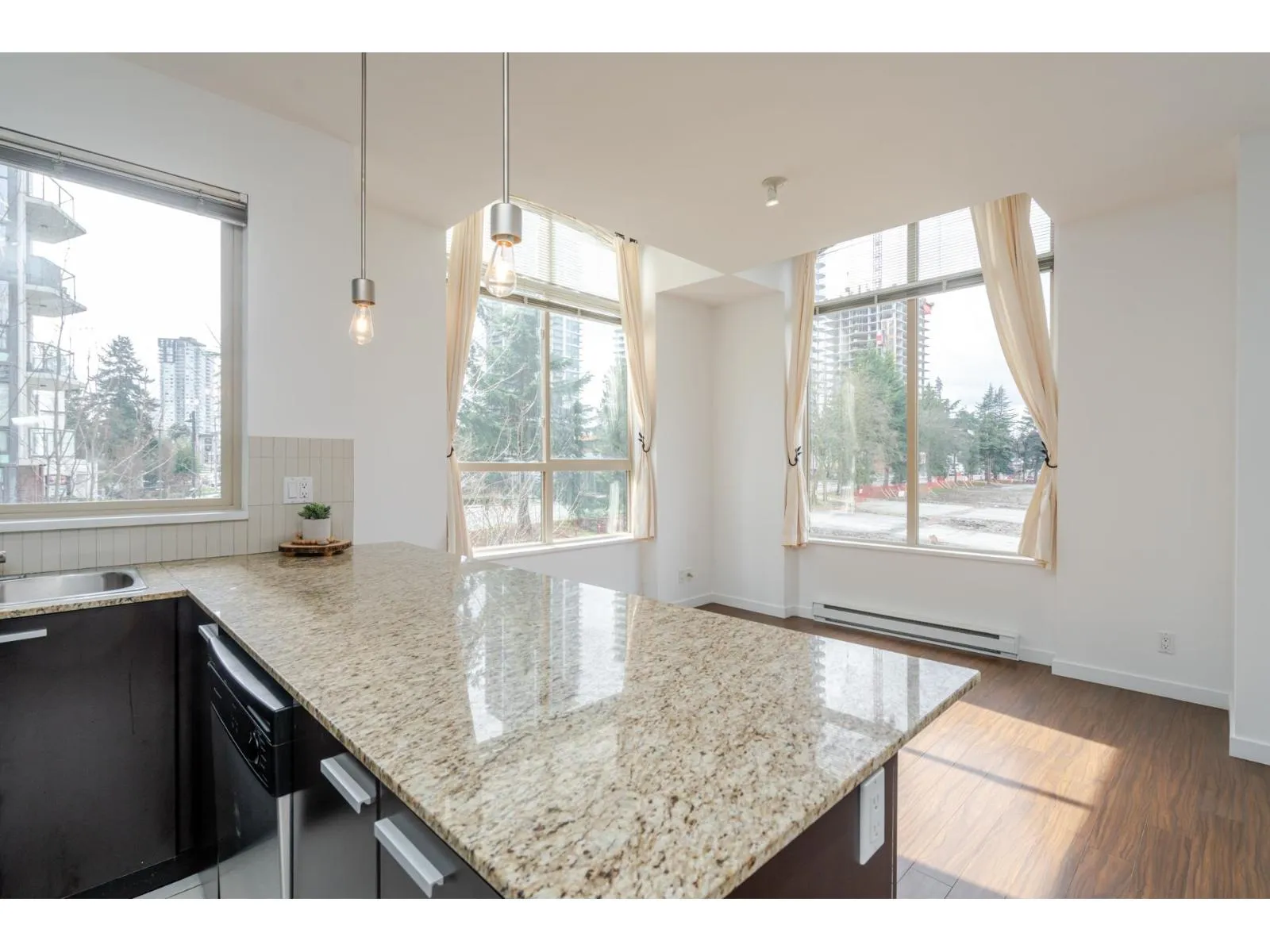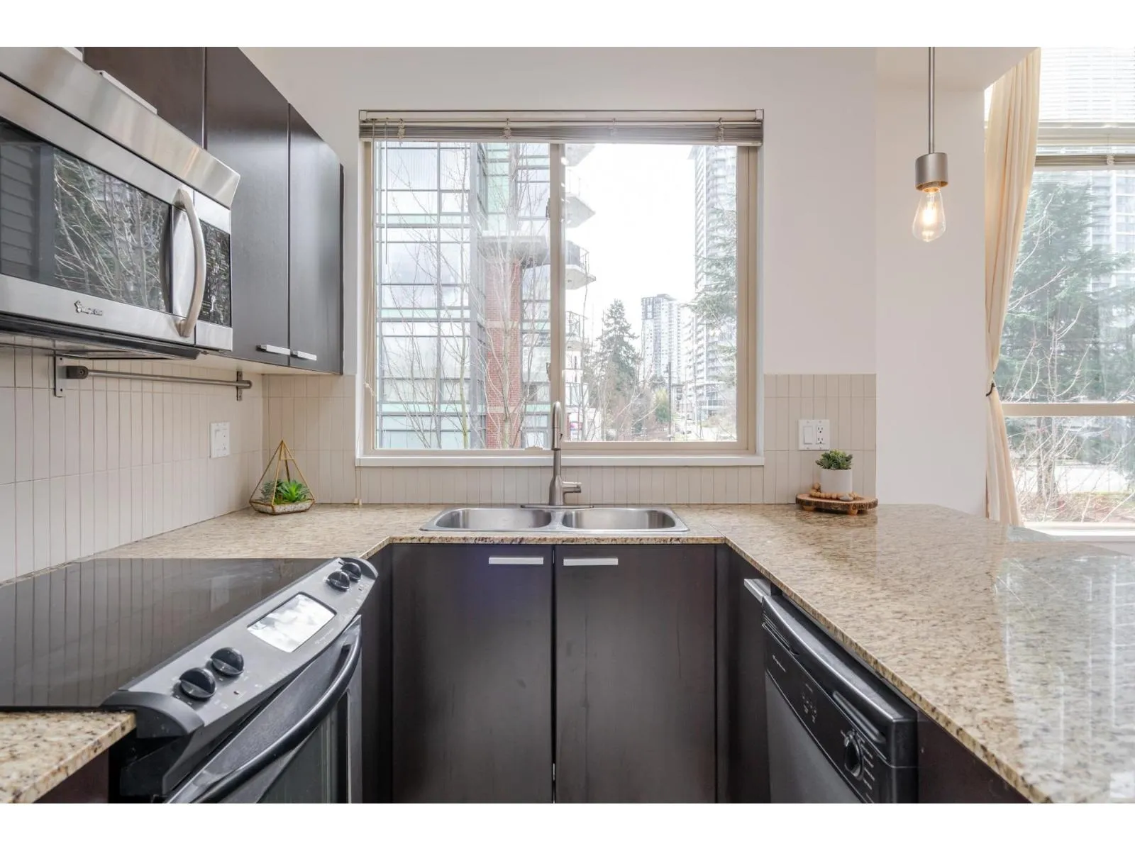 Welcome to D’Cor in the heart of Surrey Central! This 880 sqft bright, top floor, corner unit offers 2 bedrooms and 2 bathrooms both with their own ensuite and thoughtfully positioned on opposite sides of the home for added privacy. The open concept living area features high ceilings, spacious peninsula kitchen with granite countertops, stainless steel appliances, laminate flooring and
