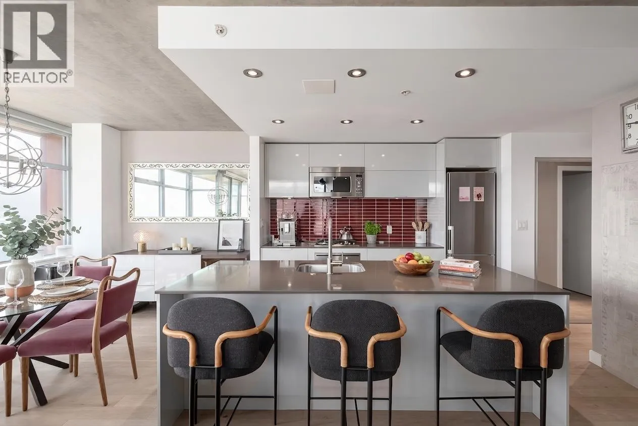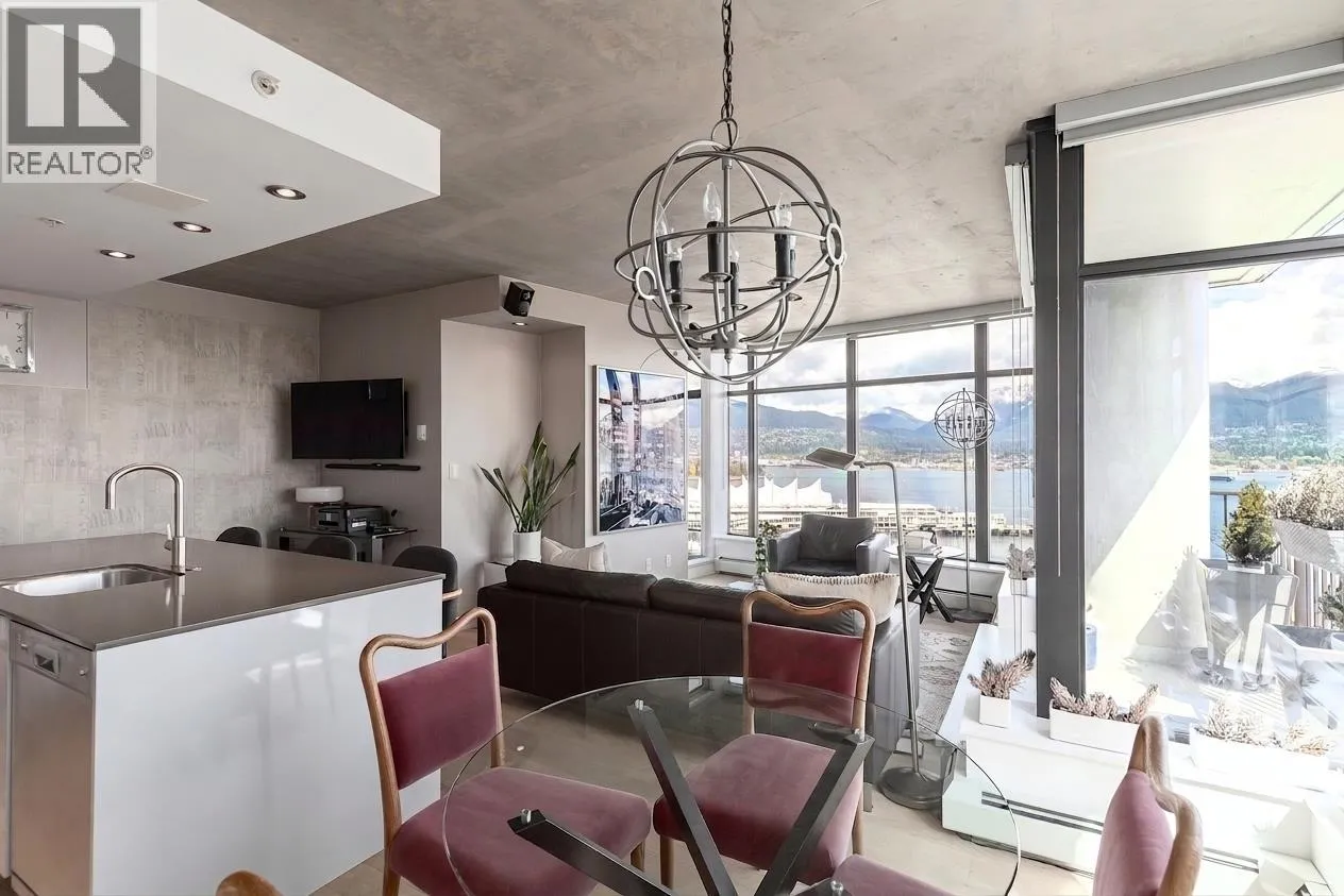 Experience elevated urban living in this bright northeast CORNER 2 bed, 2 bath residence at the iconic Woodwards. Flooded with natural light and showcasing stunning water, mountain and North Shore views, this thoughtfully updated home features new flooring, modern lighting, and refreshed countertops throughout. Both bedrooms offer excellent separation and include custom closet organizers for optimal storage.The open-concept layout is