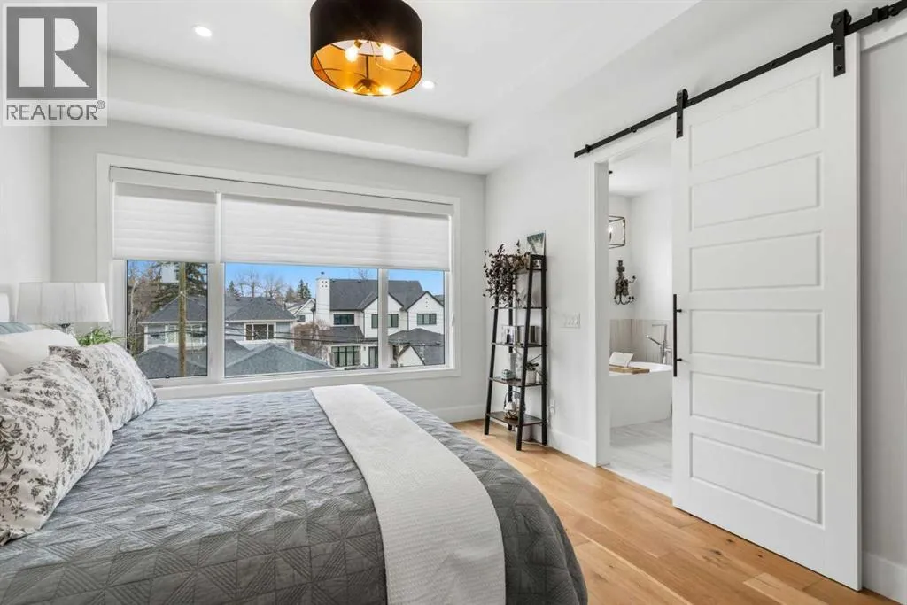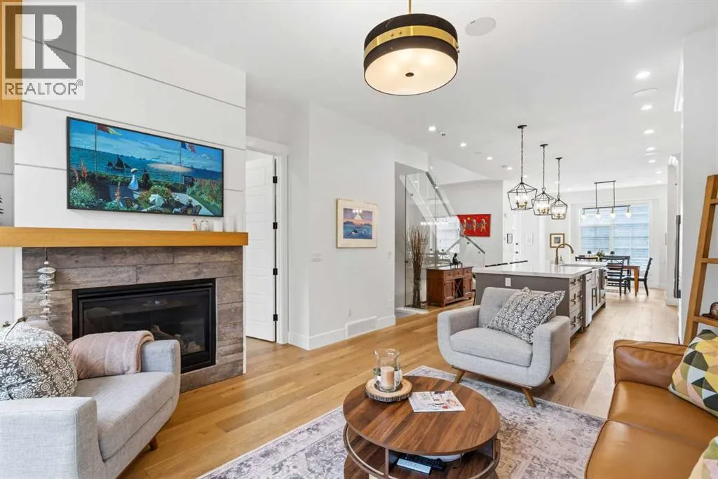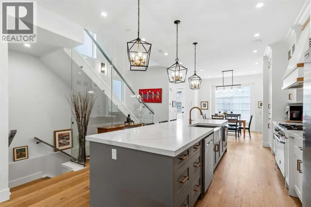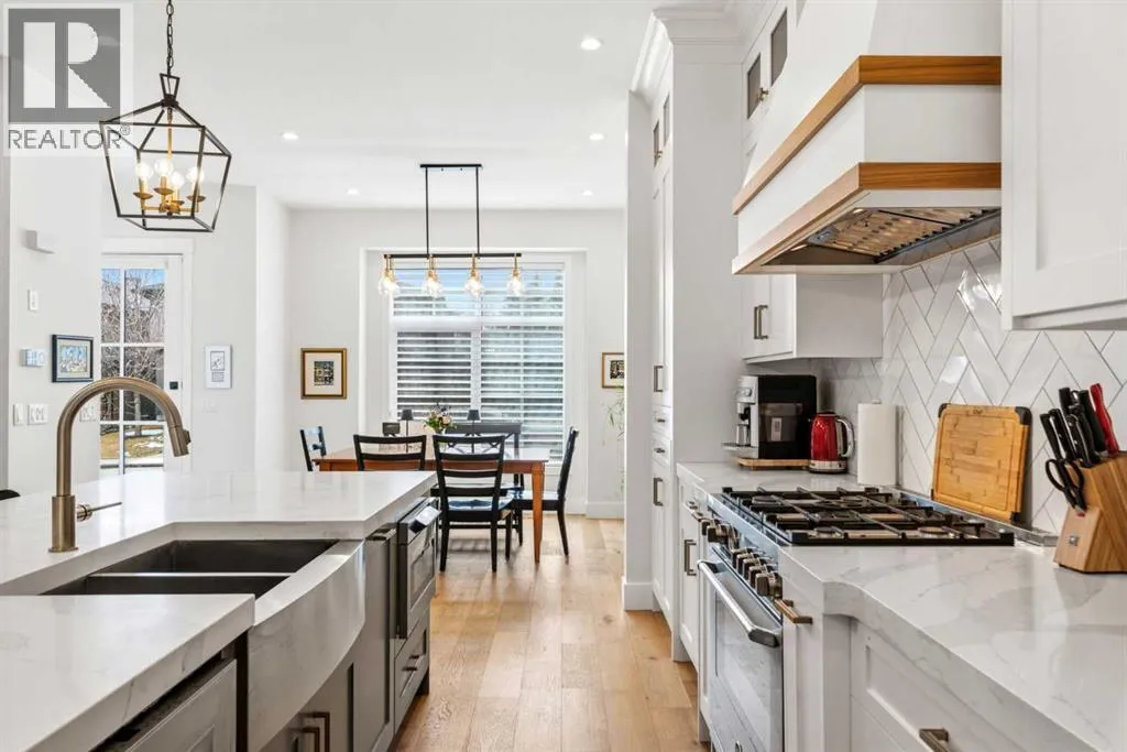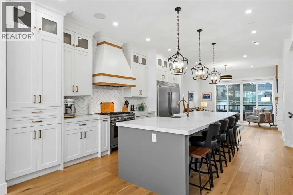enhance the sense of openness & grandeur. Expansive windows flood the open concept main floor with natural light, illuminating a front dining area adorned with a detailed feature wall that flows effortlessly into the chef-inspired kitchen. The kitchen is designed for both everyday living & elegant entertaining & features custom, full height white cabinetry, subway tile backsplash, quartz countertops, a massive two-toned island with an eating bar & premium appliances, including a Bertazzoni gas range, dual full-sized fridge & freezer & drawer style microwave. The inviting living room offers a warm refined atmosphere, with a modern gas fireplace & custom built-ins. Large patio doors open to an expansive rear deck with a Suncoast enclosure featuring a motorized louvre roof and retractable screens – offering all-season outdoor living with adjustable sun, shade, and airflow. The mudroom with custom built-ins & a stylish powder room complete the main level. A dramatic architectural staircase with extra wide wood treads & sleek glass walls leads to the upper floor. The primary suite showcases a tray ceiling and a spacious walk-in closet. A sliding barn door leads to the spa-inspired ensuite, which offers in-floor heating, dual vanities, a freestanding soaker tub, an oversized glass-enclosed shower & a private water closet, delivering a serene experience. Two additional bedrooms, one with a walk-in closet, share a beautiful bathroom, while a dedicated laundry room with cabinetry & sink ensures everyday convenience. The fully finished basement is designed for both relaxation & entertaining, featuring in floor heating, a generous family room, a designer wet bar complete with open shelving, upper & lower cabinetry, & beverage fridge area, plus a fourth bedroom with a large walk-in closet & full bathroom. Enjoy seamless outdoor living with a private front patio, perfect for summer evenings & entertaining. Features include central air conditioning, in-ceiling speakers, custom blinds with blackout in the upstairs bedrooms, plus a fully insulated, drywalled, heated double detached garage with a paved lane. Perfectly positioned in one of Calgary’s most sought-after communities, this residence offers an unmatched lifestyle with exceptional walkability. Enjoy being just moments from River Park, Sandy Beach Park, Monogram Coffee, the vibrant shops, restaurants & cafes of Marda Loop. Quick access to Crowchild, Glenmore & Stoney Trail. This is a meticulously crafted home that delivers sophistication, comfort, and distinction at every turn. (id:62650)