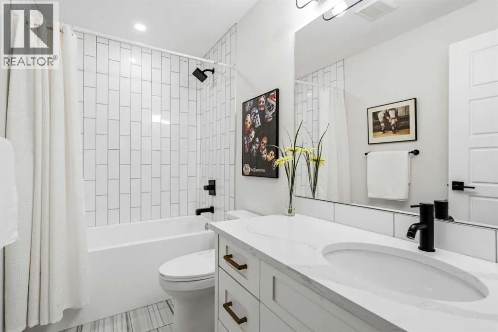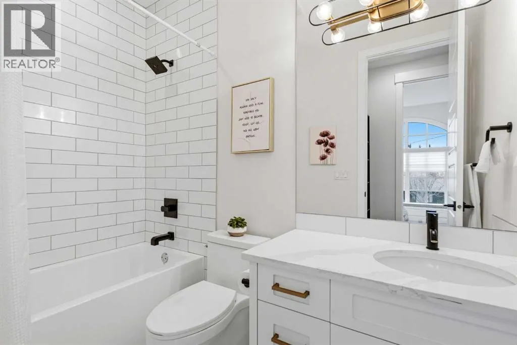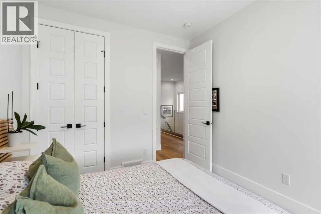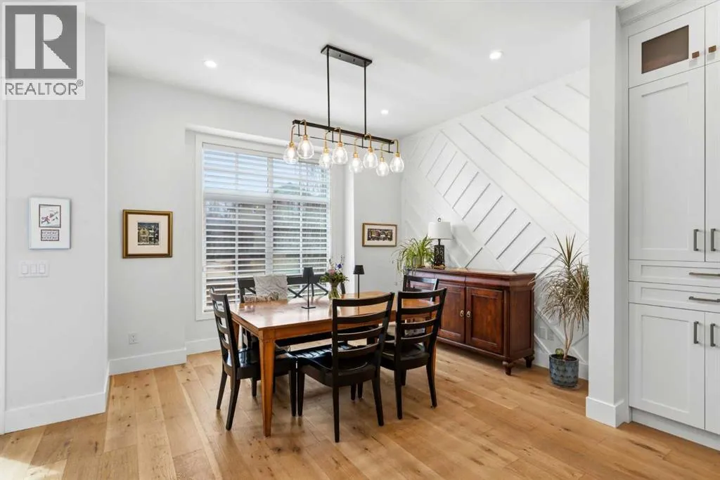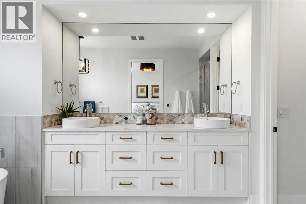 enhance the sense of openness & grandeur. Expansive windows flood the open concept main floor with natural light, illuminating a front dining area adorned with a detailed feature wall that flows effortlessly into the chef-inspired kitchen. The kitchen is designed for both everyday living & elegant entertaining & features custom, full height white cabinetry, subway tile backsplash, quartz countertops, a massive two-toned island with an eating bar & premium appliances, including a Bertazzoni gas range, dual full-sized fridge & freezer & drawer style microwave. The inviting living room offers a warm refined atmosphere, with a modern gas fireplace & custom built-ins. Large patio doors open to an expansive rear deck with a Suncoast enclosure featuring a motorized louvre roof and retractable screens – offering all-season outdoor living with adjustable sun, shade, and airflow. The mudroom with custom built-ins & a stylish powder room complete the main level. A dramatic architectural staircase with extra wide wood treads & sleek glass walls leads to the upper floor. The primary suite showcases a tray ceiling and a spacious walk-in closet. A sliding barn door leads to the spa-inspired ensuite, which offers in-floor heating, dual vanities, a freestanding soaker tub, an oversized glass-enclosed shower & a private water closet, delivering a serene experience. Two additional bedrooms, one with a walk-in closet, share a beautiful bathroom, while a dedicated laundry room with cabinetry & sink ensures everyday convenience. The fully finished basement is designed for both relaxation & entertaining, featuring in floor heating, a generous family room, a designer wet bar complete with open shelving, upper & lower cabinetry, & beverage fridge area, plus a fourth bedroom with a large walk-in closet & full bathroom. Enjoy seamless outdoor living with a private front patio, perfect for summer evenings & entertaining. Features include central air conditioning, in-ceiling speakers, custom blinds with blackout in the upstairs bedrooms, plus a fully insulated, drywalled, heated double detached garage with a paved lane. Perfectly positioned in one of Calgary’s most sought-after communities, this residence offers an unmatched lifestyle with exceptional walkability. Enjoy being just moments from River Park, Sandy Beach Park, Monogram Coffee, the vibrant shops, restaurants & cafes of Marda Loop. Quick access to Crowchild, Glenmore & Stoney Trail. This is a meticulously crafted home that delivers sophistication, comfort, and distinction at every turn. (id:62650)