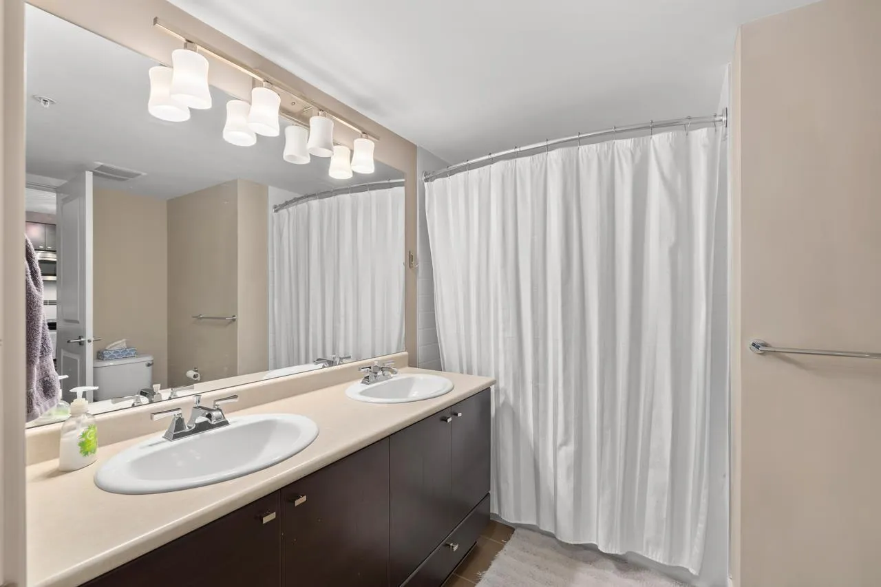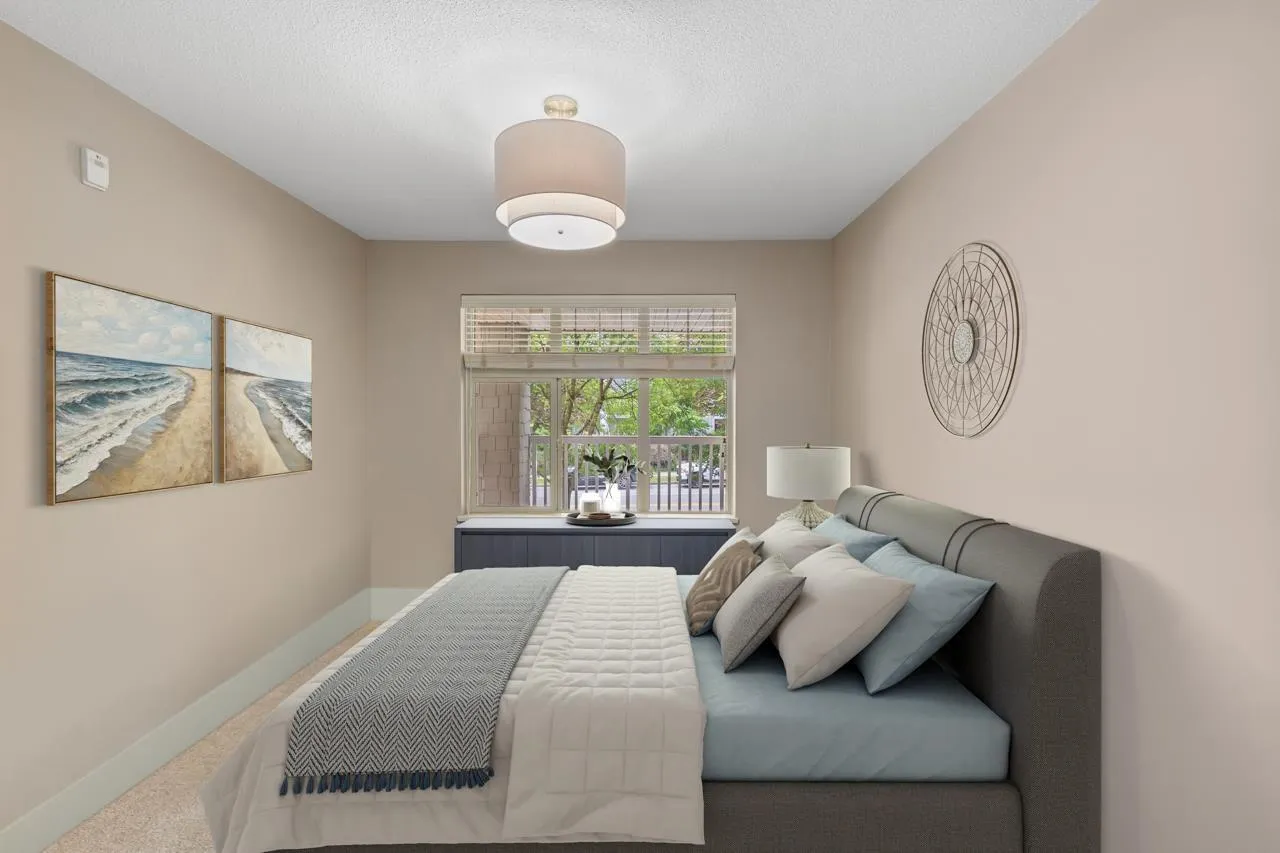 This bright and beautifully kept 1bed&bath condo in Sunset Grove features a spacious open layout with large windows, stainless appliances, updated kitch &foyer flooring, cozy gas fireplace & bathroom w/ heated floors, double sinks, large soaker tub & bathroom fan timer. Enjoy in-suite laundry, 1parking, 1storage & generous balcony surrounded by greenery. The well-maintained complex offers a party room, bike