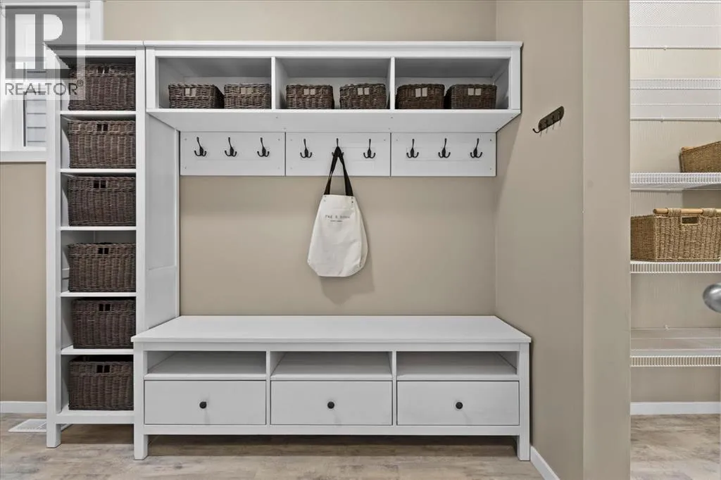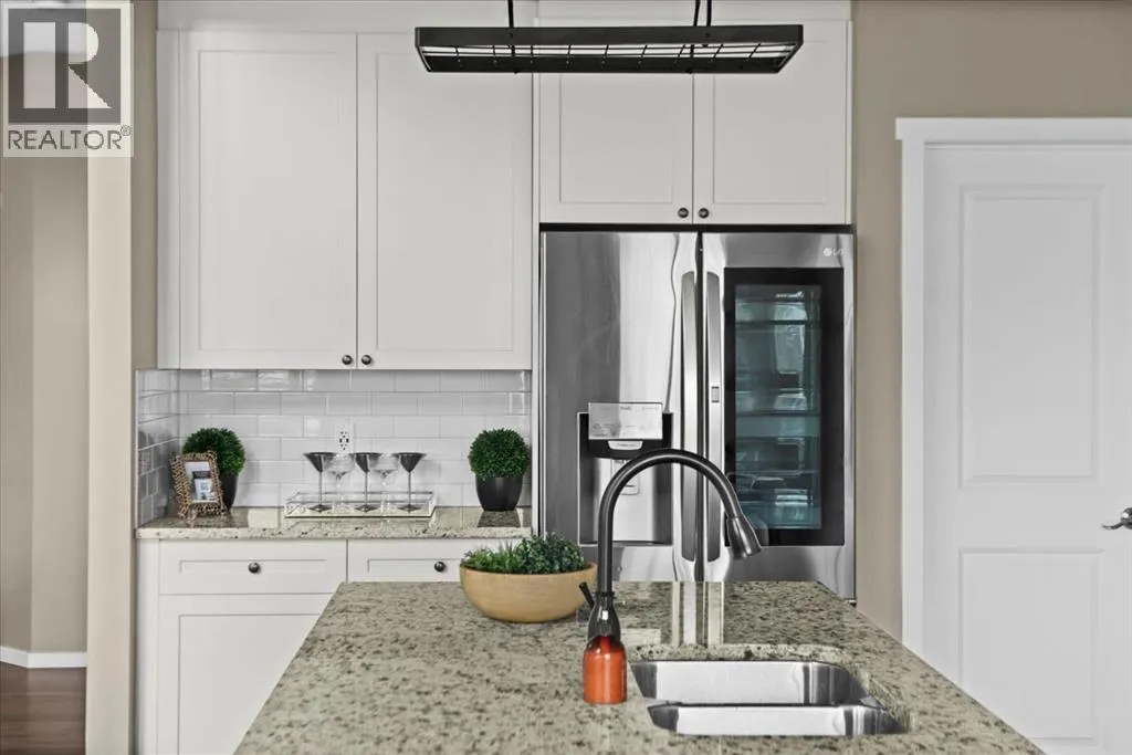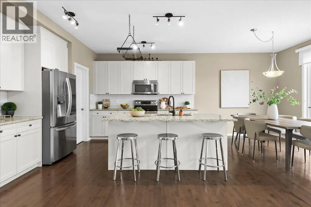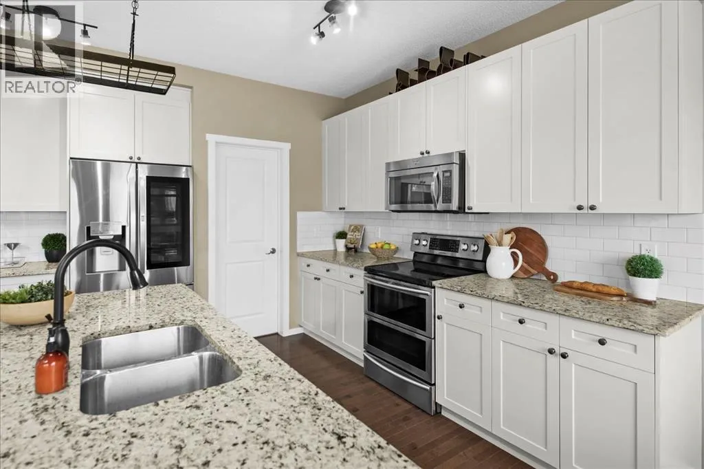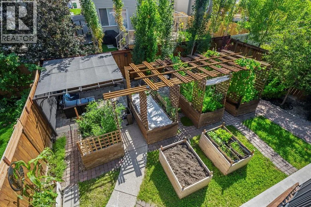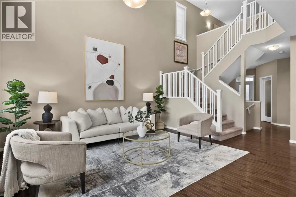 makes it easy to understand why the current owner has happily spent the past decade here.Inside, natural light moves effortlessly through the main floor, lending a warmth that settles in the moment you step inside. The kitchen is generous without ever feeling overstated; timeless white shaker cabinets, quartz countertops, classic subway tile, and stainless-steel appliances anchored together with ease. The breakfast nook and walk-through pantry sit right where you need them, adding to the rhythm of everyday life. Just beyond, the living room unfolds beneath soaring vaulted ceilings, and a home office sits tucked away, allowing the entire main floor to breathe as one, unhurried and connected. Upstairs, a flex space offers endless possibilities: a cozy reading nook, entertainment zone, or play area for the kids. The primary retreat is a true highlight, spacious and quietly refined, complete with a generous walk-through closet and direct access to upper-level laundry, a detail that makes daily life feel just a little more effortless. Two additional bedrooms and a well-appointed full bath round out the upper level, offering comfortable space for the whole family.Downstairs, the fully finished walkout basement adds another dimension of living. The wet bar makes it a natural gathering place, whether that means a lively game night or a quiet evening with a glass of wine. An additional bedroom and bathroom complete the lower level, a natural retreat for teens seeking independence or guests who deserve their own space.Step outside to a backyard the current owners have genuinely cherished. Mornings with coffe e on the patio, afternoons in the garden, evenings in the last of the light soaking in the sunset. The sunny southern exposure and thoughtful landscaping make it an extension of this home, you’ll want to spend time in, season after season.This is a home that has held children’s footsteps, countless quiet moments, and a decade of care. Its owners move on to their next chapter, and the next family is sure to enjoy thoughtful updates including solar panels, diligently maintained home systems, and a coveted address in one of NW Calgary’s most desirable family-friendly communities. (id:64429)