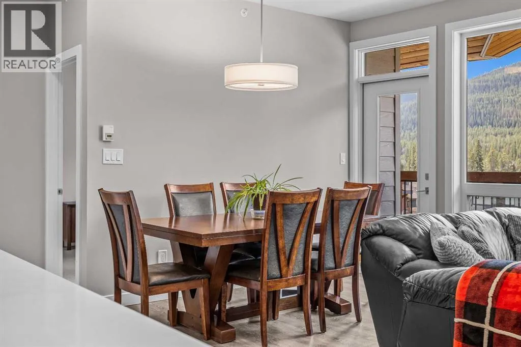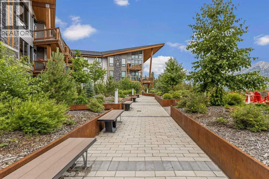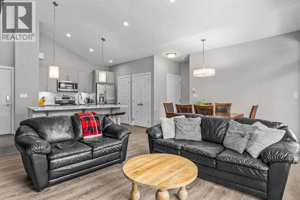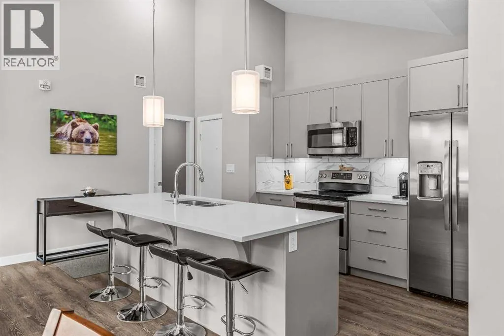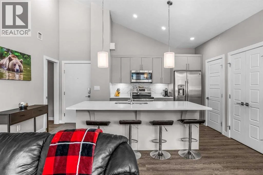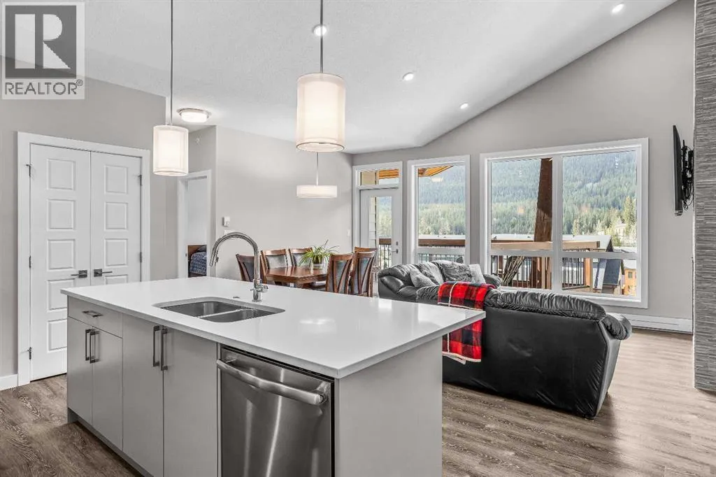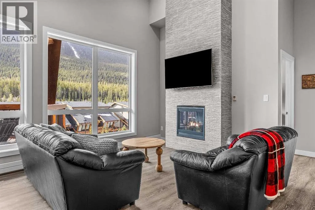 Welcome to Lookout Ridge in Stewart Creek—where mountain living meets everyday comfort. This beautifully appointed 2 bed, 2 bath top-floor condo offers vaulted ceilings, stunning south-facing views, and an open-concept layout designed to impress. The spacious kitchen features stainless steel appliances, quartz countertops, and a generous pantry, flowing seamlessly into the living area where a striking stone fireplace takes centre