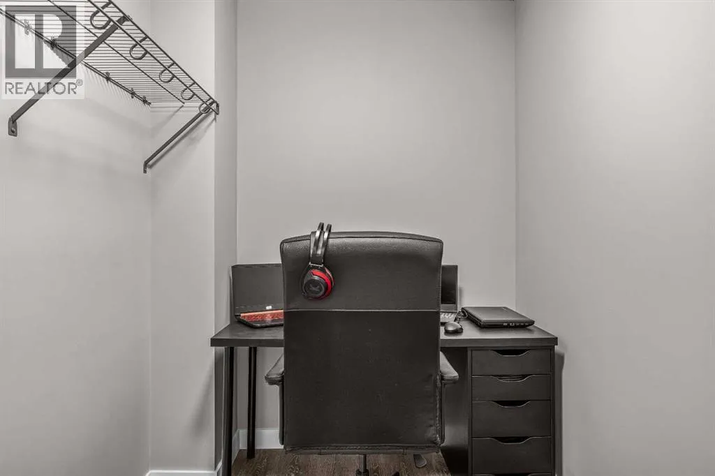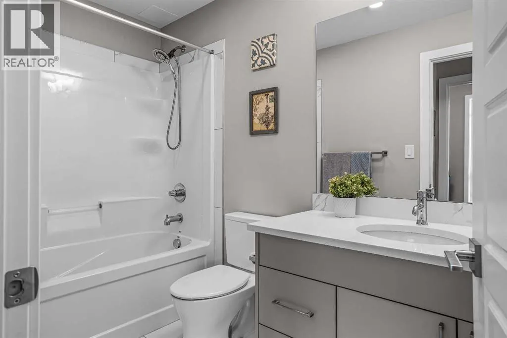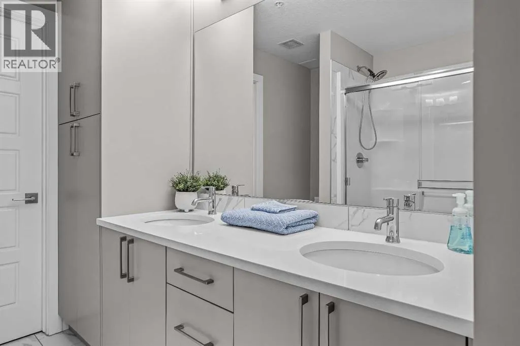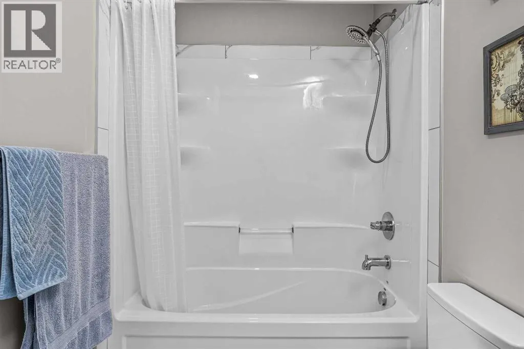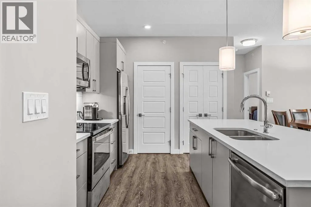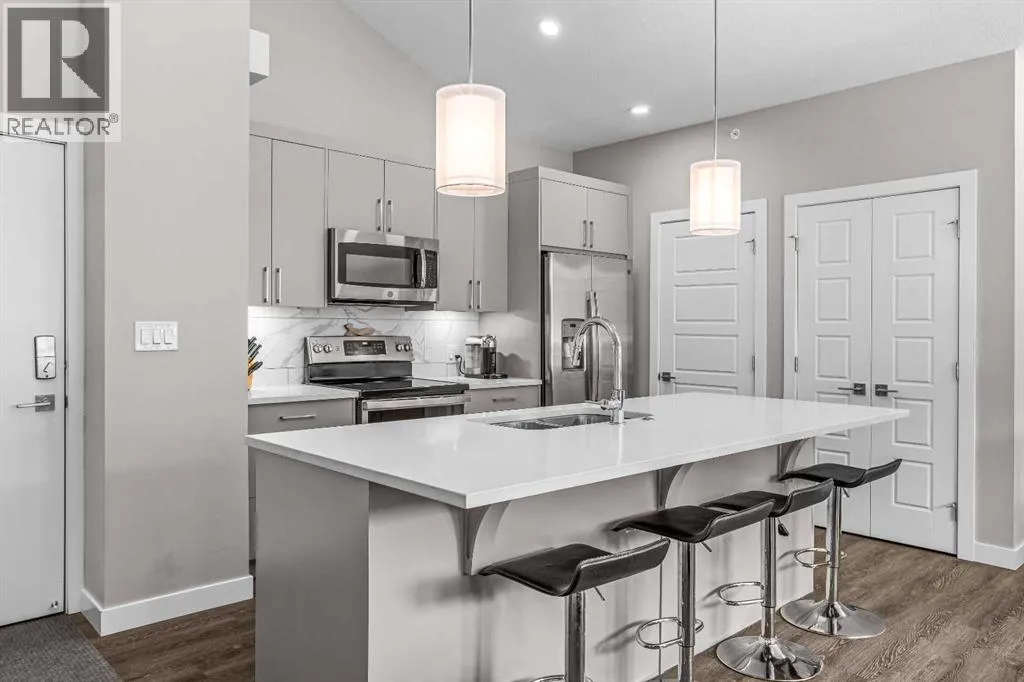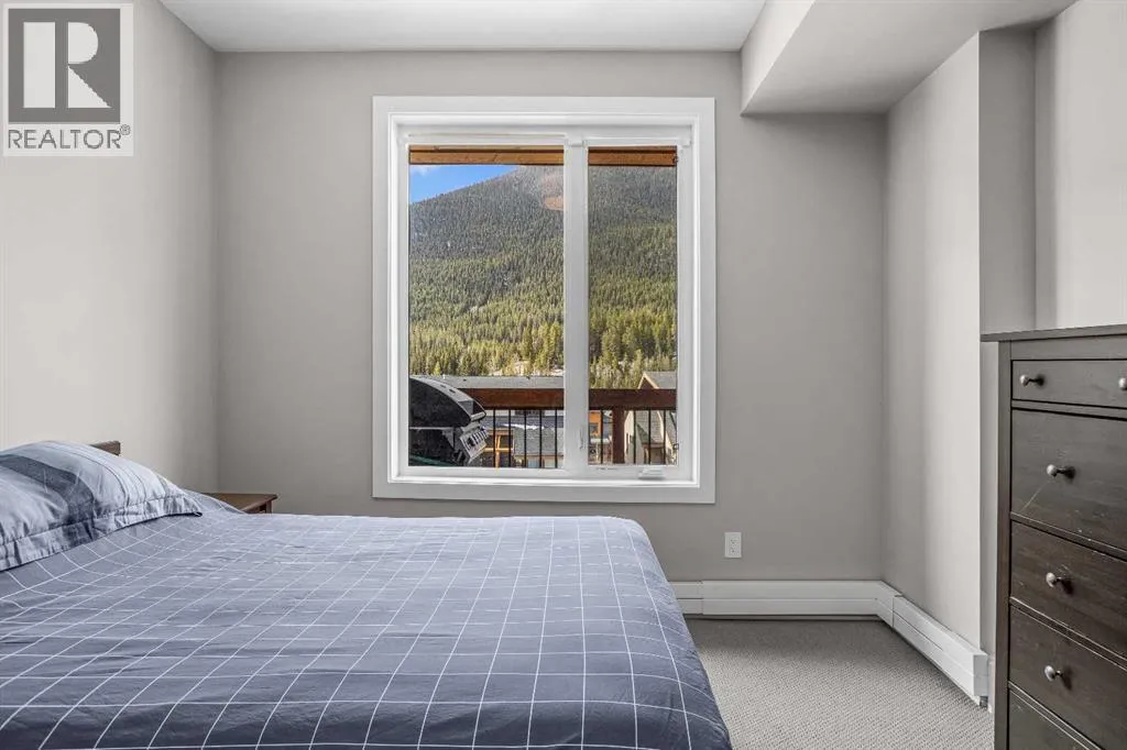 Welcome to Lookout Ridge in Stewart Creek—where mountain living meets everyday comfort. This beautifully appointed 2 bed, 2 bath top-floor condo offers vaulted ceilings, stunning south-facing views, and an open-concept layout designed to impress. The spacious kitchen features stainless steel appliances, quartz countertops, and a generous pantry, flowing seamlessly into the living area where a striking stone fireplace takes centre