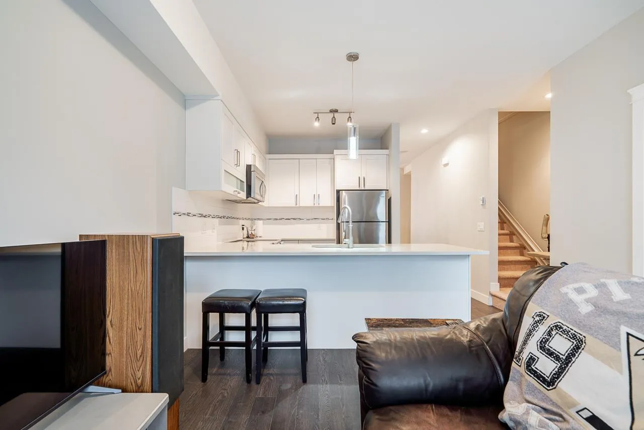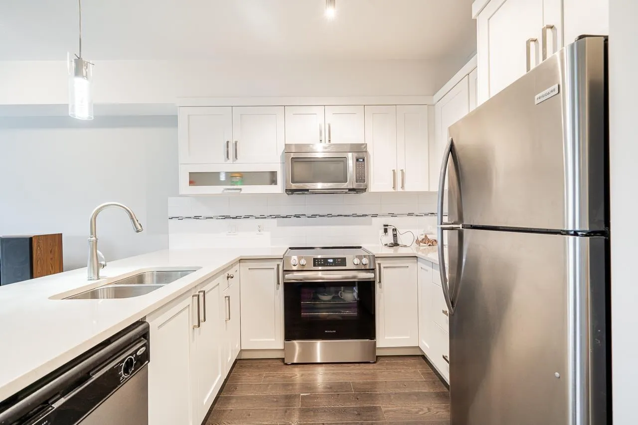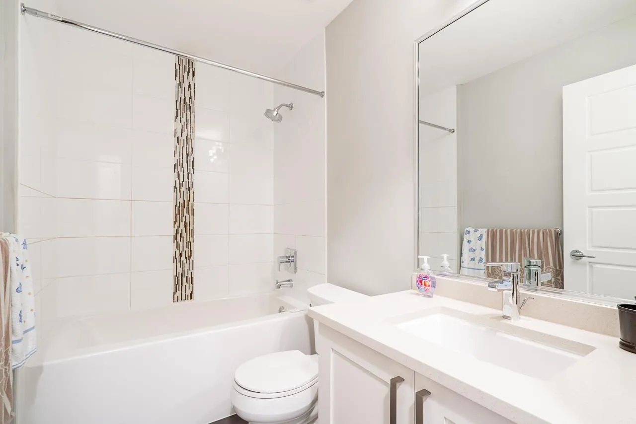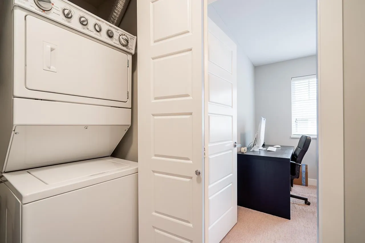 Teo on the Creek. Bright & spacious 2 bedroom 3 bath townhome with rare fenced front yard for kids! Park on the street and walk straight into your main floor! Private setting w/view of a lush treed area across the street. 9′ high ceilings & large windows flood the home with natural light! Modern kitchen w/newer stainless appliances, shaker cabinets
