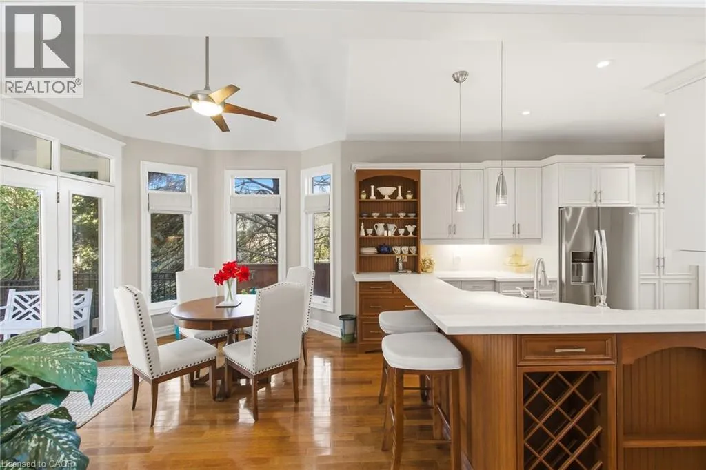 you will notice the mature trees, privacy, a deep-set lot, beautiful gardens and custom stone driveway that leads to an oversized attached double garage and front entrance. Entering the home, there is a large foyer and a view right through the living room to the many windows to the lush back gardens. The main floor has vaulted ceilings and a custom fireplace, large dining room that is adjacent to the chefs kitchen. All perfectly located for entertaining and includes custom cabinetry, stone countertops, & luxury S/S appliances. The primary bedroom on the main floor includes an oversized W/I closet and ensuite with soaker tub and separate shower. The second bedroom is currently being used as an office. The second floor is complete with a loft style study, additional bedroom and full bathroom. The lower level basement has been beautifully updated with bedroom and spacious family room featuring a fireplace with live edge wood mantle. Step outside and relax under your custom covered porch – your own private oasis. Beautifully manicured, lush gardens, and mature trees offering a serene, tranquil setting. There is a seamless indoor/outdoor flow. Easy access for al fresco dining. There is so much to appreciate about this home. You must come & experience it – one of a kind, rarely offered!! (id:62650)