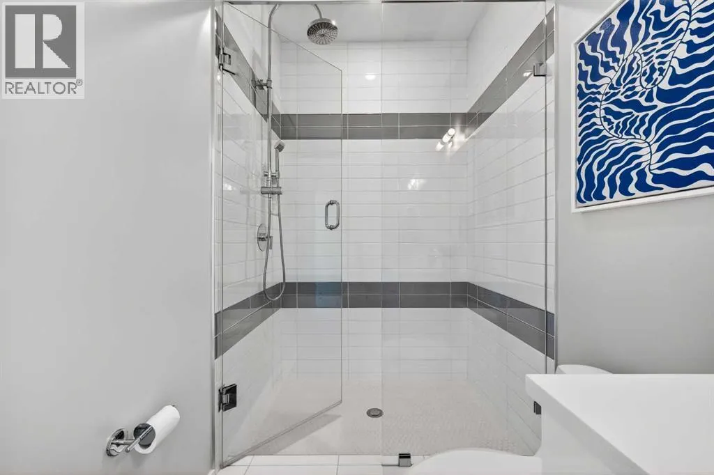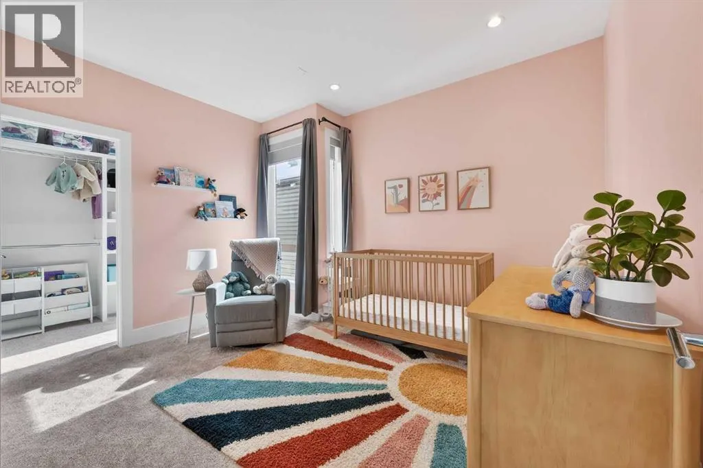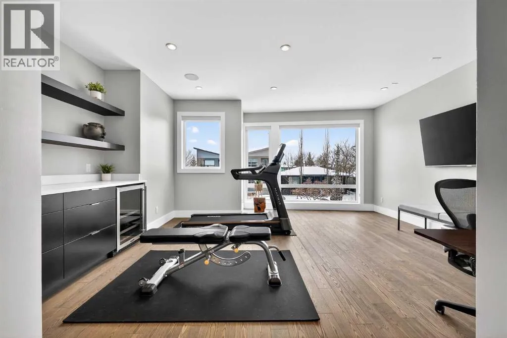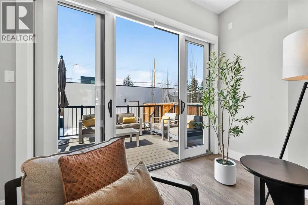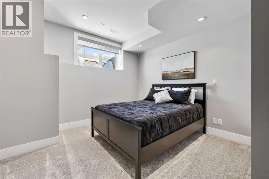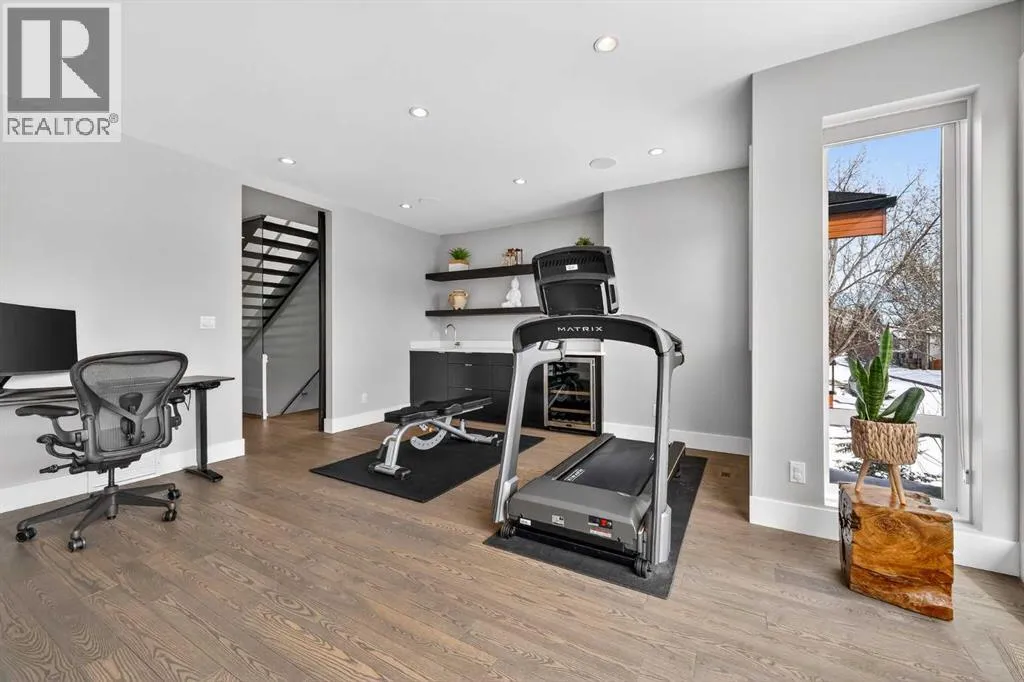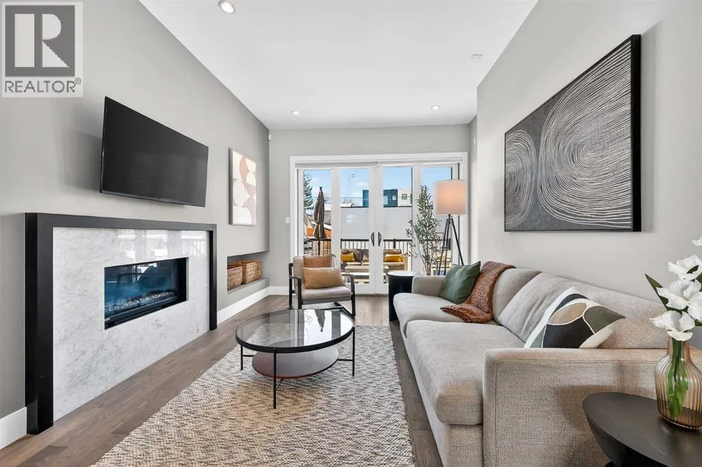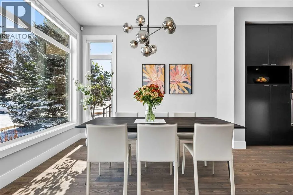 level of quality and attention to detail seldom found in today’s infill market.Step inside to a welcoming front foyer with a convenient side closet, leading into an elegant dining area illuminated by a stunning smoked glass chandelier. The main floor unfolds into a showpiece kitchen, featuring premium stainless steel appliances and a striking dual waterfall Caesarstone island with updated pendant lighting and generous seating—perfect for gathering with family and friends. Throughout the home, Kentwood hardwood flooring, rich oak ebony cabinetry with soft-close hardware, and solid-core doors reflect a commitment to both style and durability.A dramatic open-rise hardwood staircase with floor-to-ceiling glass creates a striking architectural focal point, while the built-in wired audio system enhances everyday living and entertaining. A custom Sugi Ban burnt oak barn door adds a unique designer touch.Designed with versatility in mind, this home offers multiple spaces to relax and entertain. The main living room is anchored by a stone-encased gas fireplace with an art niche, creating a warm, inviting setting. Upstairs, are 2 Large bedrooms + Full Bath & Laundry room & flex/entertainment room with a wet bar provides the perfect retreat or hosting space. The fully developed basement expands your options further, featuring brand-new plush carpeting, a second wet bar with cooler and wine fridge, ample storage, a spacious guest bedroom with a walk-in closet, and a full bathroom just steps away.The entire third level is dedicated to a luxurious private retreat. Enjoy bre athtaking city views from your rooftop patio and expansive primary suite. The spa-inspired ensuite features programmable in-floor heating, a freestanding soaking tub, a large glass shower, dual vanities finished in vein-cut limestone, a dedicated makeup station, and a generous walk-in closet with built-in cabinetry—creating a true sanctuary to unwind at the end of the day.The exterior is equally impressive, showcasing cedar soffits, metal-clad windows, and durable acrylic stucco. The fully landscaped yard includes exposed aggregate walkways and low-maintenance Trex composite decking. A sunny west-facing backyard offers the perfect setting for outdoor living, complete with a gas line rough-in for barbecuing.Ideally located just minutes from downtown, with a playground at the end of the street and close proximity to Sandy Beach and the river pathways, this home offers the perfect blend of luxury, comfort, and convenience.An outstanding opportunity to own in one of Calgary’s most desirable communities. (id:64429)