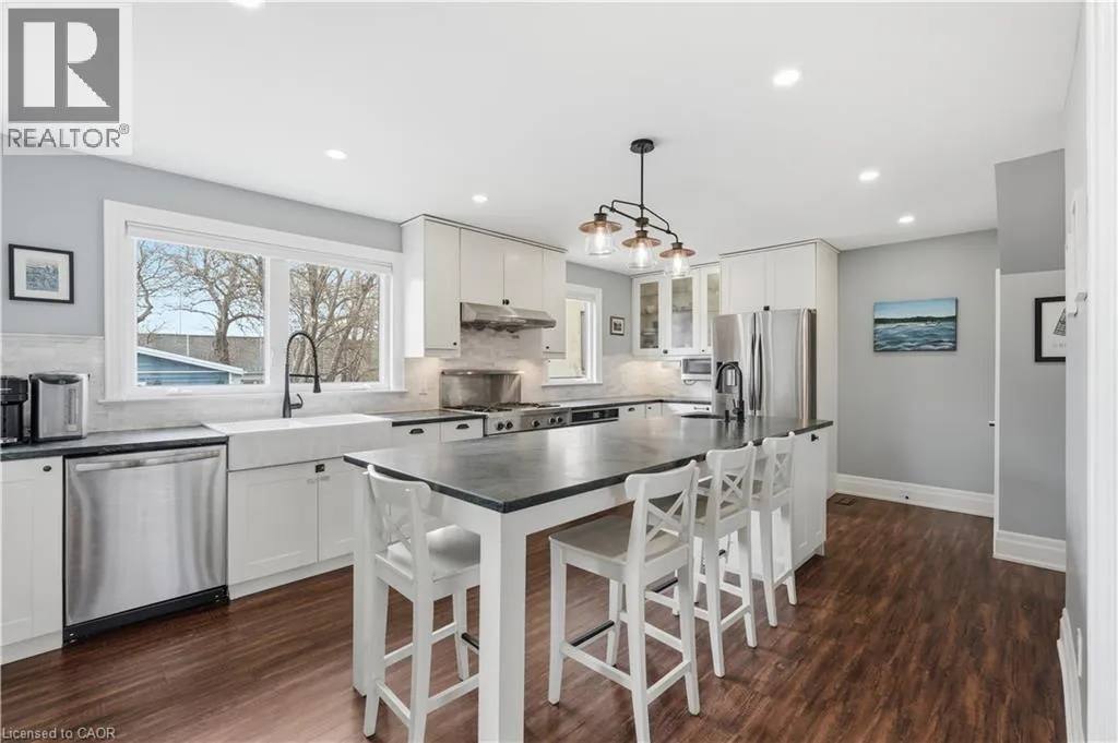 Perfectly positioned across from Lake Ontario, this thoughtfully renovated Beach Strip home offers an exceptional lifestyle just steps to the waterfront trail and sandy beach. Extensively updated and meticulously maintained a true turn-key opportunity. Inside, rich dark floors and a warm, cohesive palette set the tone. The inviting living room centres around a beautiful gas fireplace with shiplap surround and