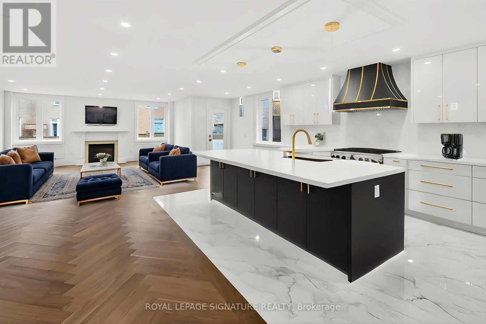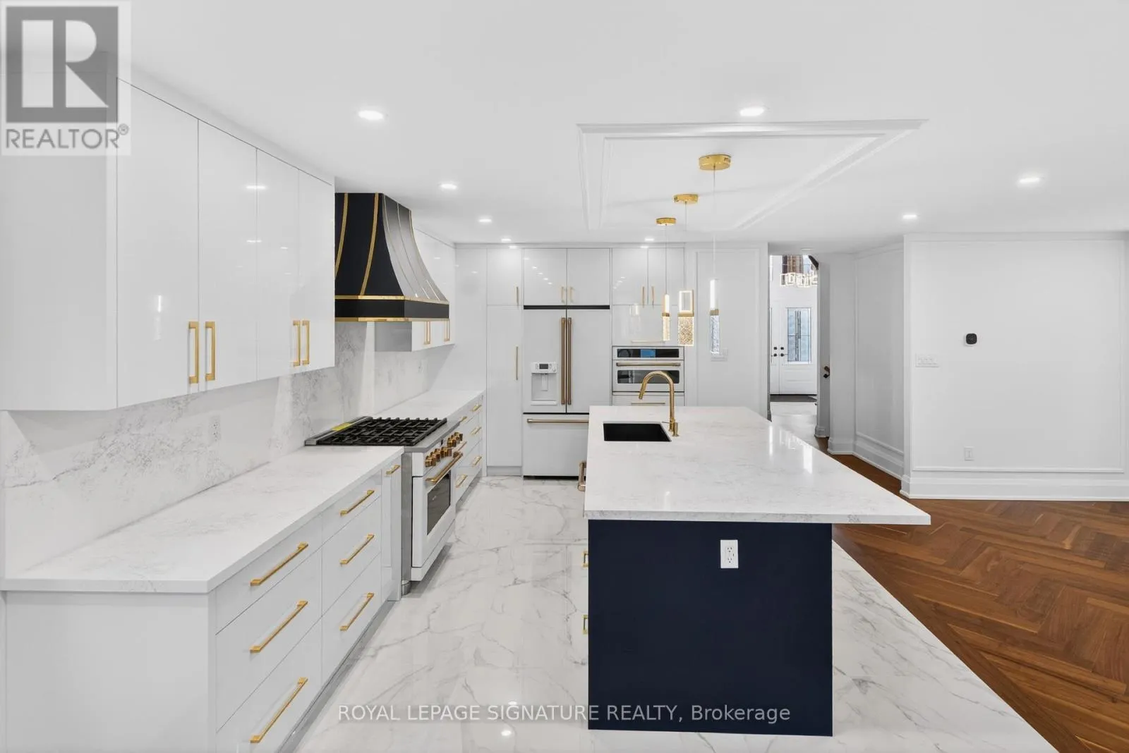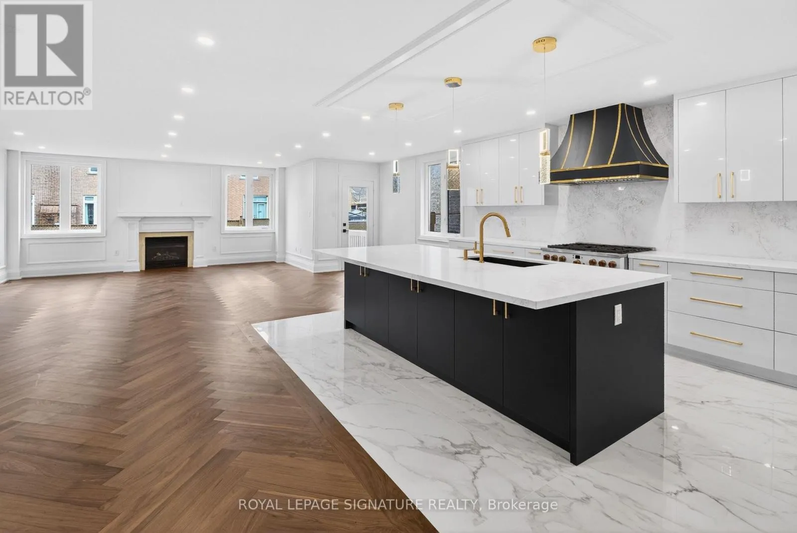 Luxury redefined in Churchill Meadows-5180 Littlebend Dr showcases over $450,000 in high-end upgrades with designer finishes throughout. A grand foyer with soaring ceilings and tile flooring leads to a bright open-concept main level with pot lights and chevron hardwood floors. The designer kitchen features panel-ready appliances, quartz countertops and backsplash, crown moulding, a large centre island, and elegant gold accents.