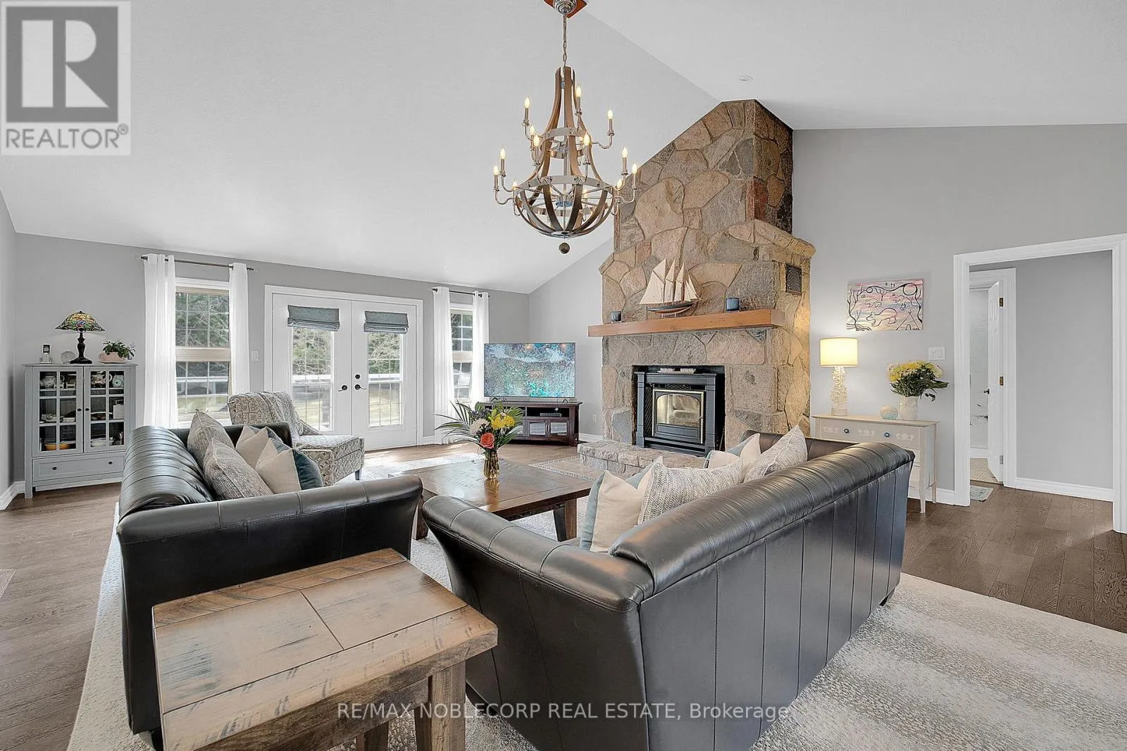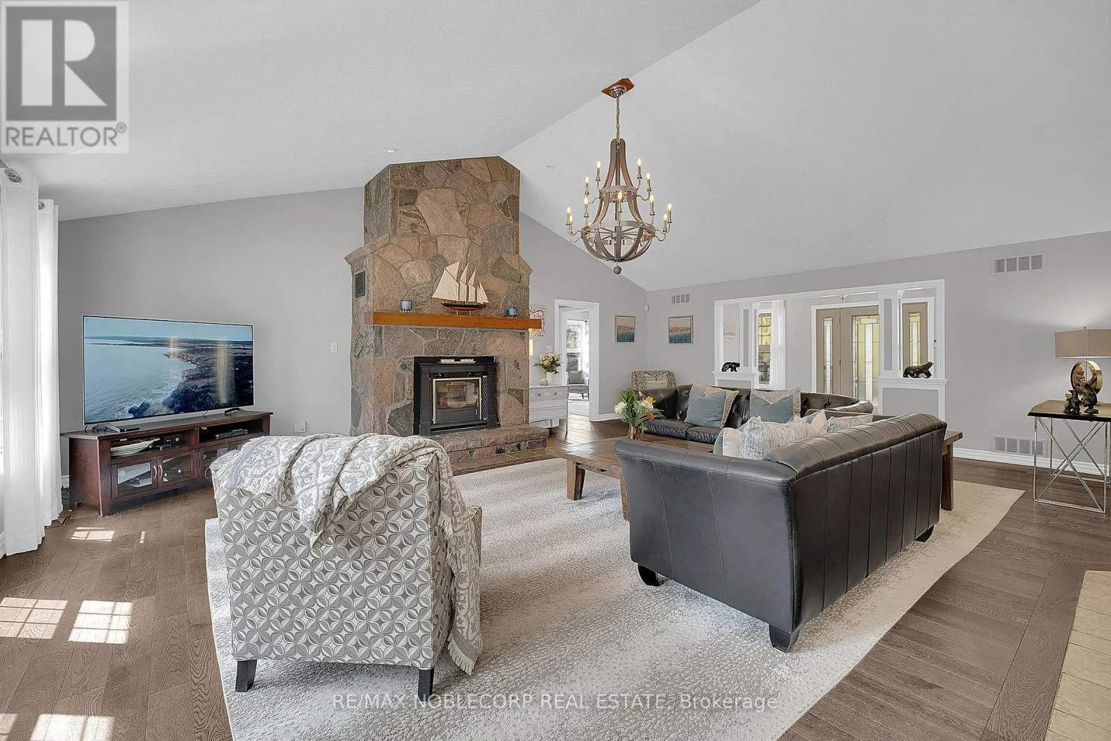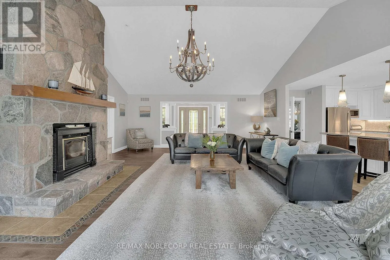 Step into this exceptional estate and experience refined country living at its absolute finest. Welcomed by a grand foyer with engineered hardwood flooring and an impressive open-concept design, elevated by soaring cathedral ceilings that create a bright and airy ambiance throughout. The main living space is anchored by a breathtaking floor-to-ceiling stone fireplace, serving as a striking focal point, while