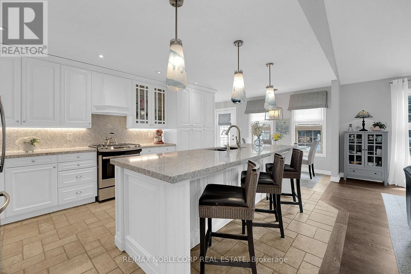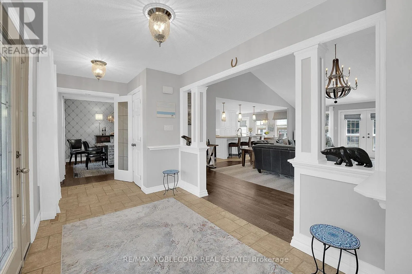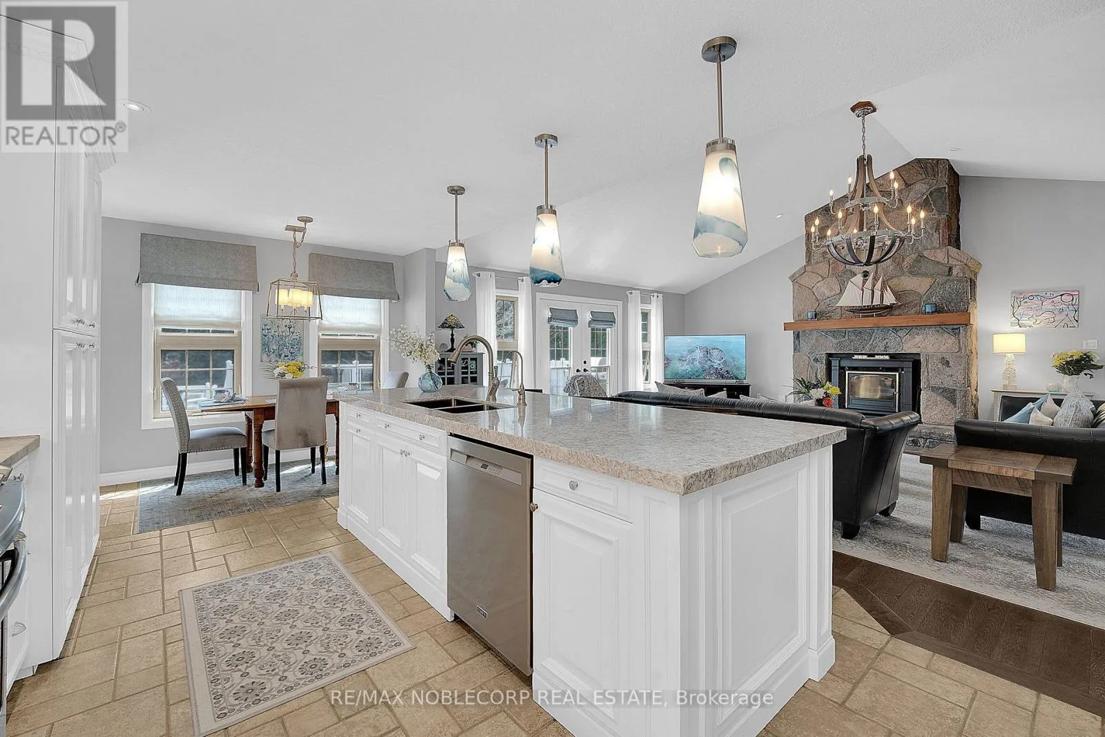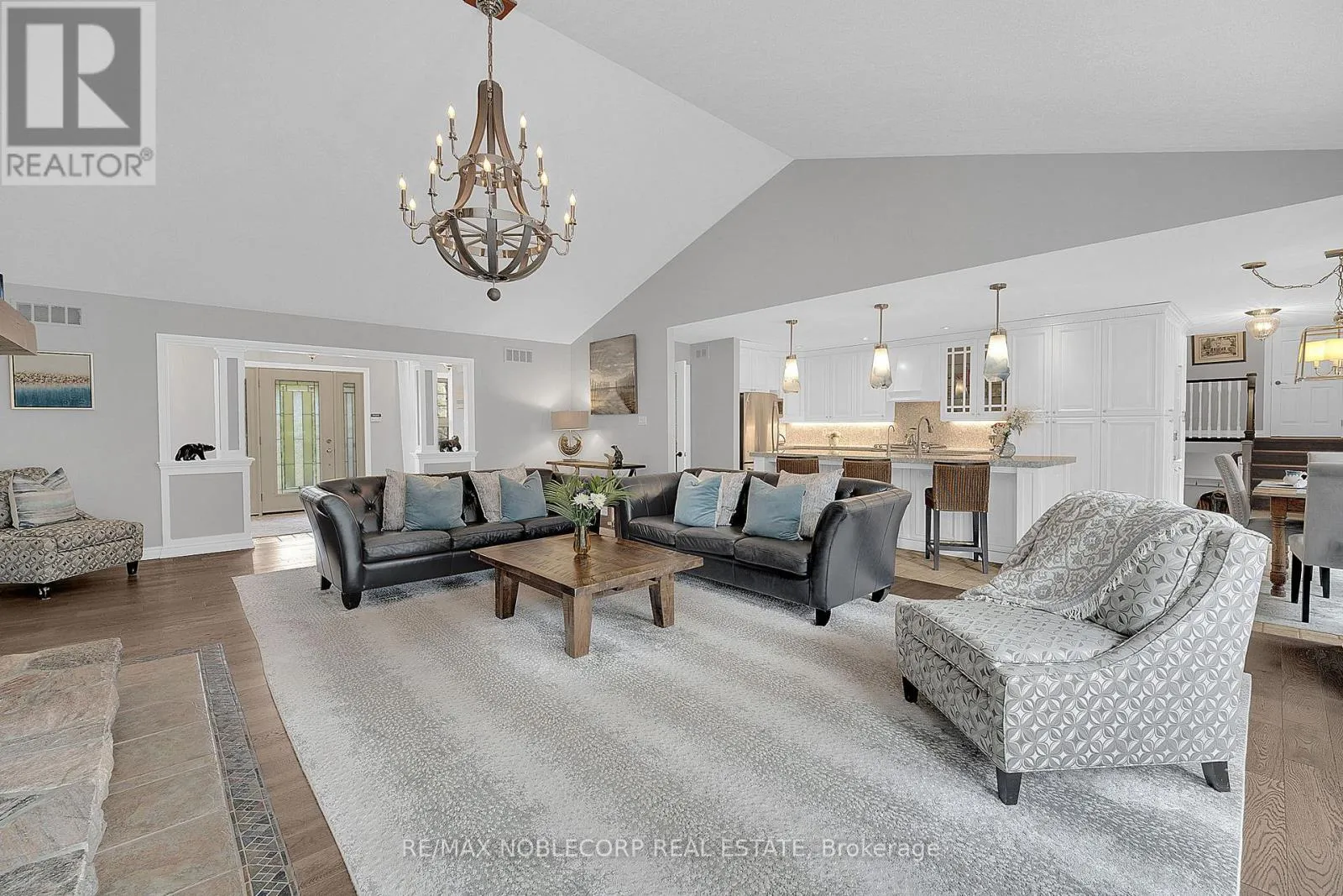 Step into this exceptional estate and experience refined country living at its absolute finest. Welcomed by a grand foyer with engineered hardwood flooring and an impressive open-concept design, elevated by soaring cathedral ceilings that create a bright and airy ambiance throughout. The main living space is anchored by a breathtaking floor-to-ceiling stone fireplace, serving as a striking focal point, while