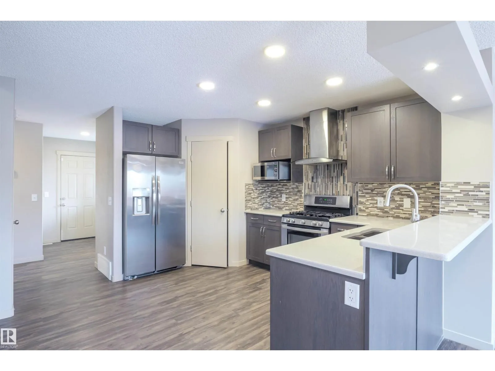 Welcome to this immaculate 2017-built half-duplex in Tamarack! Offering over 1,600 sq. ft. of stylish living space, this home feels like a true single-family house with modern upgrades throughout. Inside, enjoy a bright, open-concept main floor featuring spindle railings and luxury vinyl plank flooring—no carpet anywhere! The stunning kitchen boasts quartz counters, a gas range, stainless steel appliances, and ample