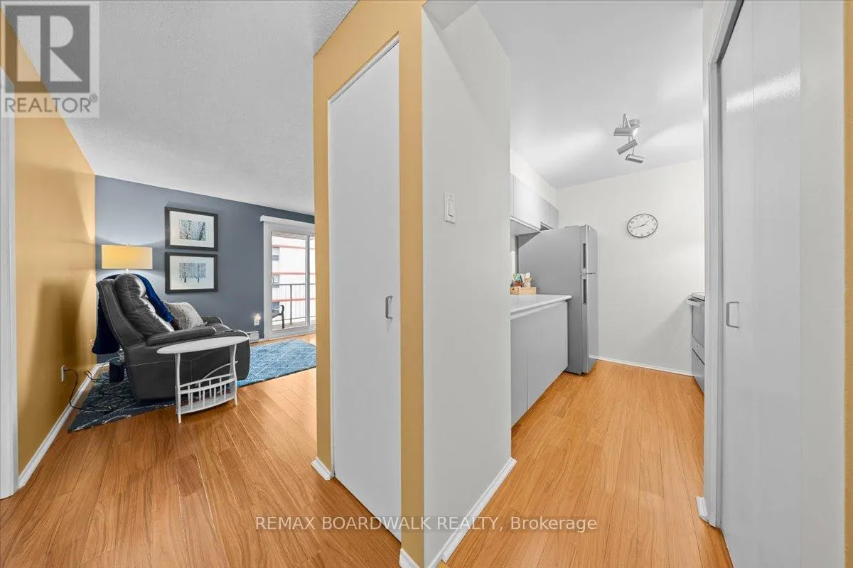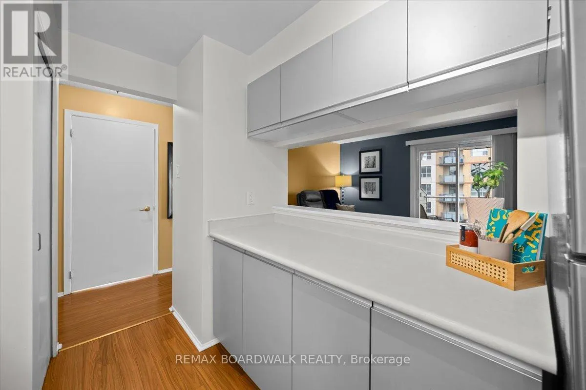 Fourth-floor 1-bedroom with a well-laid-out interior, offering in-unit laundry, a walk-in closet, and updated kitchen appliances. Bright living space extends to a covered balcony with room for seating and evening downtime, accessed through a sliding balcony door that enhances indoor-outdoor flow.The kitchen features an extended run of cabinetry offering strong storage, paired with an efficient layout, double sink, modern stainless