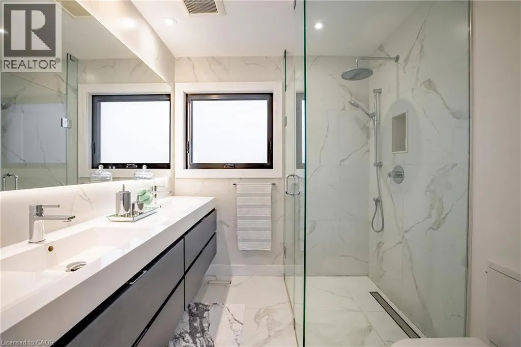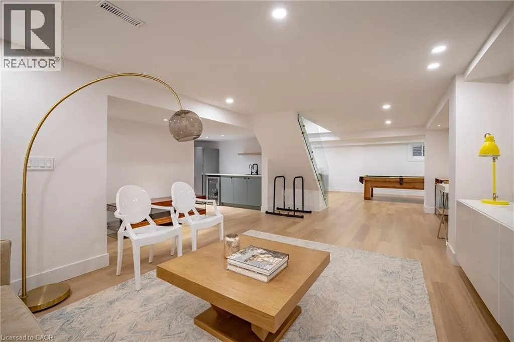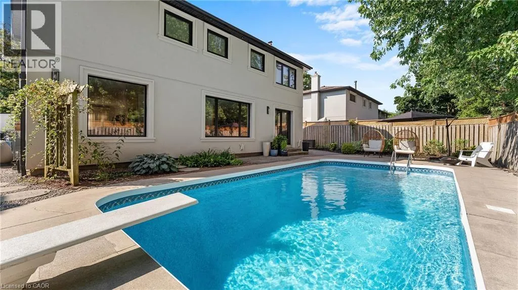 open-concept layout ideal for modern family living. The main level features a stunning gourmet kitchen with a Calcutta marble waterfall island, custom cabinetry, and premium appliances, seamlessly connecting to spacious dining and living areas. Sliding glass doors lead to a private backyard oasis, while a convenient side hallway includes a powder room and unique dog washing station.Upstairs, natural light fills the space through skylights and a glass-accented staircase. Four generously sized bedrooms include a serene primary suite with a walk-in closet and a luxurious ensuite featuring double sinks and a walk-in shower. A full bathroom and laundry room complete this level.The fully finished lower level extends the living space with a recreation room, games area, kitchenette, den, and a stylish three-piece bathroom, offering excellent flexibility for guests or extended family.Outside, the private backyard is designed for both relaxation and entertaining, featuring a heated pool, multiple seating areas, and lush gardens. With seamless indoor-outdoor flow and views from the rear of the home, this property truly feels like a personal retreat. (id:62650)