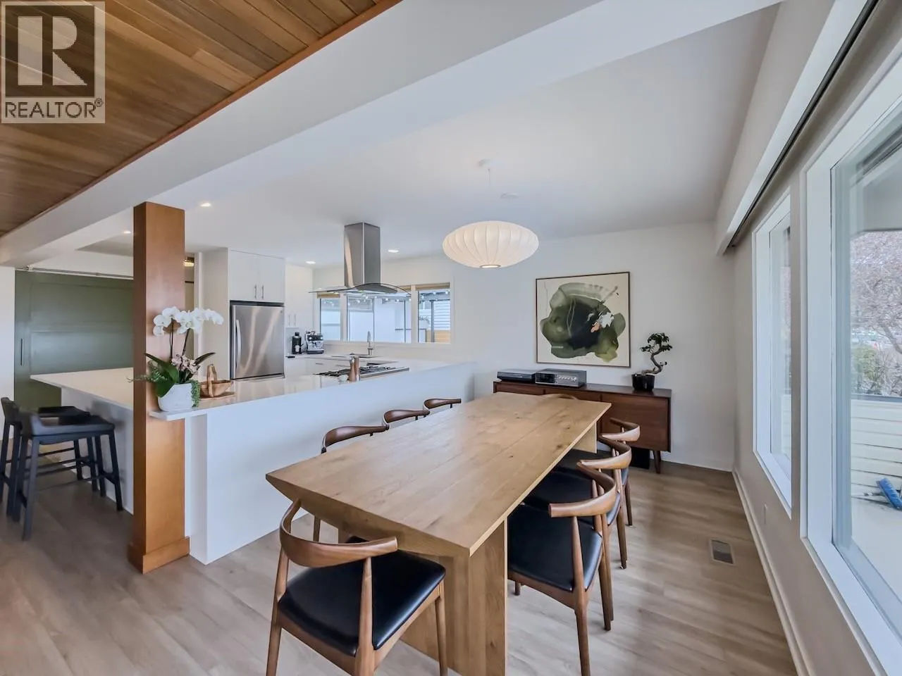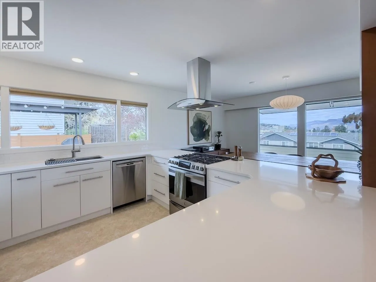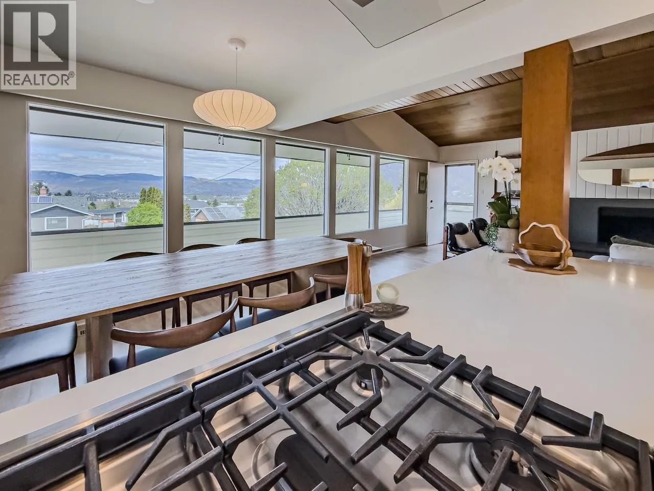 Set above the street with sweeping views of downtown and surrounding mountains, this distinctive mid-century home pairs architectural character with thoughtful updates. The bright, open-concept living space is anchored by a vaulted wood ceiling and a striking wood-burning fireplace with custom mantle. The fully renovated kitchen features stainless steel appliances, custom cabinetry, and quartz countertops, flowing seamlessly into the main