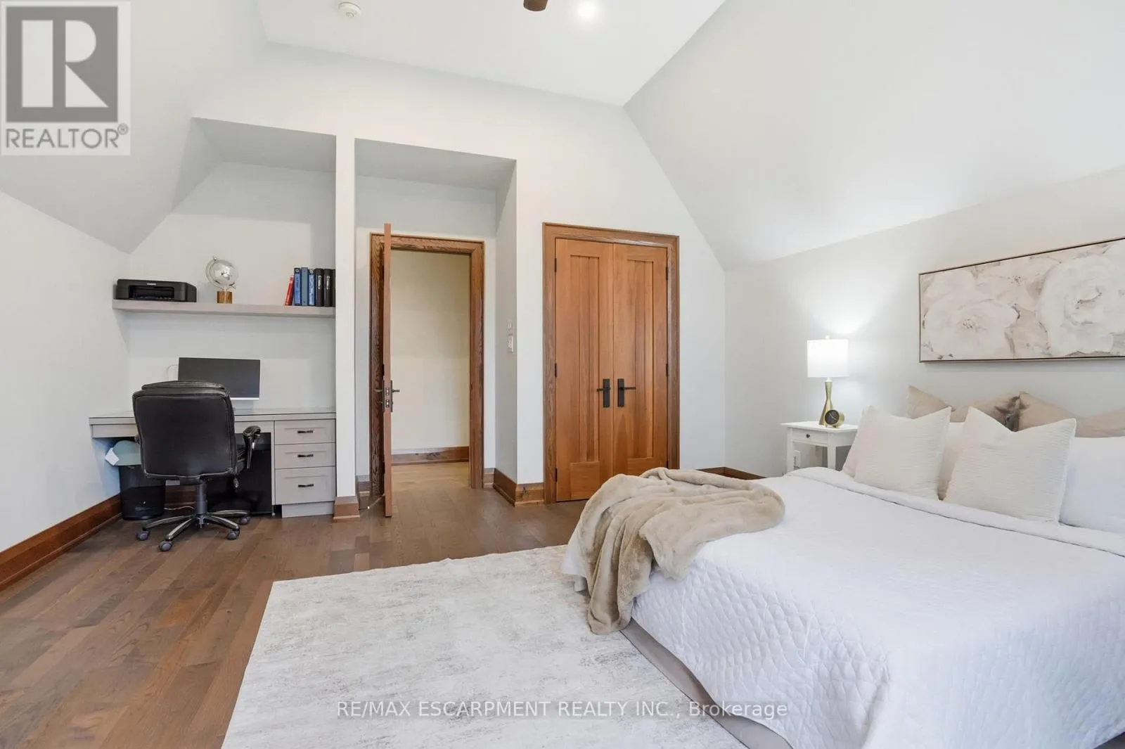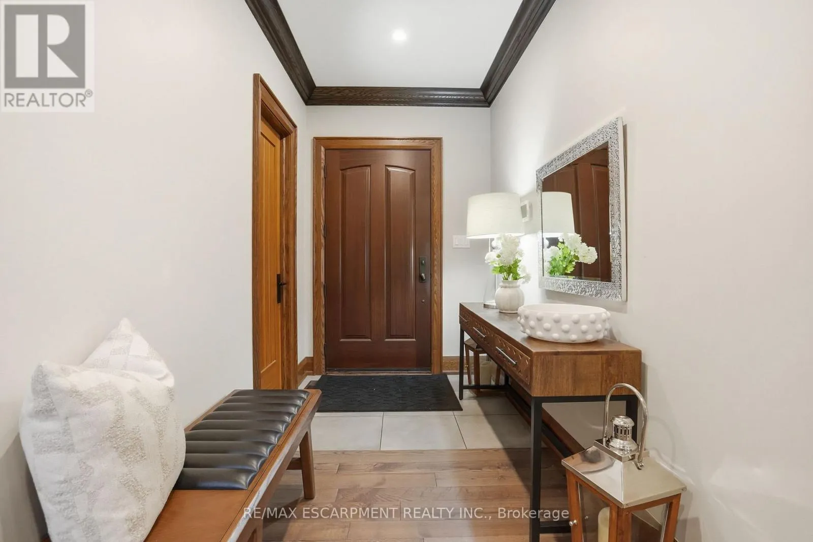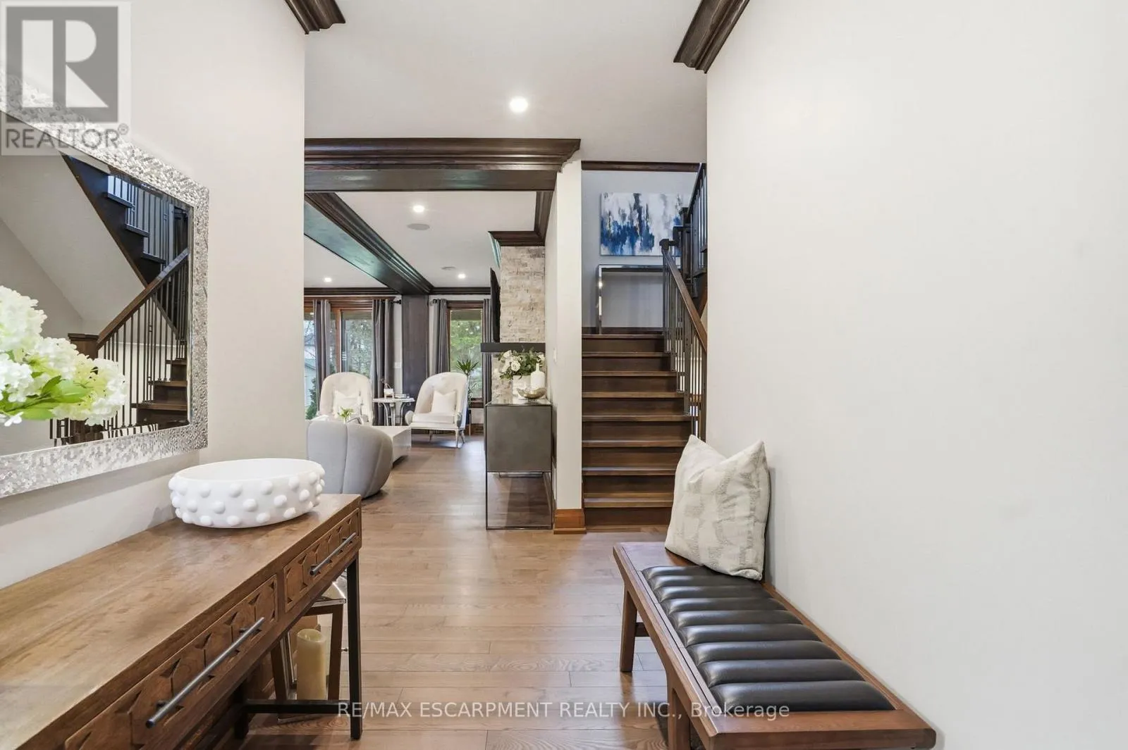 Timeless design and exceptional functionality define this beautifully finished home set on a landscaped lot with a circular driveway and strong curb appeal. A classic blend of red brick, natural stone, and shingle-style detailing creates an elegant exterior, complemented by a covered front porch and mature greenery for added privacy. Inside, rich hardwood flooring, detailed millwork, and warm, natural finishes