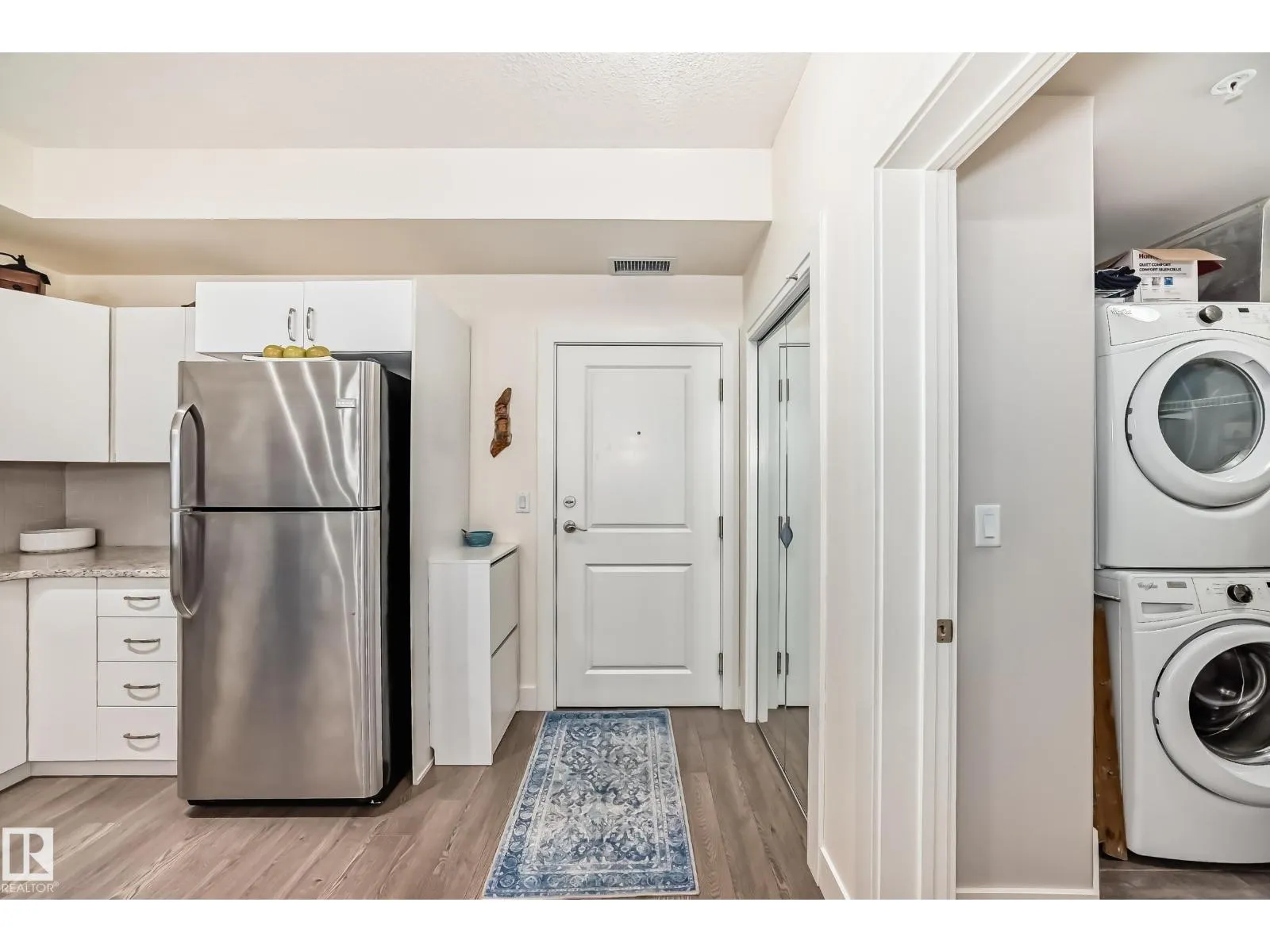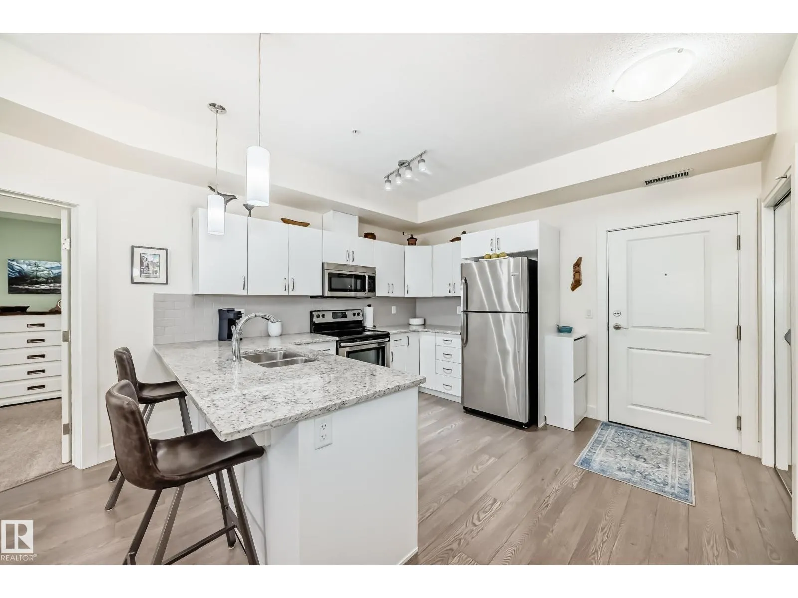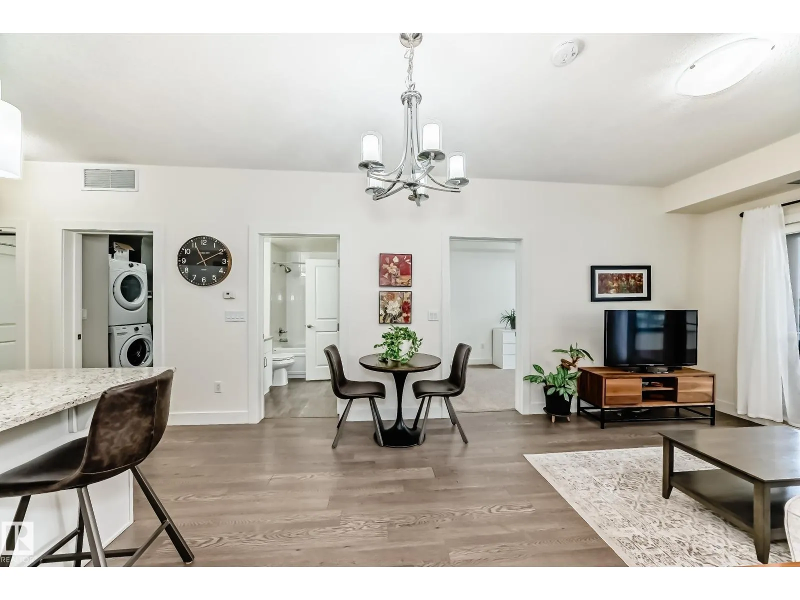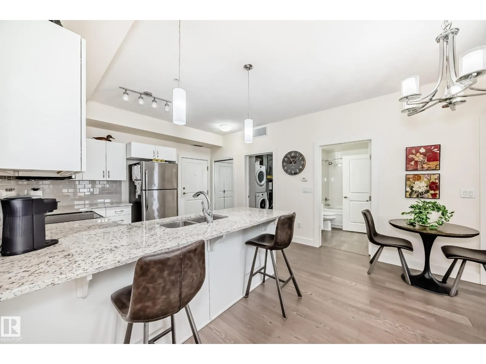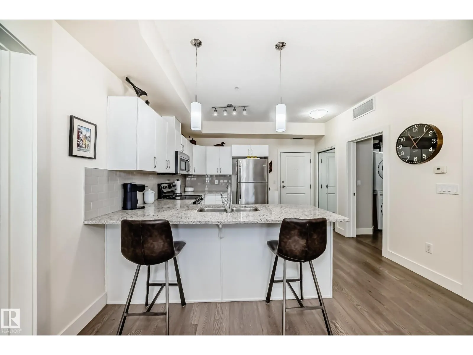 Eton Park Estates – Extremely clean, two bedroom two bathroom second floor of luxury suite that has a generous amount of storage and cabinetry, in-suite, laundry, 4 piece, ensuite, spacious primary suite and second bedroom with ensuite bath. This Quiet building is 18+ includes a heated, titled parking stall (close to elevator), plus a good sized secured storage cage, a