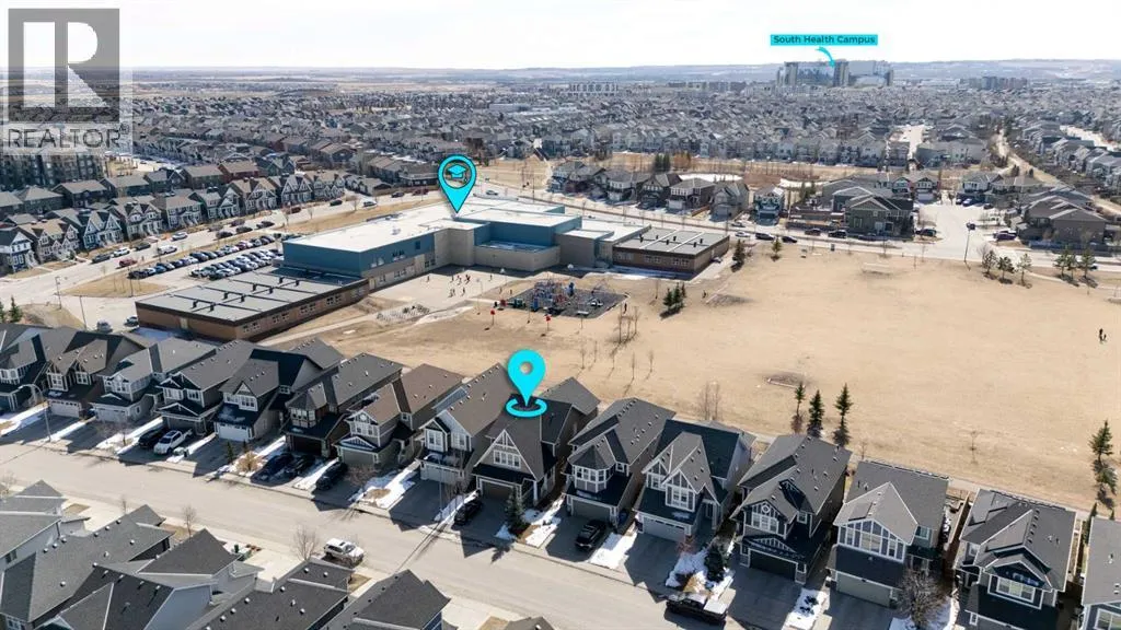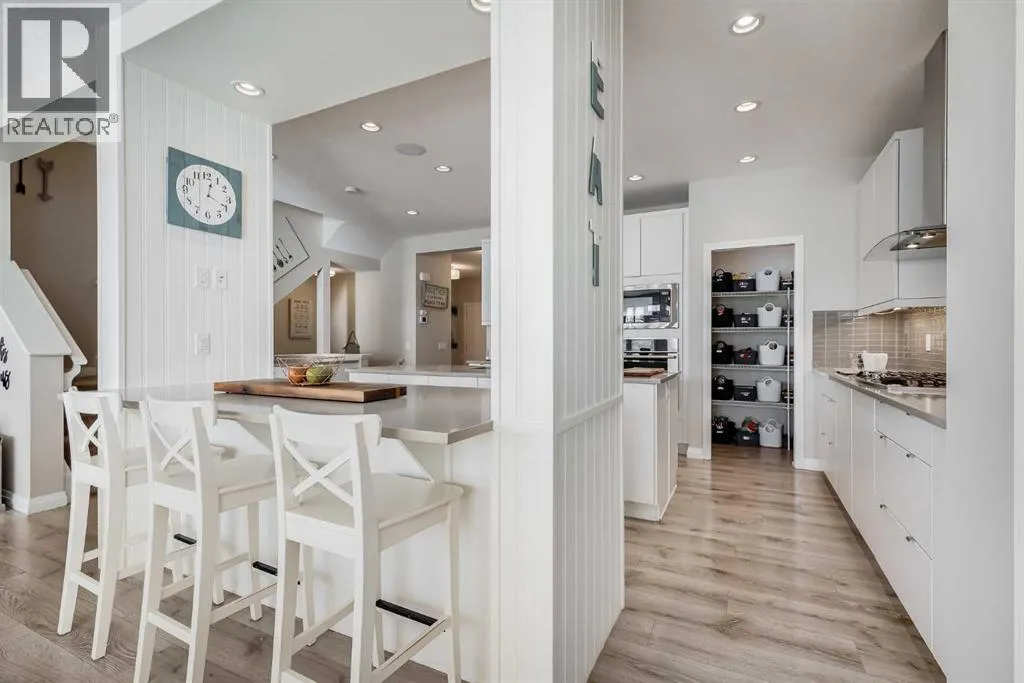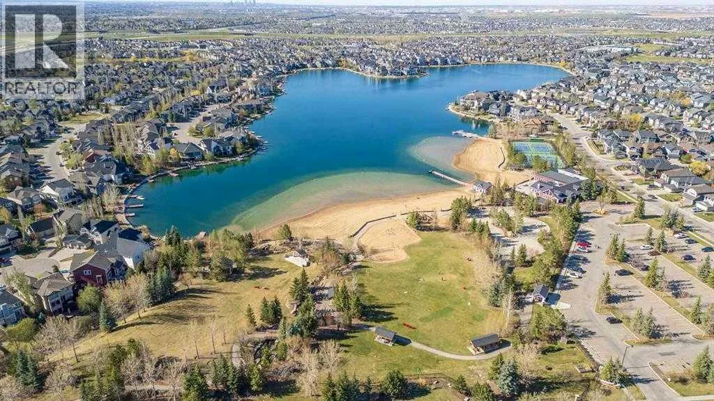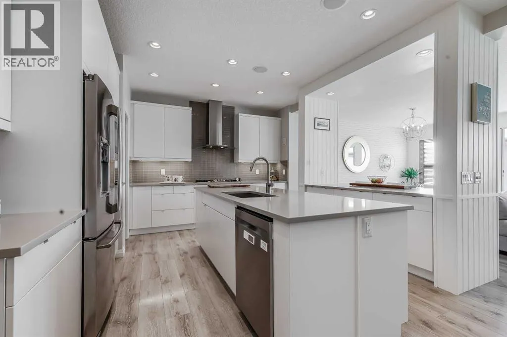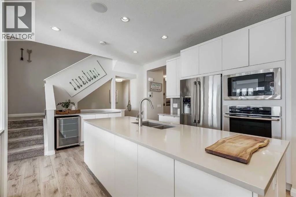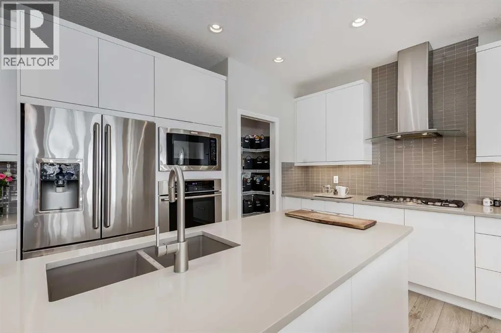 a spacious entryway and 9-foot ceilings, while large windows bring in an abundance of natural light. Durable wide plank hardwood flooring runs throughout, complementing the open-concept layout that connects the kitchen, dining, and living areas. The kitchen is designed with a focus on both style and function, featuring quartz countertops, stainless steel appliances including a gas cooktop (wired for electric cooktop as well) and built-in wall oven, sleek white cabinetry, and a refined backsplash. Two oversized islands offer generous space for preparation and casual seating, while abundant cabinetry and a walk-in pantry provide excellent storage. A built-in beverage area with a bar fridge adds an extra layer of convenience. The dining area comfortably accommodates gatherings and offers access to the back deck, while the living room is anchored by an electric fireplace with a stone surround. A two-piece powder room completes this level. Upstairs, a central bonus room separates the primary retreat from the additional bedrooms. The primary suite overlooks greenspace with views of the Rocky Mountains and includes a luxurious five-piece ensuite with a soaker tub, standalone shower, dual vanities with individual sinks, a makeup station, and two walk-in closets. Two additional bedrooms are generously sized and share a five-piece bathroom with dual sinks and a separate area for the tub, shower, and toilet. A walk-in linen closet and a dedicated laundry room add to the practicality of this level. The fully finished basement expands the living space with a recreation and media a rea, two more bedrooms, each with their own walk-in closet, and a four-piece bathroom. There is also plenty of storage throughout. Outside, the south-facing backyard enjoys the sun all day long and features a deck and a grass area suited for a fire pit, play space, or entertaining. There is direct access to walking and biking pathways and the surrounding greenspace. Living in Auburn Bay means exclusive access to the lake and community amenities including a beach, tennis courts, and year-round activities. The home backs onto a field connecting Prince of Peace and Lakeshore Schools, is a short walk to Auburn Bay School, and minutes from JCS High School, Seton YMCA & library, South Health Campus, shopping, dining, major roadways, parks, golf courses, and an off-leash dog park. Check out the floor plans and 3D Tour! (id:64429)