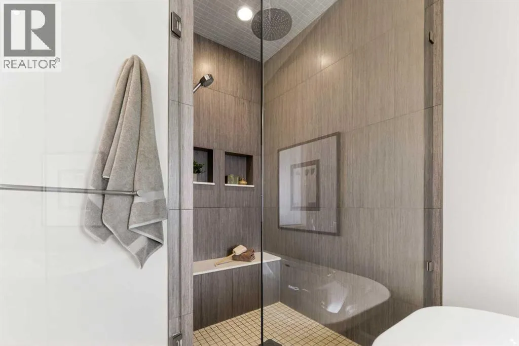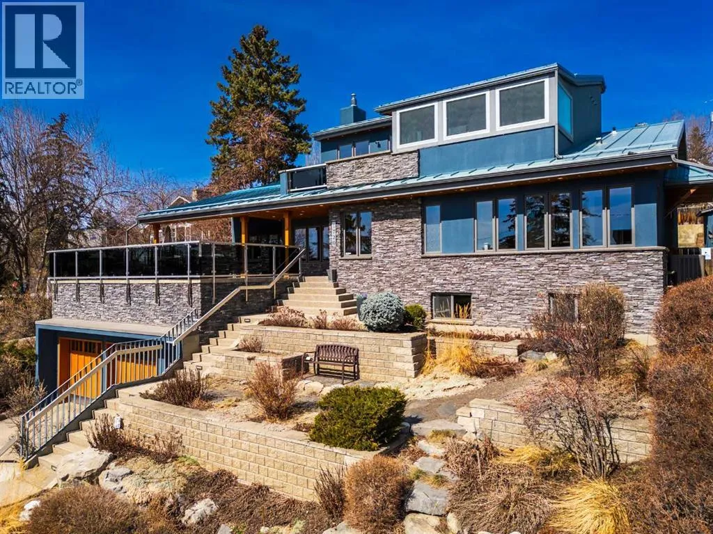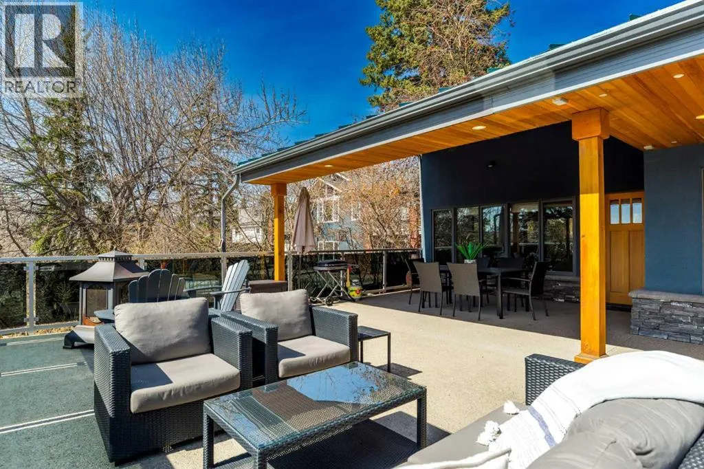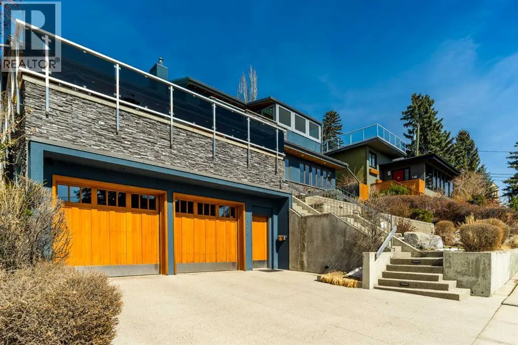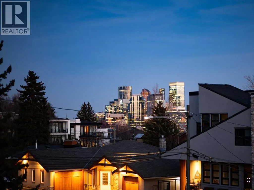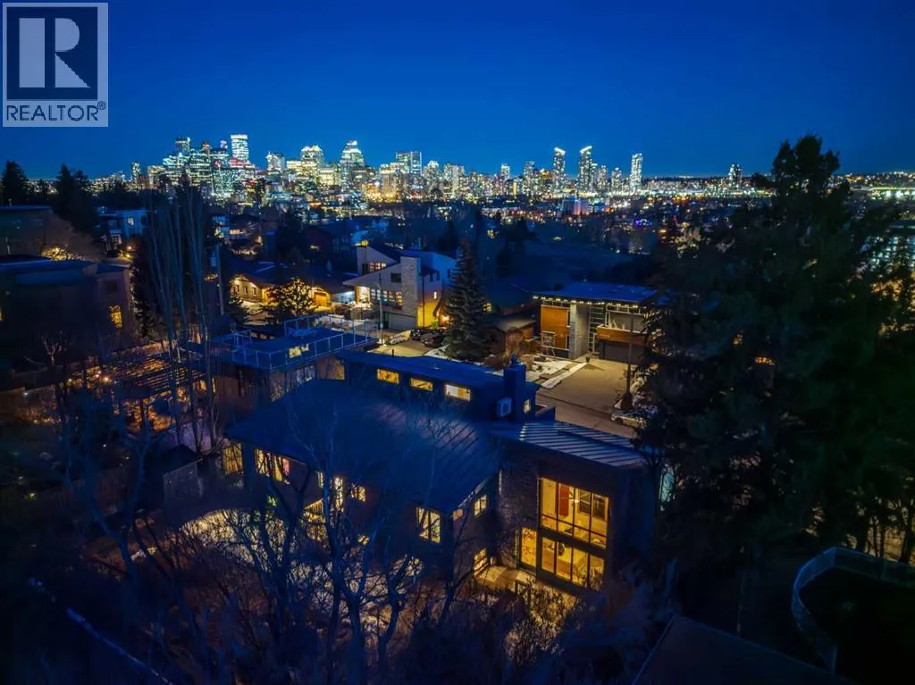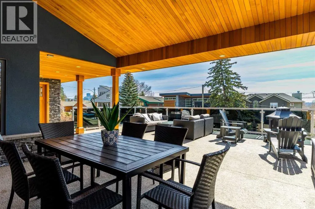 to execute the dramatic primary suite, while Marvel Kitchens designed the heart of the home, a sophisticated culinary hub focused on performance. It features a massive quartz island with glimpses of the downtown skyline, high-end appliances, clever cabinetry, and a dedicated coffee bar area. Adjacent, the Davignon designed studio, built over the garage space, is an exercise in intentional, architectural detail; defined by soaring ceilings and an expansive gas fireplace, this light-filled space offers independent front and back exterior access, serving effortlessly as a professional home office option or the home’s primary gathering hub. Ascend to the primary suite, a masterwork by William Blake Homes. The private balcony offers cinematic, dual-directional views of both the city skyline and the Rocky Mountains. A study in quiet luxury, the suite features 12ft vaulted ceilings, a sunroom, and a meticulous 5-piece ensuite where heated floors extend even into the shower, complemented by a deep soaker tub and heated towel rack. The remainder of the upper level houses 2 additional generously-sized bedrooms with substantial closets, and a large family bath, all positioned at the rear of the home for ultimate privacy. The lower levels are equally purposeful: the north side offers a self-contained retreat with a family room, bedroom, bath, kitchenette type space, and laundry, ideal for teens, nannies, or generational living. The south side transitions into the ultimate active base, featuring a home gym (or 5th bedroom) and a dedicated gear room for ski tuning, bike maintenance or stora ge, complete with a cold room for wine. This leads to the attached triple garage, a core feature for the collector, redefined with over-height ceilings to accommodate a car lift and an innovative tandem bay. Outdoor living is prioritized through a series of defined spaces, beginning with a partially covered, south-facing patio off the entrance that facilitates effortless alfresco dining or a glass of wine while taking in the views. The private, tiered backyard is an entertainment retreat featuring multi-level decking, a hot tub, elevated flat space to play, and a double parking pad off the back lane. The front yard presents a sophisticated, climate-conscious xeriscape for a low-maintenance lifestyle. Located within walking distance to amenities and offering rapid access to the Children’s and Foothills Hospitals, the U of C, The Calgary Winter Club and downtown, the home is finished with enduring materials, including a 50-yr blue metal roof, upgraded insulation, and an efficient multi-zoned heating system. (id:62650)