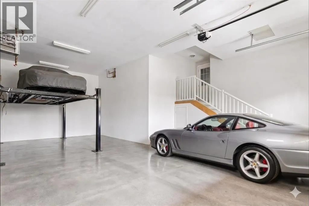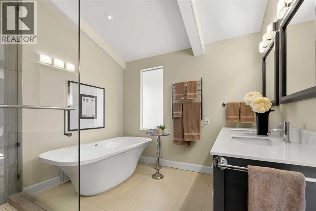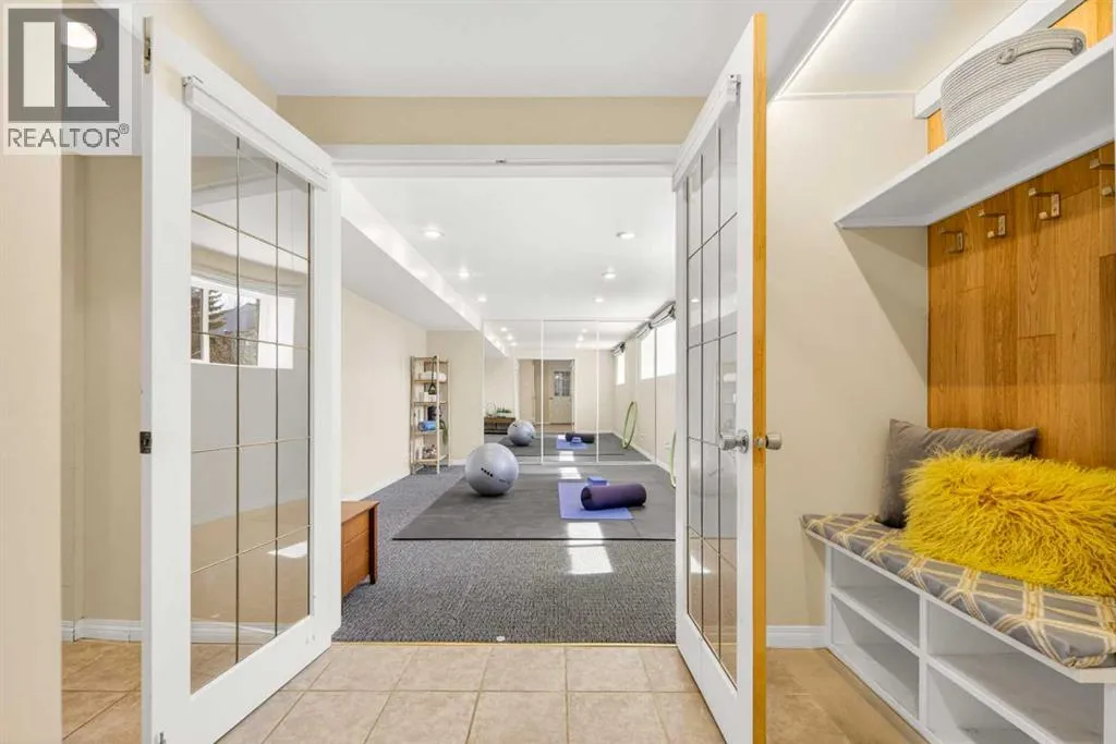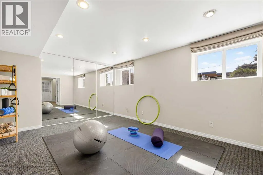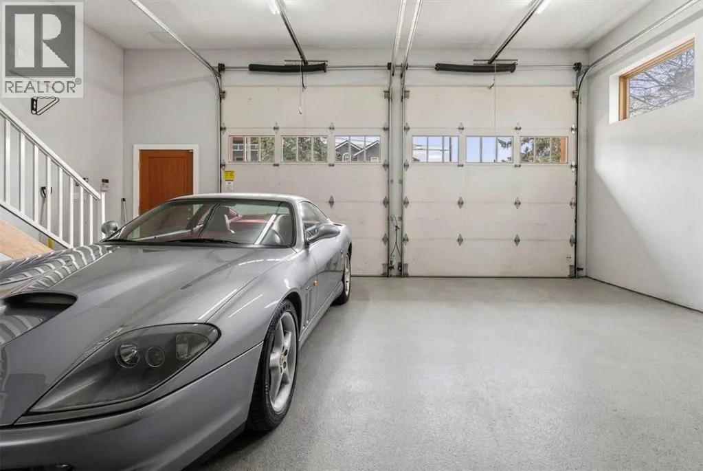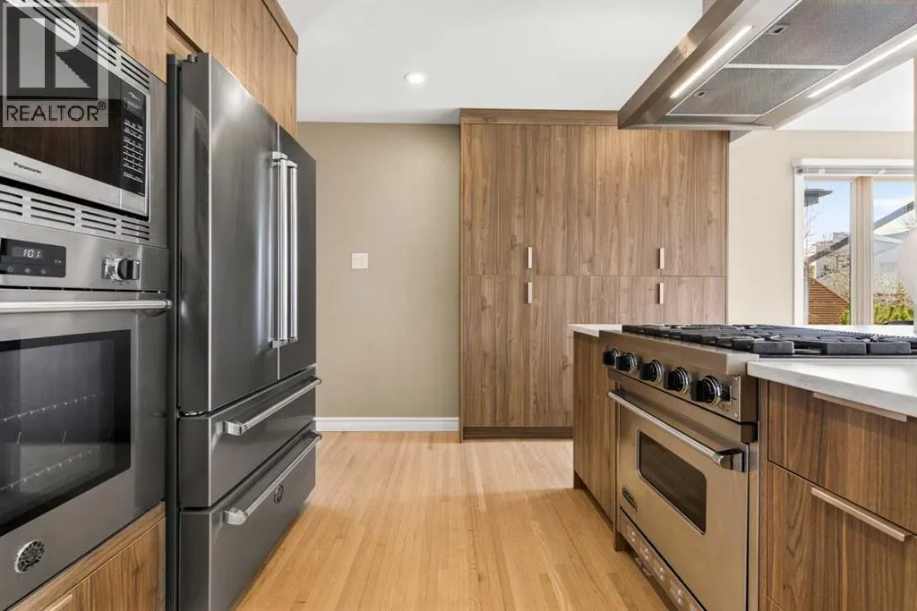 to execute the dramatic primary suite, while Marvel Kitchens designed the heart of the home, a sophisticated culinary hub focused on performance. It features a massive quartz island with glimpses of the downtown skyline, high-end appliances, clever cabinetry, and a dedicated coffee bar area. Adjacent, the Davignon designed studio, built over the garage space, is an exercise in intentional, architectural detail; defined by soaring ceilings and an expansive gas fireplace, this light-filled space offers independent front and back exterior access, serving effortlessly as a professional home office option or the home’s primary gathering hub. Ascend to the primary suite, a masterwork by William Blake Homes. The private balcony offers cinematic, dual-directional views of both the city skyline and the Rocky Mountains. A study in quiet luxury, the suite features 12ft vaulted ceilings, a sunroom, and a meticulous 5-piece ensuite where heated floors extend even into the shower, complemented by a deep soaker tub and heated towel rack. The remainder of the upper level houses 2 additional generously-sized bedrooms with substantial closets, and a large family bath, all positioned at the rear of the home for ultimate privacy. The lower levels are equally purposeful: the north side offers a self-contained retreat with a family room, bedroom, bath, kitchenette type space, and laundry, ideal for teens, nannies, or generational living. The south side transitions into the ultimate active base, featuring a home gym (or 5th bedroom) and a dedicated gear room for ski tuning, bike maintenance or stora ge, complete with a cold room for wine. This leads to the attached triple garage, a core feature for the collector, redefined with over-height ceilings to accommodate a car lift and an innovative tandem bay. Outdoor living is prioritized through a series of defined spaces, beginning with a partially covered, south-facing patio off the entrance that facilitates effortless alfresco dining or a glass of wine while taking in the views. The private, tiered backyard is an entertainment retreat featuring multi-level decking, a hot tub, elevated flat space to play, and a double parking pad off the back lane. The front yard presents a sophisticated, climate-conscious xeriscape for a low-maintenance lifestyle. Located within walking distance to amenities and offering rapid access to the Children’s and Foothills Hospitals, the U of C, The Calgary Winter Club and downtown, the home is finished with enduring materials, including a 50-yr blue metal roof, upgraded insulation, and an efficient multi-zoned heating system. (id:62650)