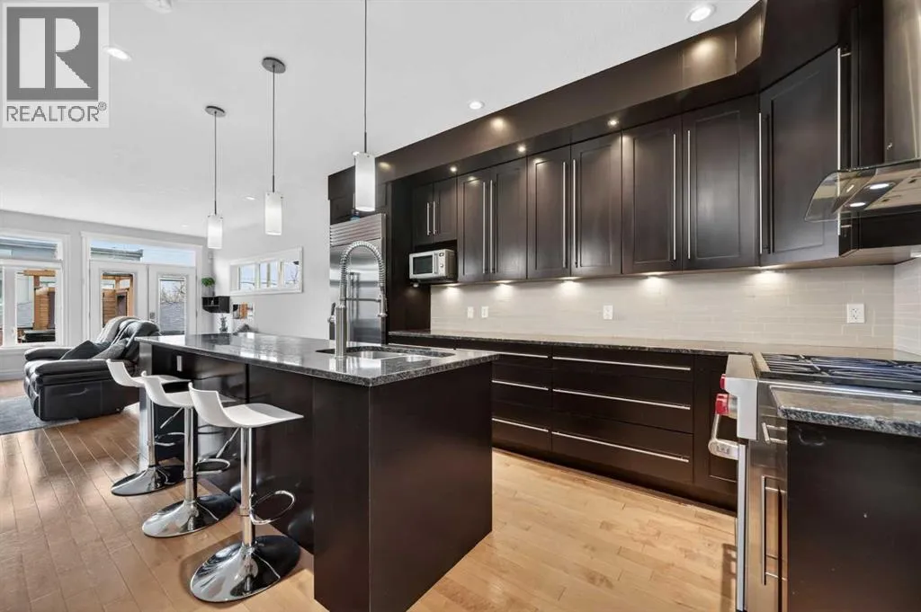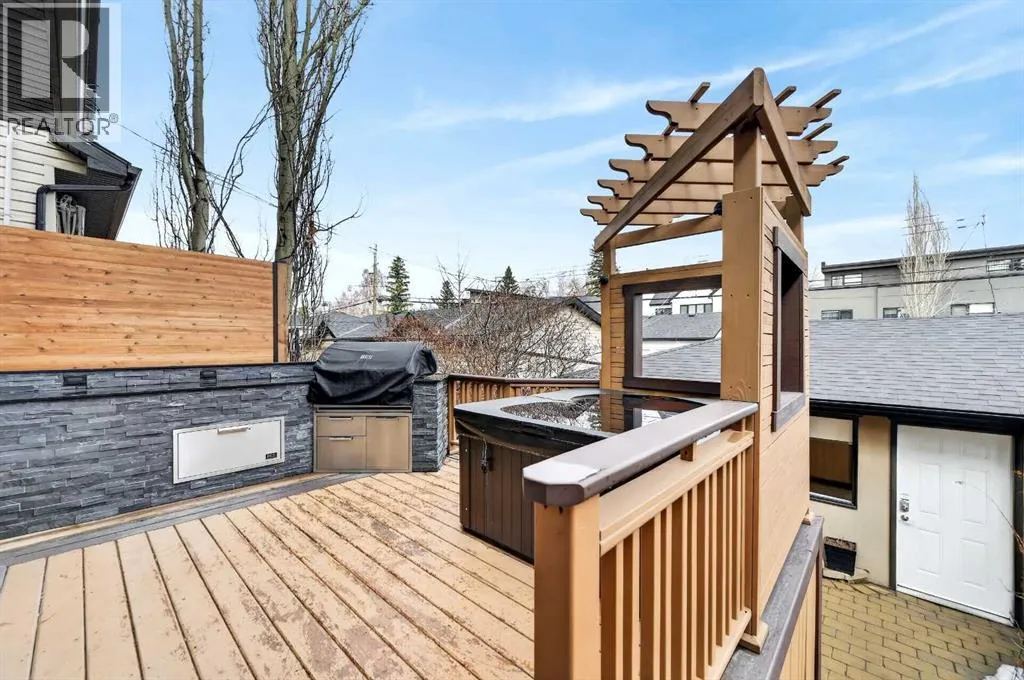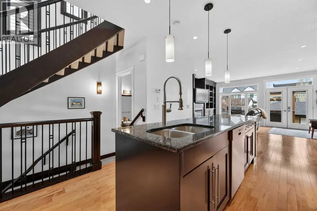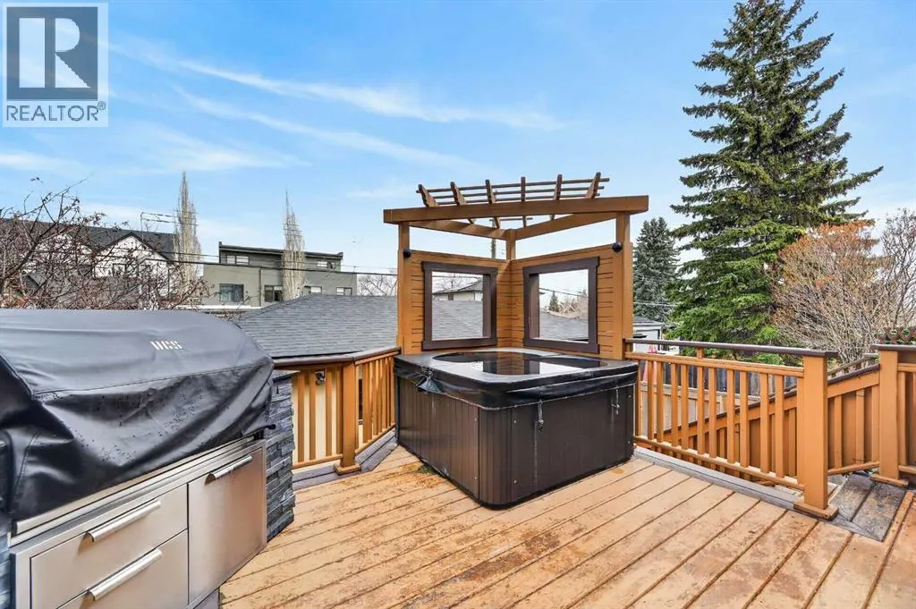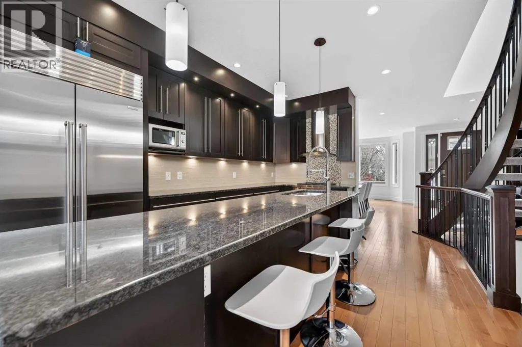 Hardwood Through the Main Level, Built-in Cabinetry and Wall Closets, 3 Gas Fireplaces. Front Entrance has Built-in Wall Closet and is Showcased by the Beautiful Curved Staircase. Large, Bright Dining Room is just off the Front Foyer and allows for use as stand-alone Dining Room or combination Dining Room with Sitting Area. The Gourmet Kitchen includes Top of the Line Appliances – Wolf Gas Range, Sub-Zero Fridge, Bosch Dishwasher – Beautiful Granite Countertops, Large Island with Built-in Wine Rack and Breakfast Bar, Richly Stained Cabinets. Kitchen opens to the Spacious Living Room with Built-In Cabinets and Shelving surrounding a Gas Fireplace. Breathtaking Primary Bedroom features Vaulted Ceiling, Wall-to-Wall Built-in Closet, Balcony for Morning Coffee or Evening Glass of Wine, Beautiful Two-Sided Gas Fireplace that is shared with the Gorgeous Ensuite – Large, remodeled Shower, Dual Vanities. Two Good-Sized Bedrooms, Main 4 Piece Bathroom and Laundry complete the Upper Level. Basement is Developed to same High Standards as the rest of the Home – Great Family Room with more Built-in Cabinetry and 3rd Gas Fireplace, Wet Bar, Built-In Speakers plus Full 4 Piece Bathroom and a 4th Bedroom which is perfect for Teenagers or Guests. Low Maintenance Backyard starts with the Raised Deck with Built-In BBQ Centre & Warming Oven, Hot Tub & Privacy Screen accessed from the Living Room. Under Deck Storage, Double Detached Garage, Paved Back Alley and Exposed Concrete Front Walkway. But this is Not All! In the past few years the owners have replaced the Furnace, installed a Tankless Water System, installed a R adon Mitigation System, Air Exchanger was set up, Primary Shower was Redone, Rebuilt the Built-in BBQ area with new BBQ, Installed 40 year Shingles in 2024 plus replaced the Washer, Dryer & Dishwasher. This Wonderful Family Home is located within walking distance to the Altadore School, Parks plus trendy Marda Loop restaurants & shops and much more! Easy access in and out of the community. This is a winner! (id:62650)