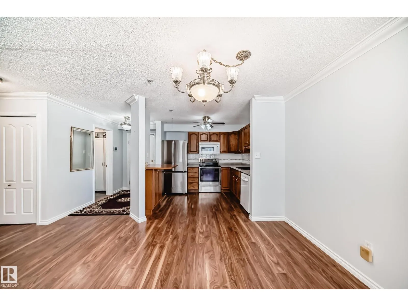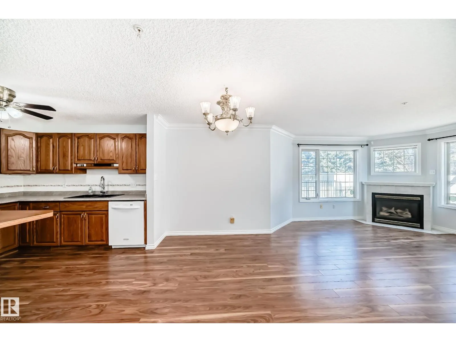 Welcome to this beautifully upgraded 2-bedroom main floor CORNER condo w/ 995 sq. ft. of bright, inviting living space. Enjoy newer laminate flooring throughout, including the kitchen featuring abundant cabinet & counter space. The open-concept layout flows seamlessly from the kitchen into the dining area & spacious living room, highlighted by lots of windows & a cozy corner gas fireplace.