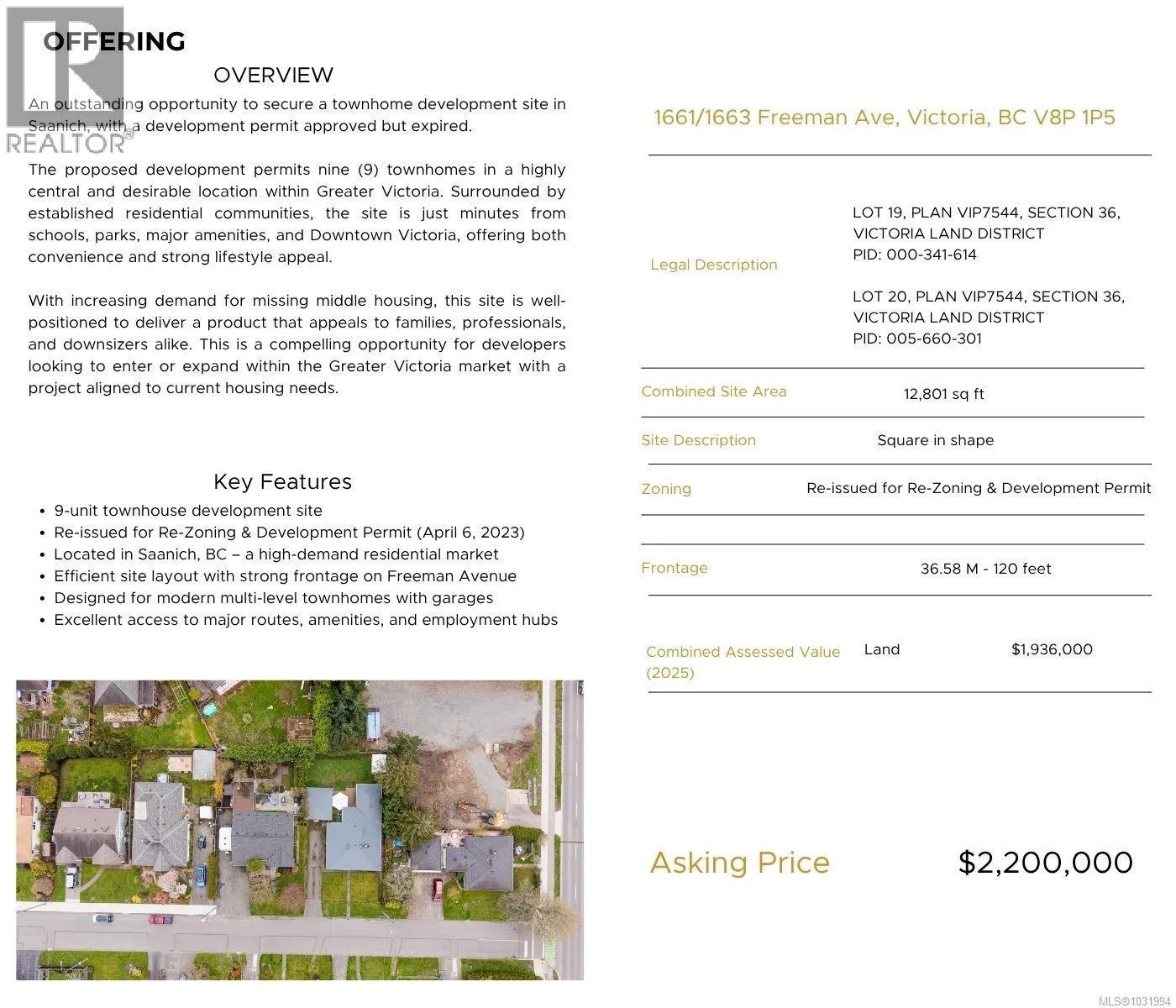 An outstanding opportunity to secure a townhome development site in Saanich, with a development permit approved but expired. The proposed development permits nine (9) townhomes in a highly central and desirable location within Greater Victoria. Surrounded by established residential communities, the site is just minutes from schools, parks, major amenities, and Downtown Victoria, offering both convenience and strong lifestyle appeal.