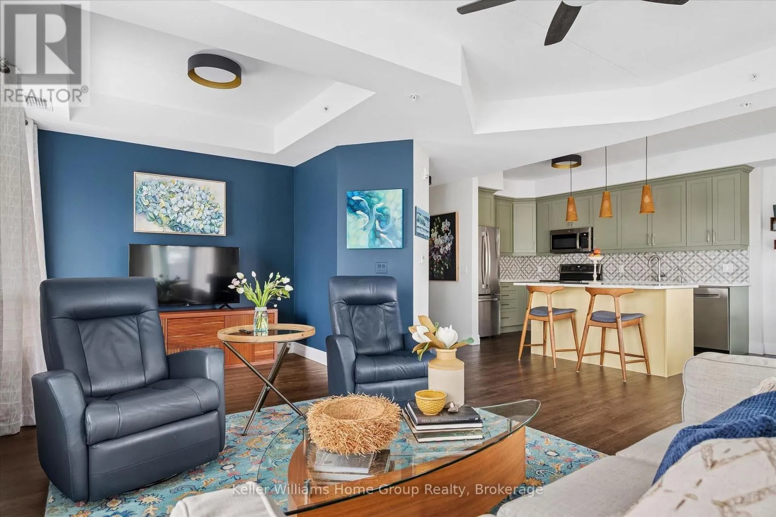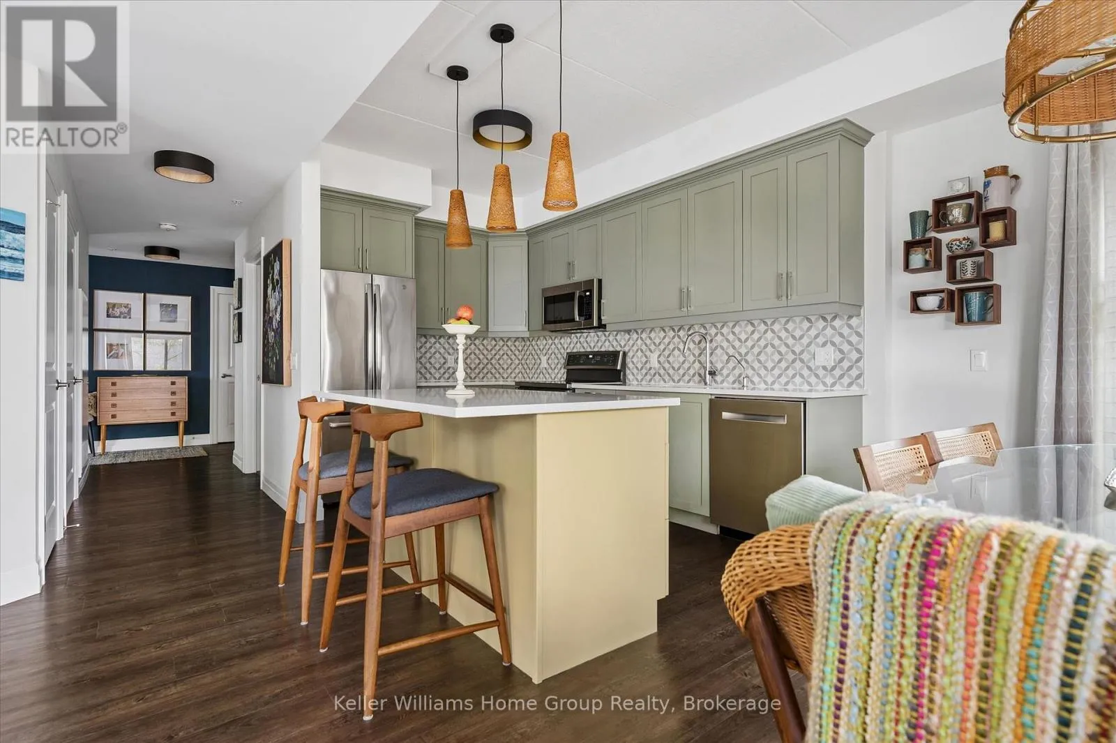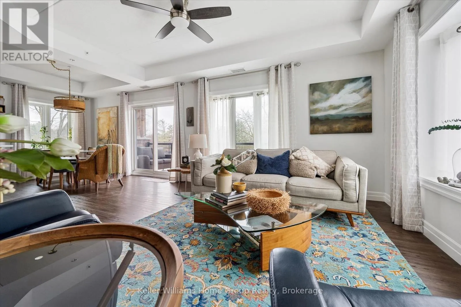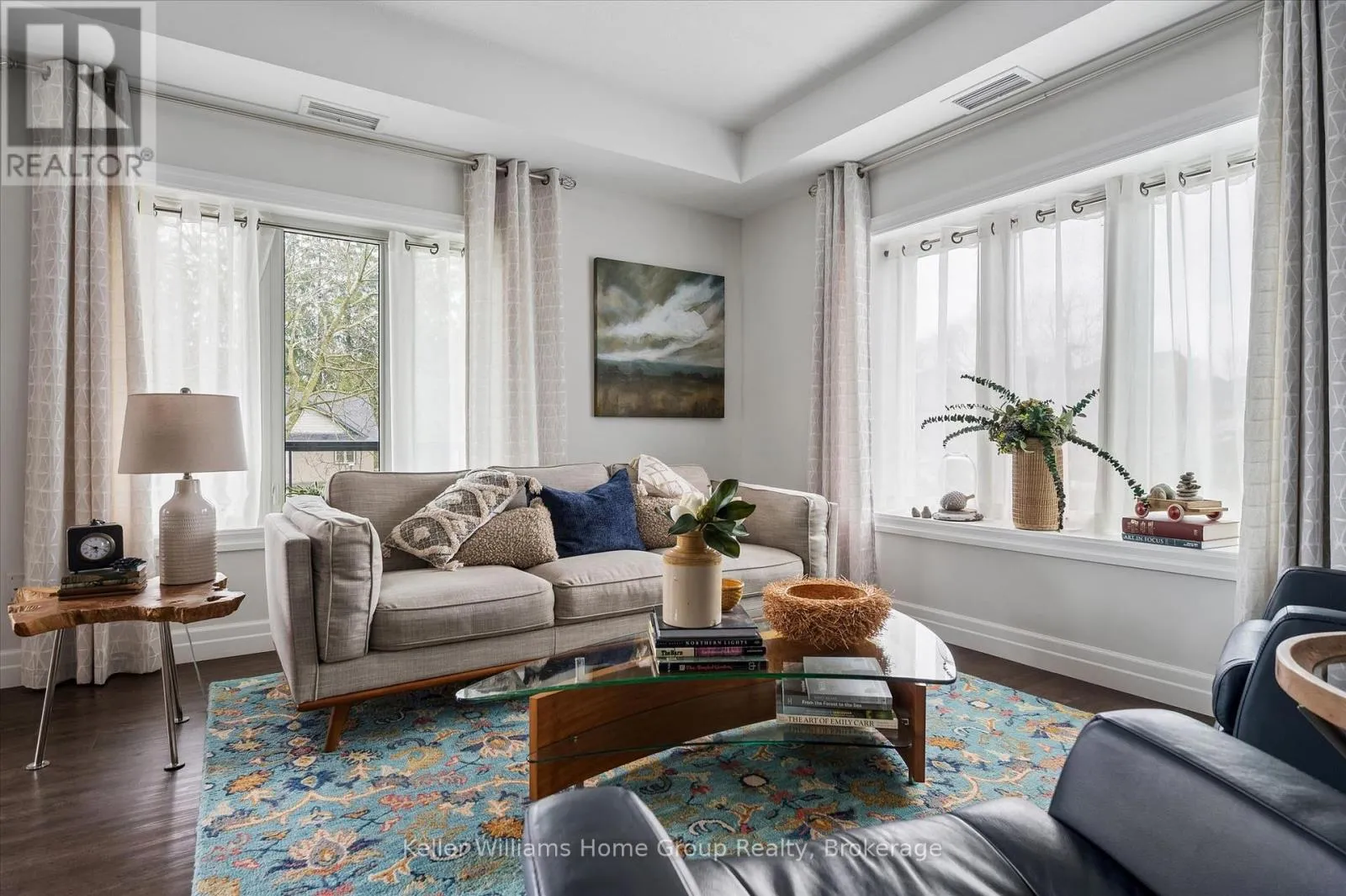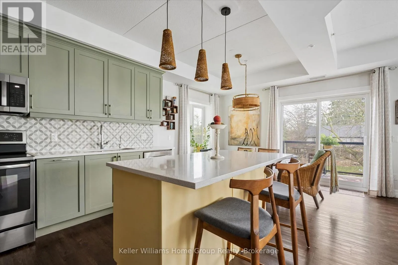 Welcome to this stunning, light filled end unit condo offering 1200+ square feet of beautifully designed living space. With windows on three sides and a smart, open layout, the suite delivers an airy, modern feel wrapped in timeless, high quality finishes. The sleek kitchen anchors the main living areas and features an induction stove, reverse osmosis water filtration system,