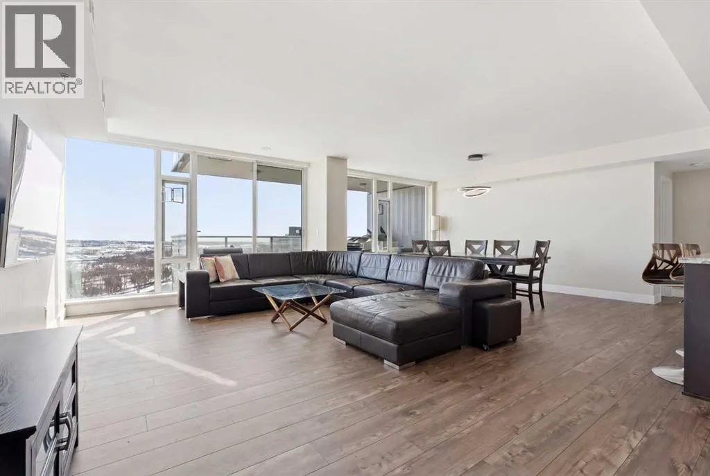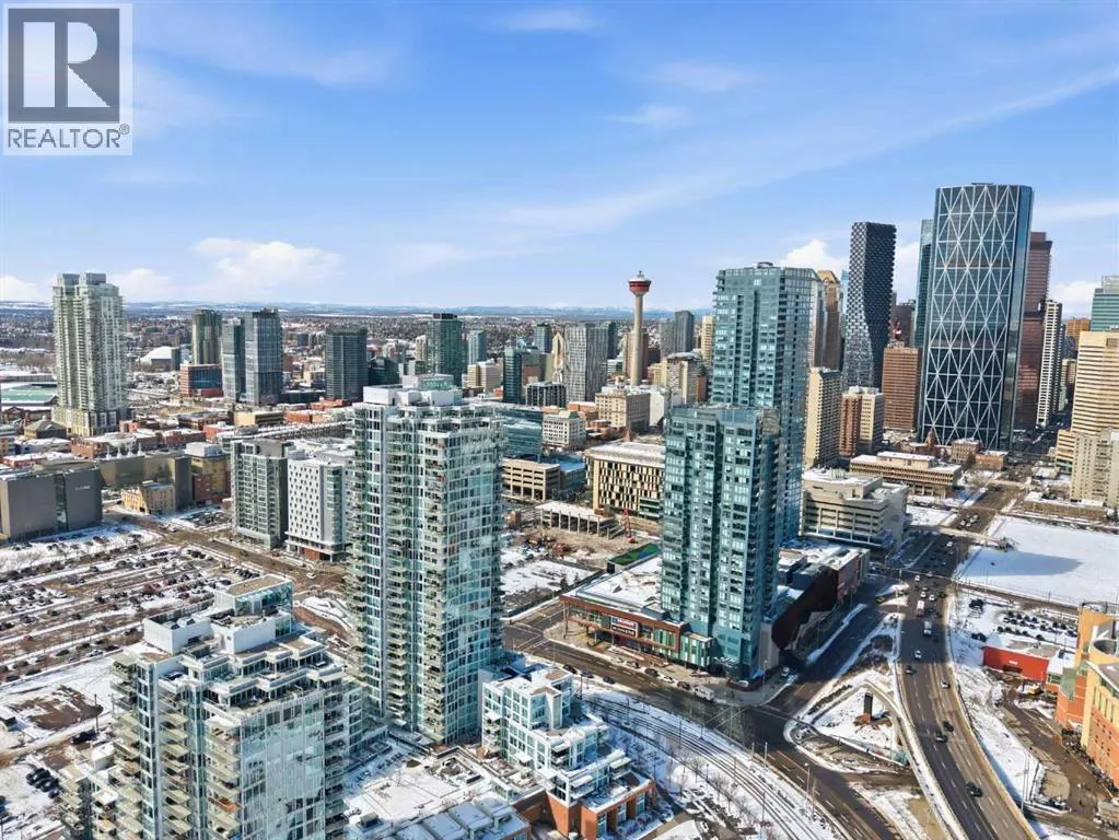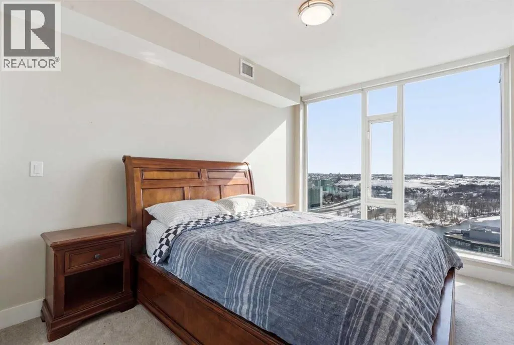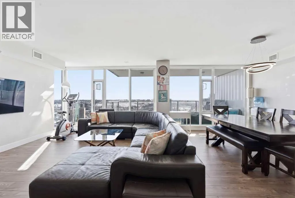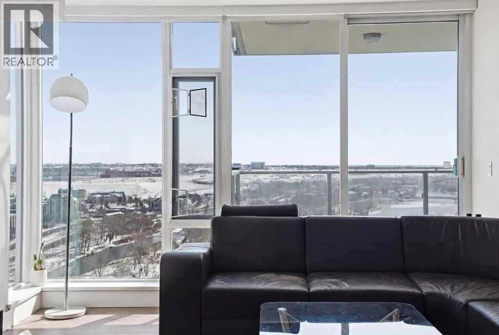 Exceptional and stunning three-view panorama from the 27th floor, showcasing the Mountain, Bow River, and Downtown skyline. This luxurious, generously proportioned two-bedroom, two-bath residence offers an open-concept 1,200+ SF of living space with floor-to-ceiling glass that reveals dramatic vistas throughout the day. The morning sun pours through the east-facing, air-conditioned suite, waking a generous living-dining space that flows into