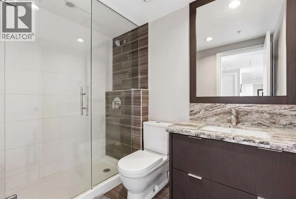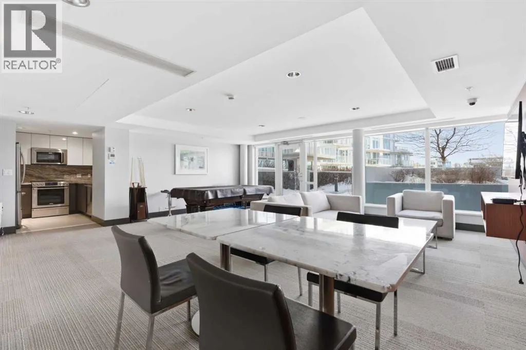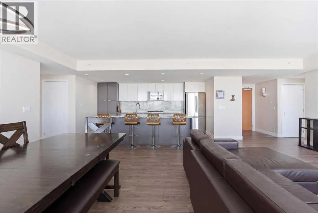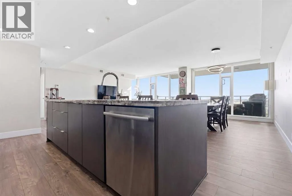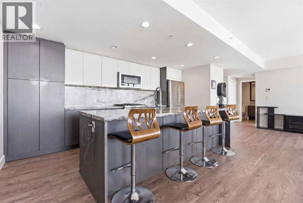 Exceptional and stunning three-view panorama from the 27th floor, showcasing the Mountain, Bow River, and Downtown skyline. This luxurious, generously proportioned two-bedroom, two-bath residence offers an open-concept 1,200+ SF of living space with floor-to-ceiling glass that reveals dramatic vistas throughout the day. The morning sun pours through the east-facing, air-conditioned suite, waking a generous living-dining space that flows into