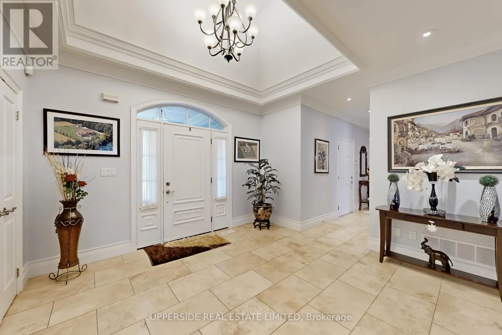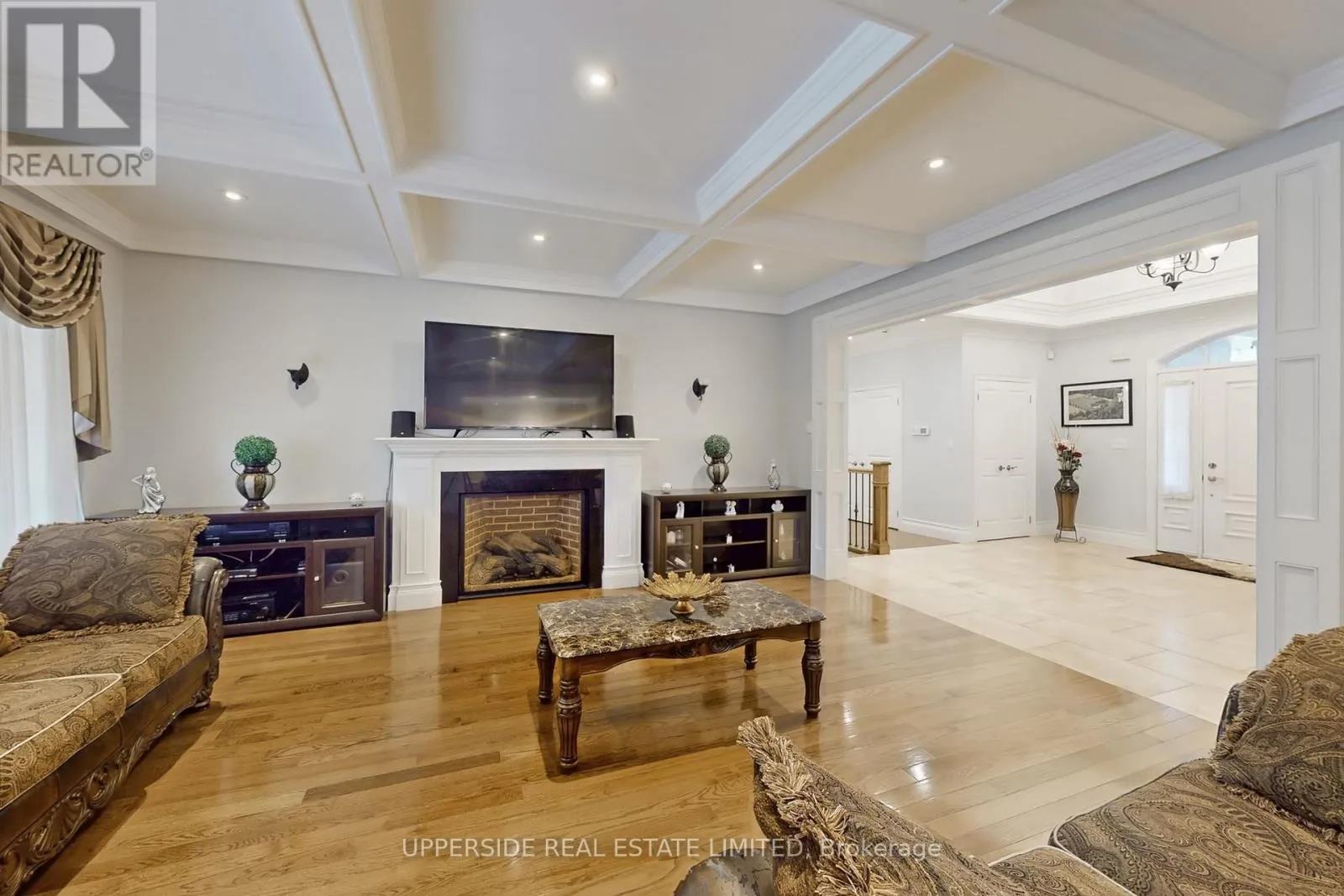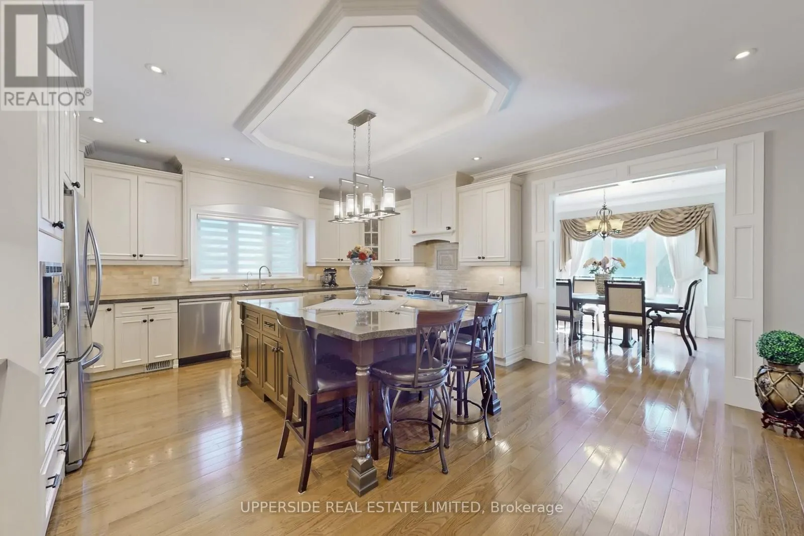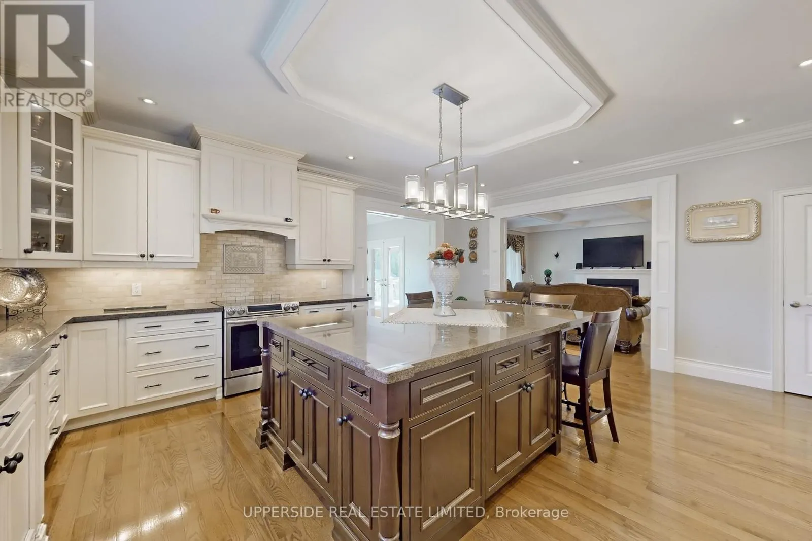 This elegant bungalow has everything today’s buyer could wish for-beautifully finished and move-in ready. Behind striking double iron gates, the full stone exterior and exquisite landscaping create an impressive first impression. Inside, coffered ceilings, rich crown moldings, and custom details flow throughout a layout designed for both family living and refined entertaining.The inviting family room with fireplace opens to a