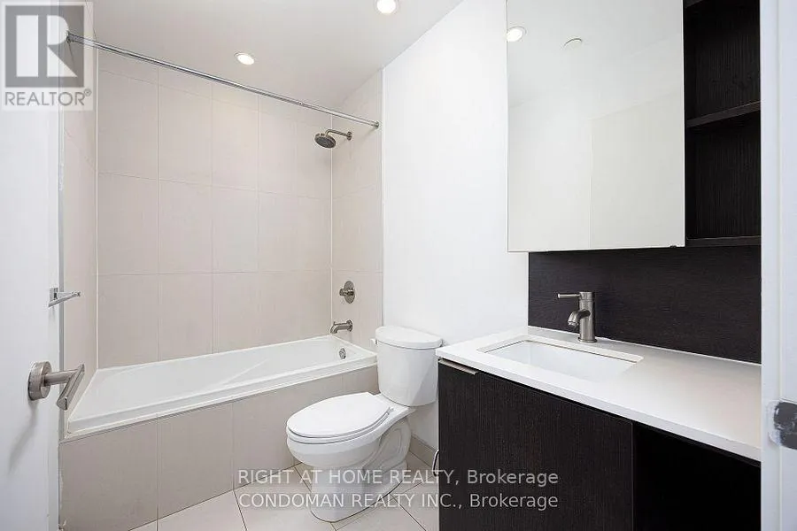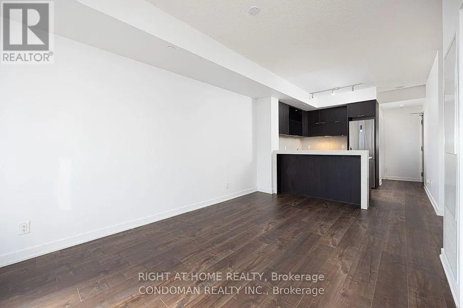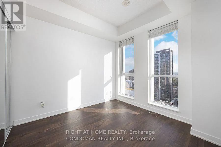 Beautiful, open view from the 23rd floor & perfect rectangular layout! Enjoy gorgeous open city view from your large balcony. Sleek, dark finishes including built in high-tech appliances, wide-plank cocoa flooring& waterfall Quartz Island!! Ideal layout w Living&dining area, window in bedroom & fits queen, balcony fits table/chairs. Includes one parking & locker. Shows like a model suite in the