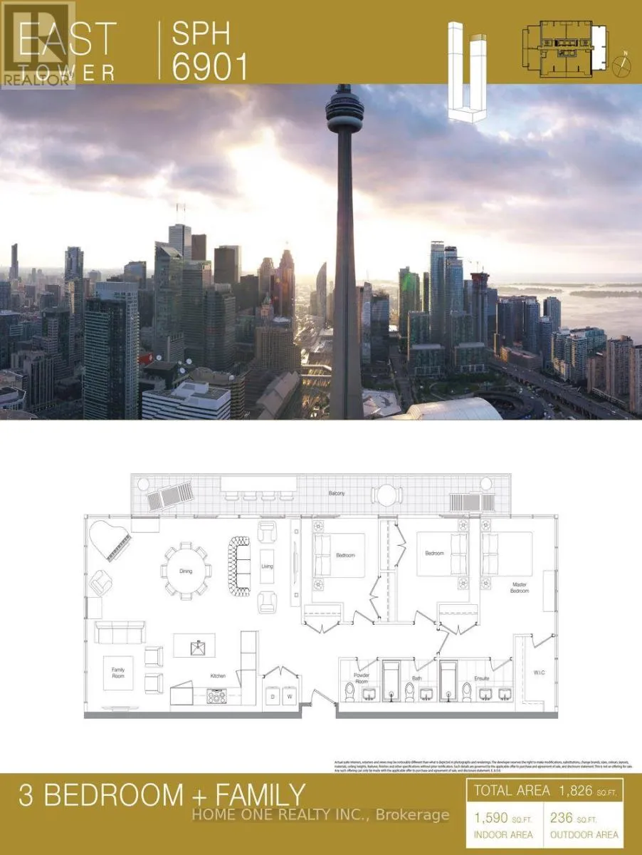Experience luxury living at Canada House with this stunning penthouse offering unobstructed panoramic views of Lake Ontario and the iconic Rogers Centre / CN Tower. This spacious 3-bedroom + family layout features approximately 1,590 sq.ft. of refined interior space plus a generous 236 sq.ft. balcony, perfect for enjoying breathtaking sunrises and city skyline views. Designed for both comfort and
