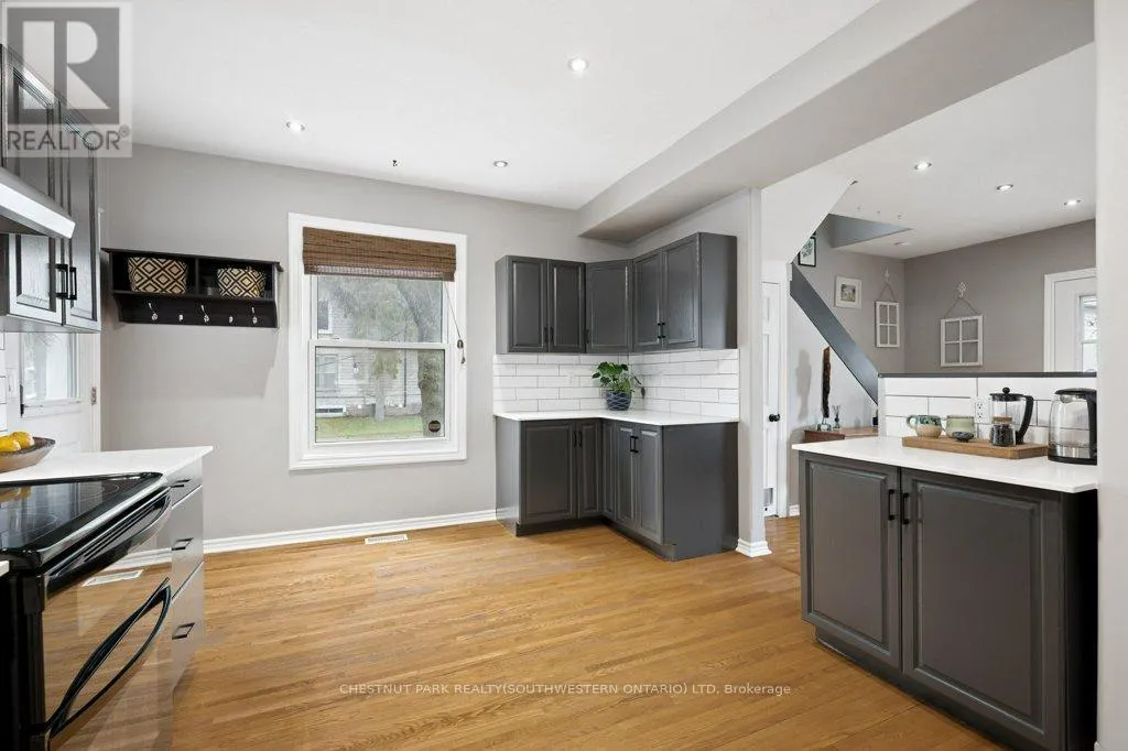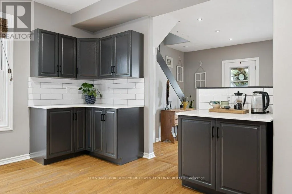 that makes hosting easy with plenty of space for a large dining table. Upstairs, you’ll find three well- sized bedrooms and a four piece bathroom. Step outside and you’ve got options: a north facing front porch for morning coffee, a side porch for evenings with friends, and a fully fenced backyard with room to grow into. The large garage is a nice bonus in this area. The big ticket updates are already done, including windows, updated wiring, central air, and a forced air furnace, so you can focus on settling in rather than spending right away. Walk to your favorite coffee shop, grab a drink with friends, or spend your weekends at the Kitchener Market. Enjoy neighbourhood events, arts markets and porch parties. This is the kind of neighbourhood people move into and stay in. (id:62650)