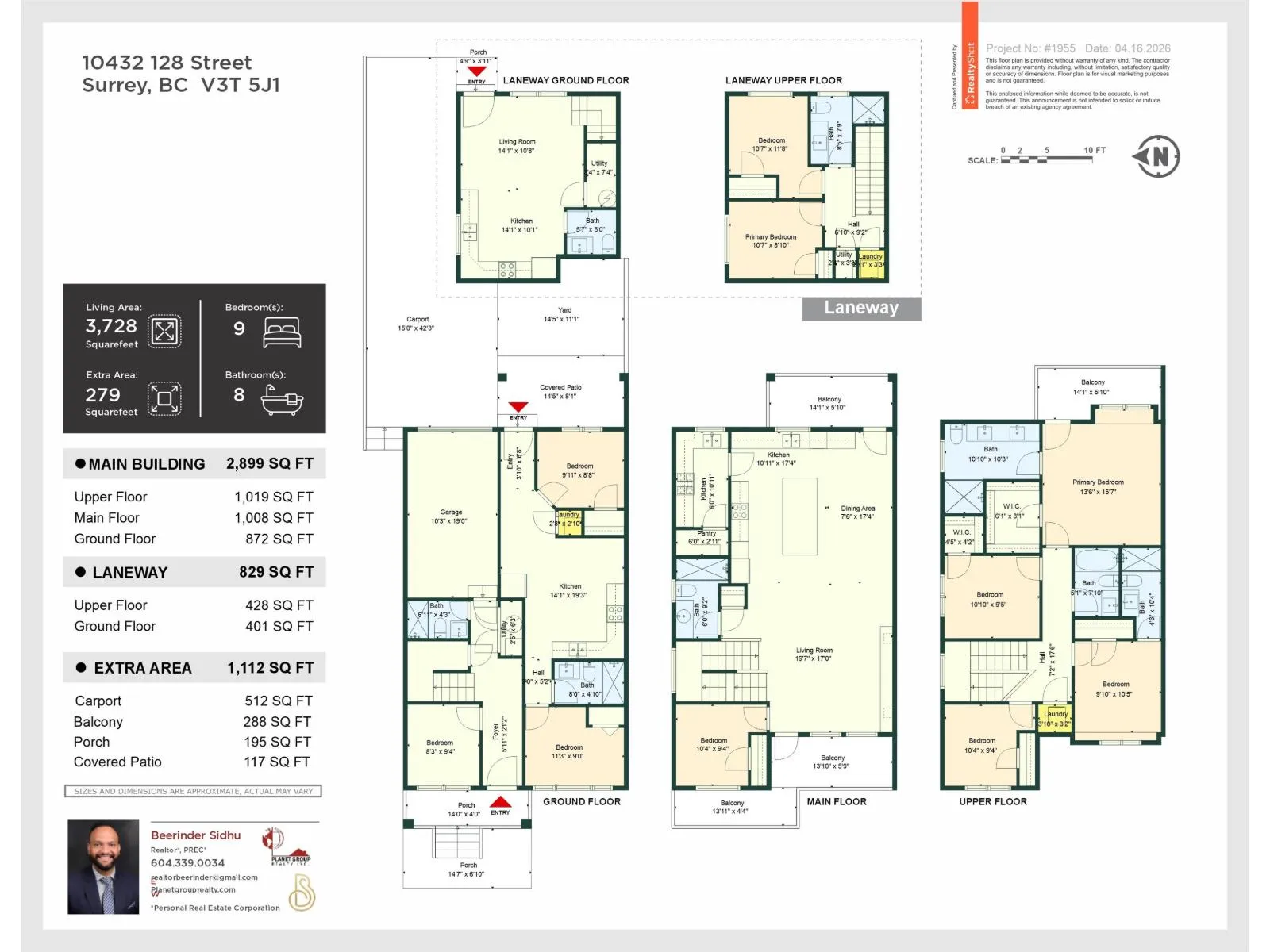 Brand new 3-level STRATA 3135 SQFT 1/2 duplex & 789 sqft Garden suite situated on 3595 sqft Lot with back lane access. 7-bed,6-bath with den on main level. Forced air heat with Air condition. bus stop at front of unit & Close to both schools, shopping and skytrain. Main floor features open concept living, dining, kitchen, spice kitchen with stainless