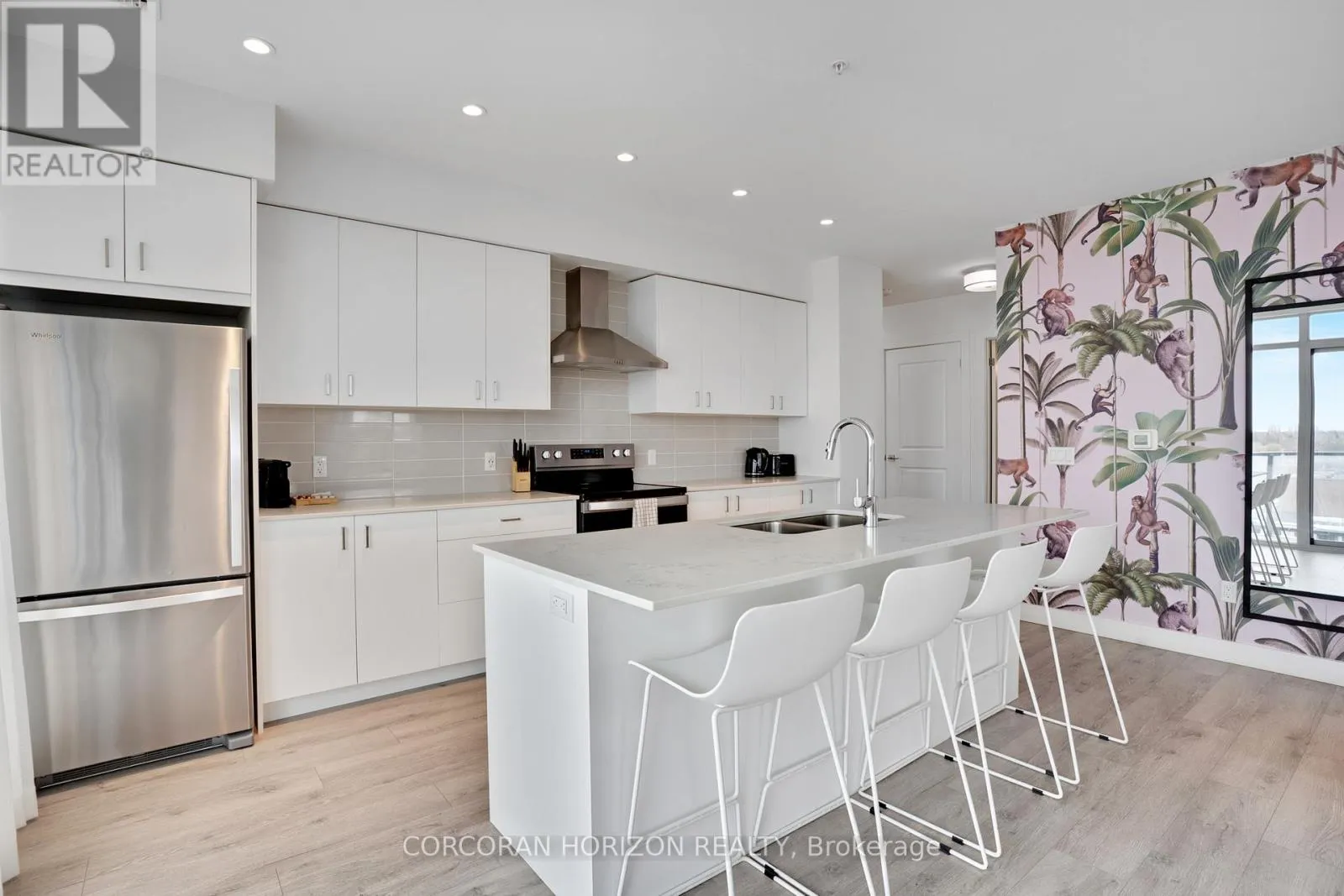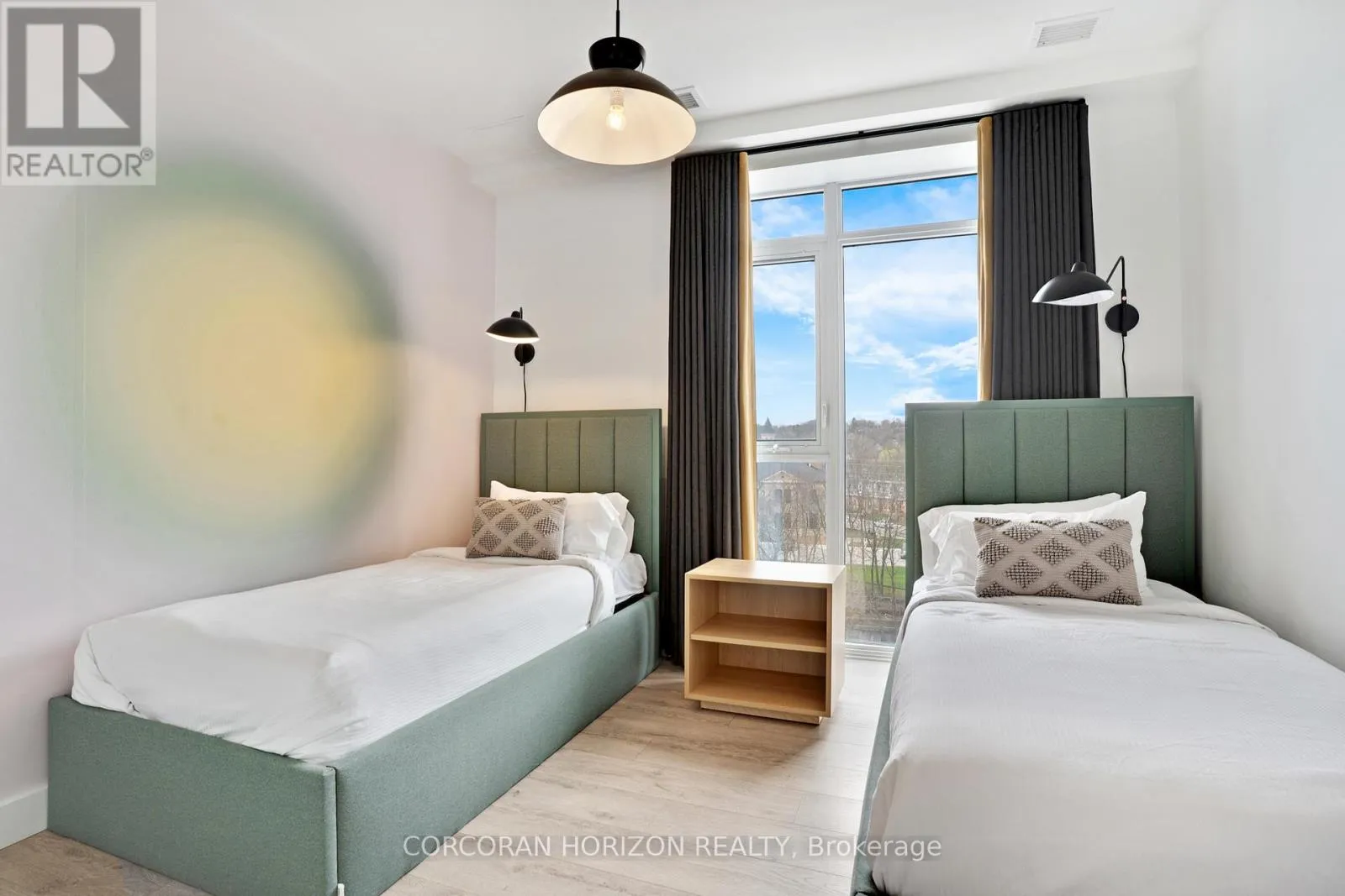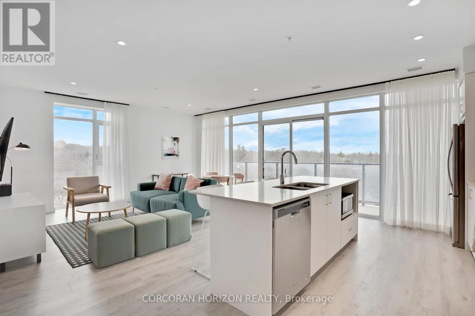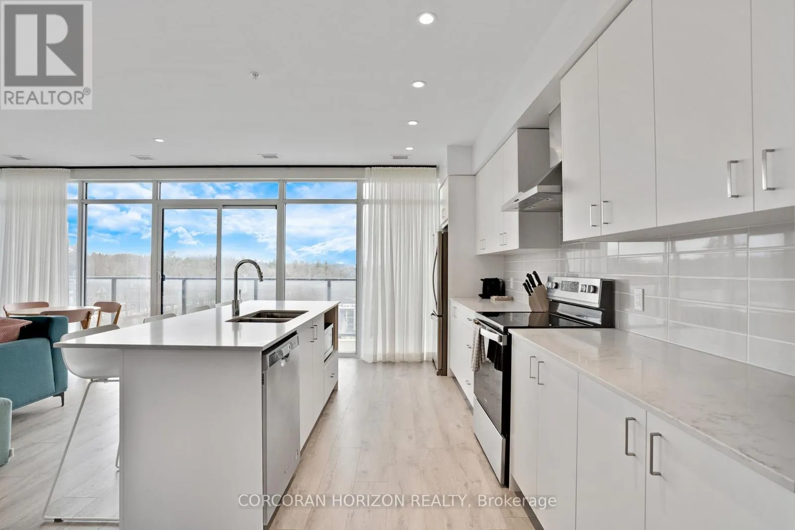 Unit 802 at 15 Glebe Street is a beautiful fully furnished 2-bedroom, 2-bathroom condo in the heart of Cambridge’s Gaslight District, offering 1,126 sq. ft. of comfortable living space with views of the city. The open-concept layout is complemented by 9-foot ceilings that give the space a bright, generous feel throughout. The kitchen and dining area feature shaker-style cabinetry, quartz