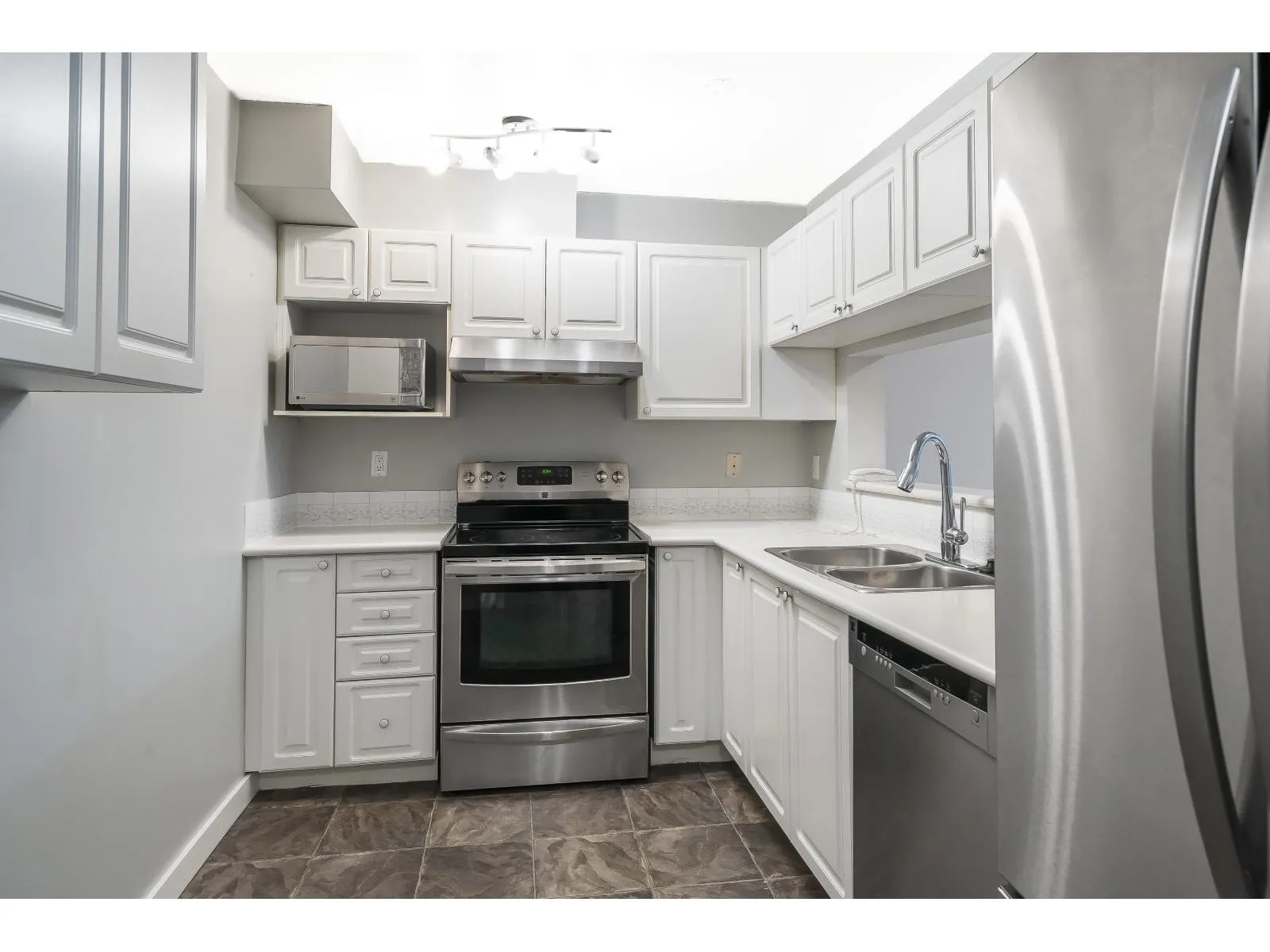 Top floor corner unit in the heart of Fleetwood. Featuring laminate flooring, updated appliances (fridge, dishwasher, hood fan), new light fixtures and switches, new blinds, refurbished fireplace, new faucets & toilets, added kitchen pantry, new garburator, updated CO2/smoke detectors, and mirrored closet doors. Bright, functional layout . Vacant and quick possession possible. Walnut Road Elementary and Fleetwood Park