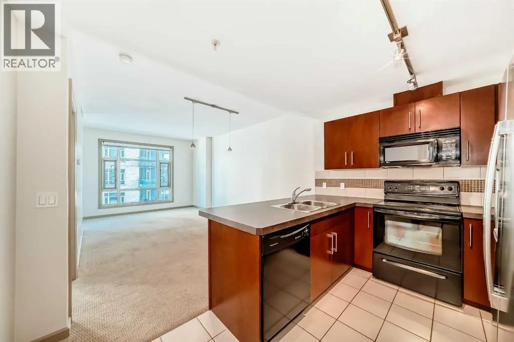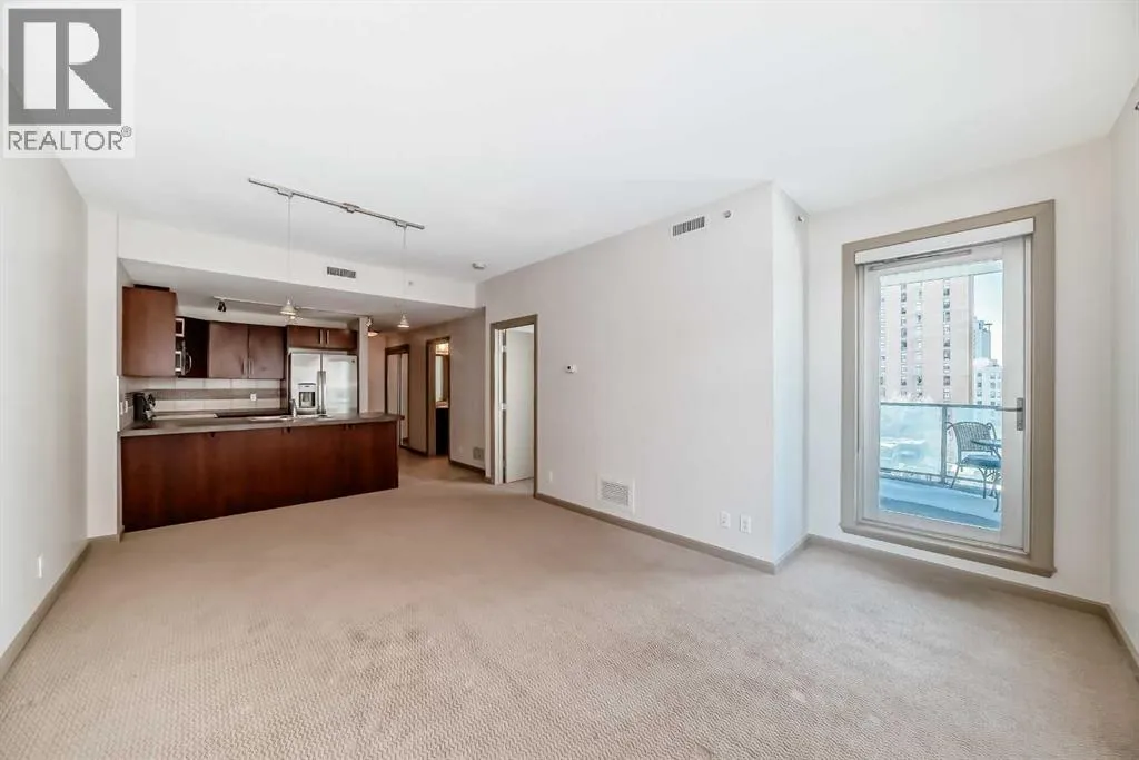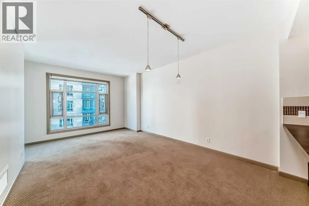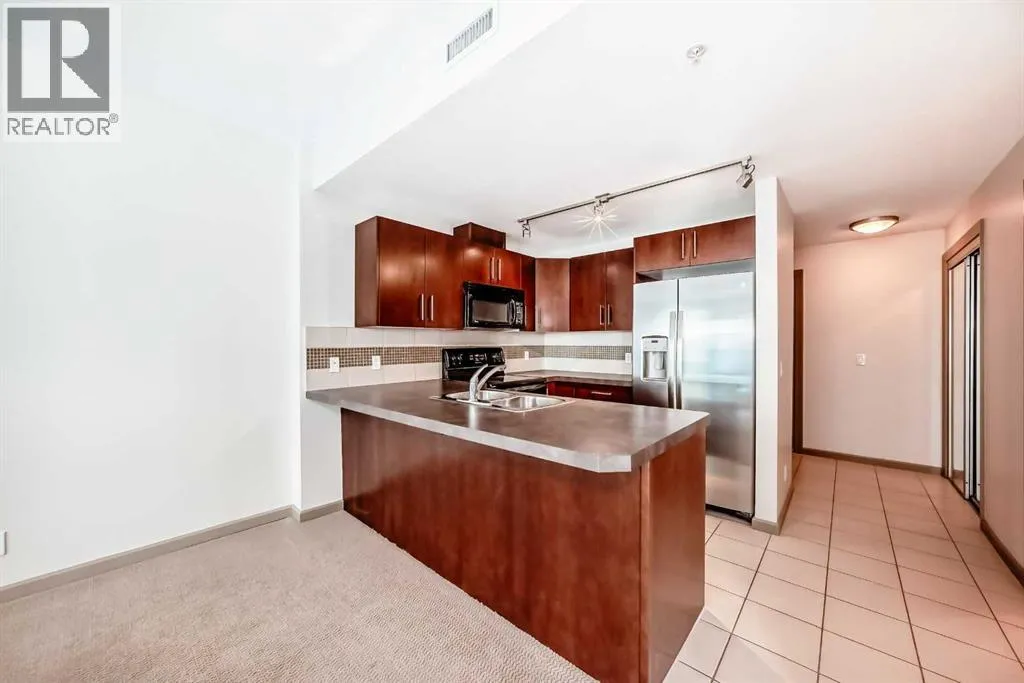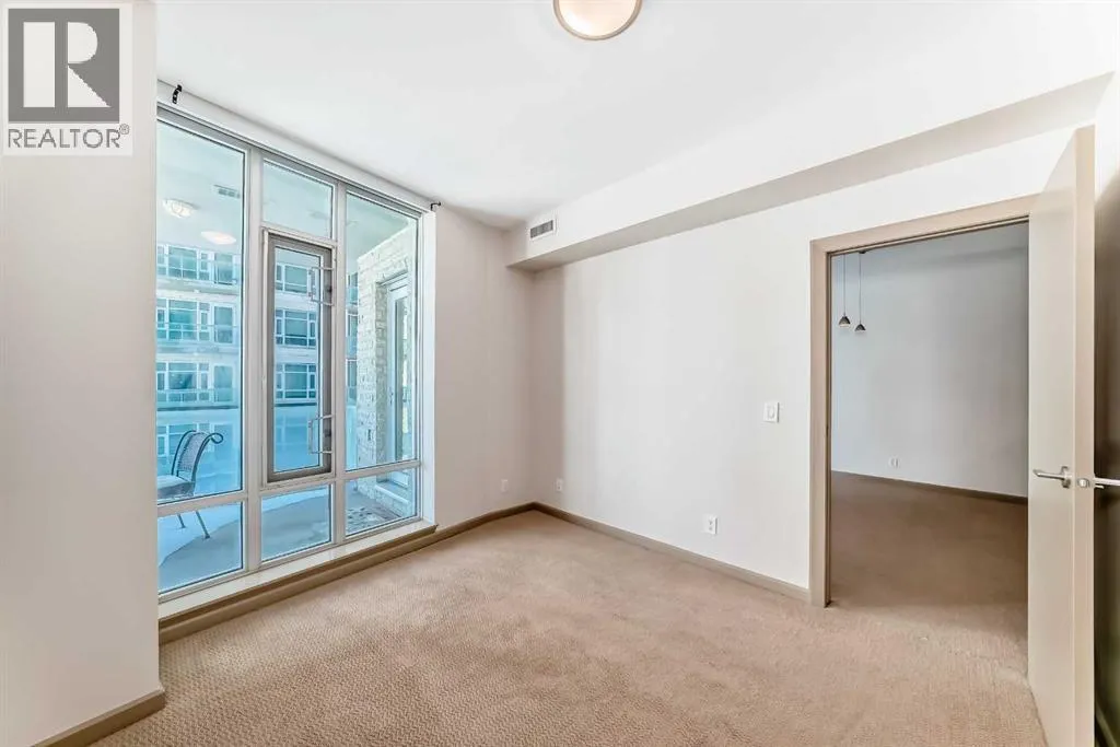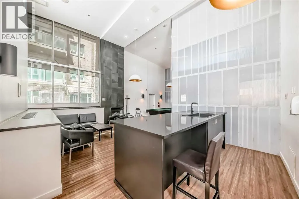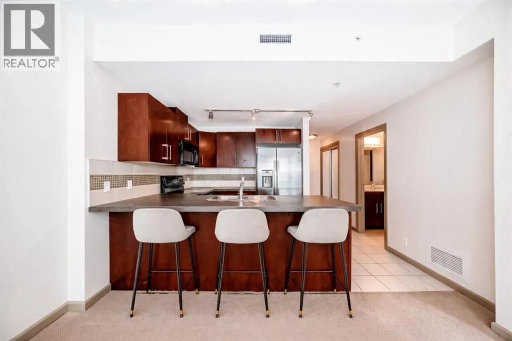 Welcome to this spacious and well-appointed 1-bedroom condo in the sought-after VETRO building, ideally located in the heart of Calgary’s vibrant Beltline. This open-concept unit offers a functional layout with 9-foot ceilings, creating a bright and airy living space perfect for both everyday living and entertaining.The kitchen features ample cabinetry, generous counter space, and a convenient breakfast bar that seamlessly