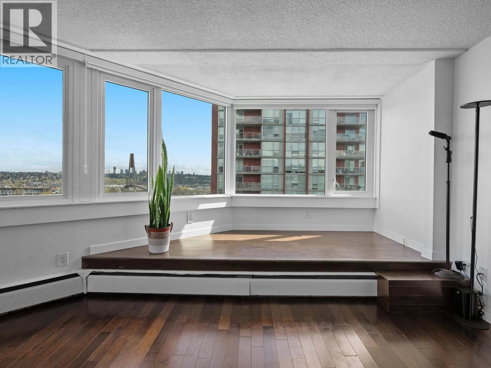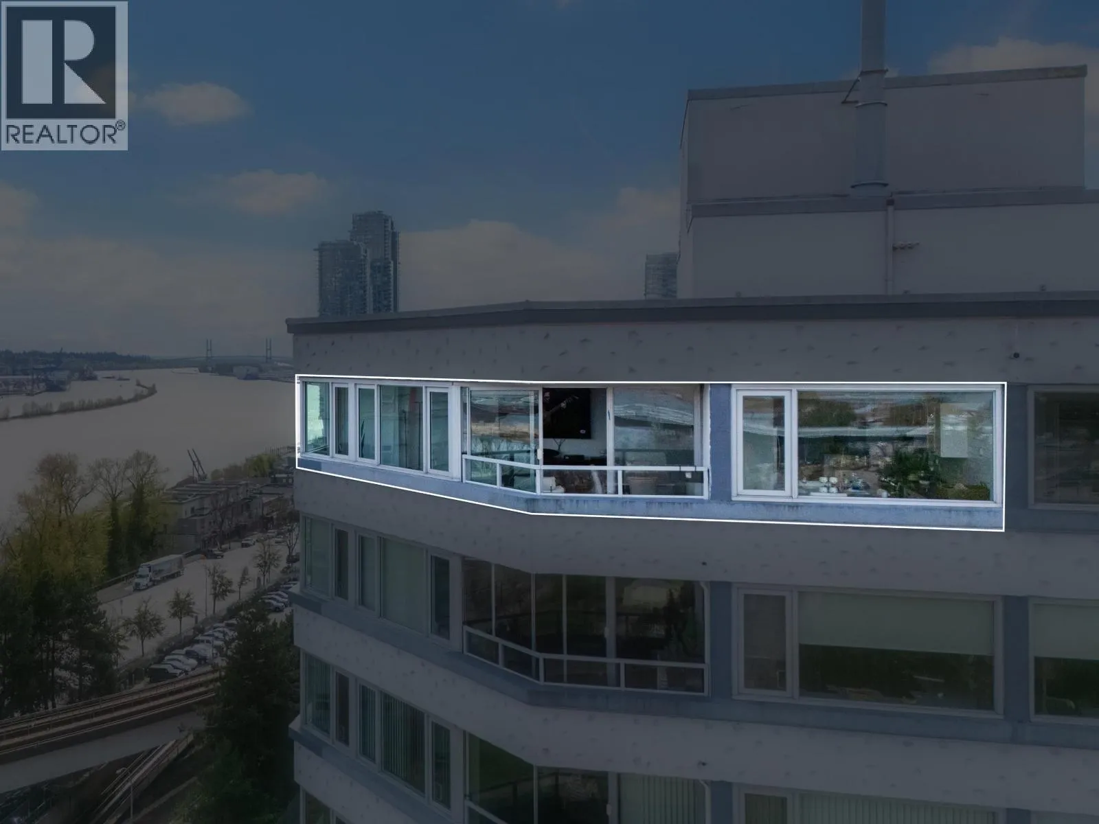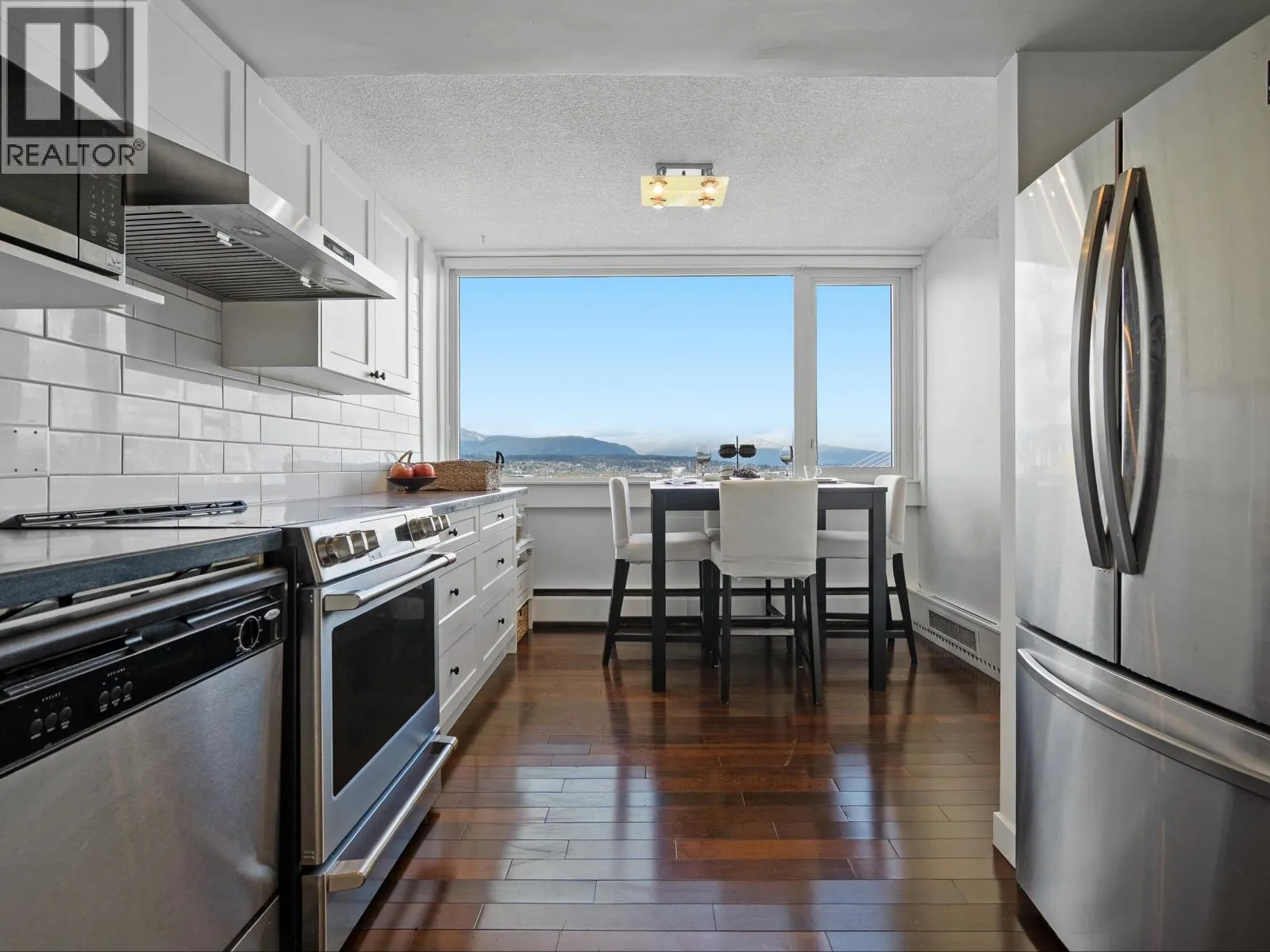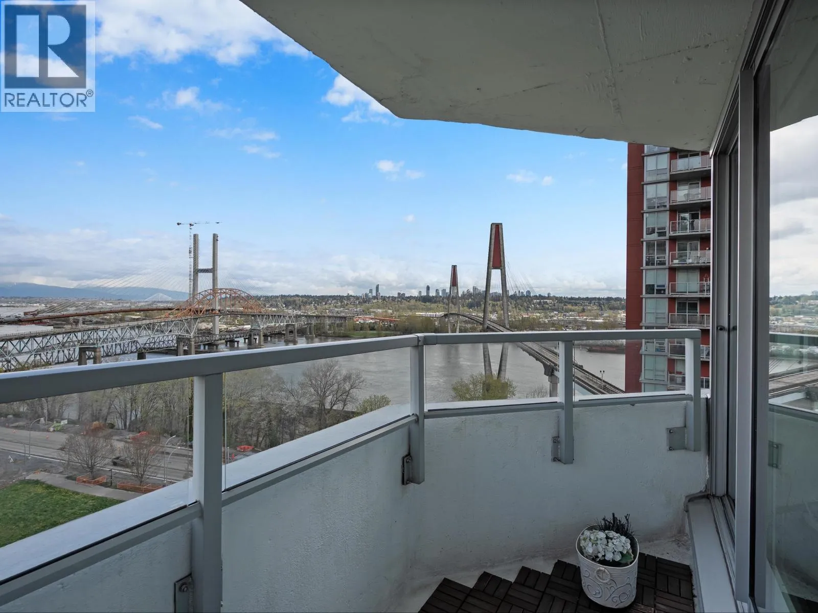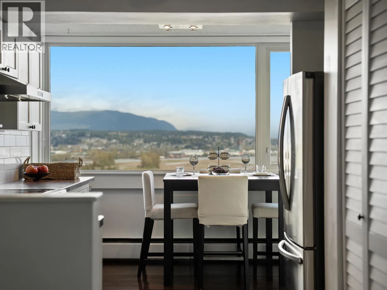 Spacious penthouse living with stunning 180-degree views in downtown New West! One of only 3 top floor units offering panoramic water, mountain and city views with sought-after southwest exposure. Updated home features two balconies, engineered hardwood floors, upgraded stainless steel appliances and in-suite laundry. Spacious primary bedroom offers two large closets, while the second bedroom functions perfectly as a home