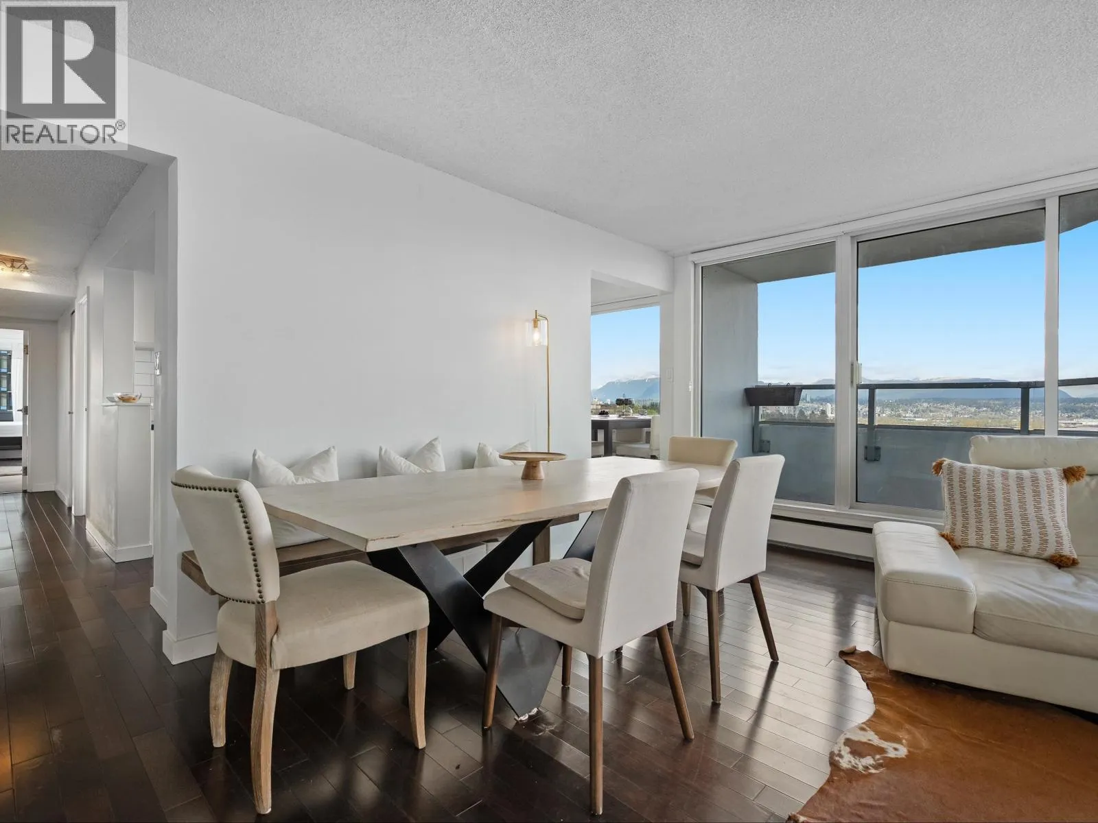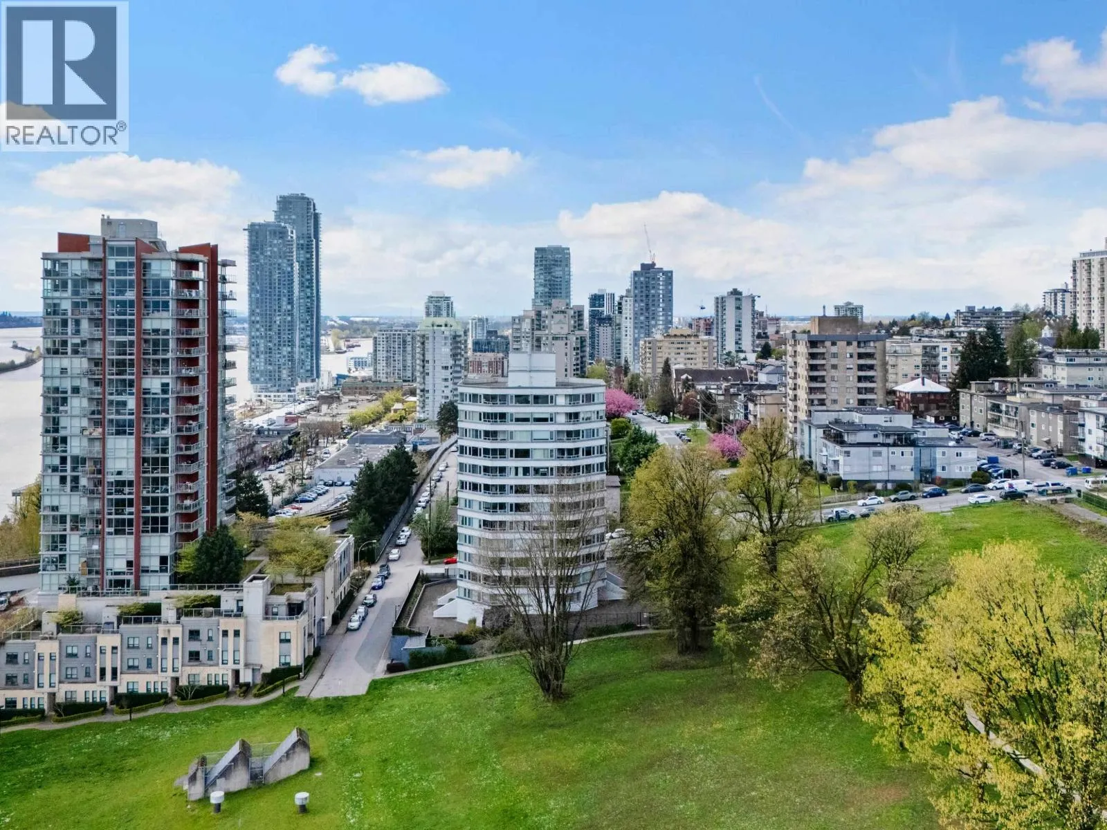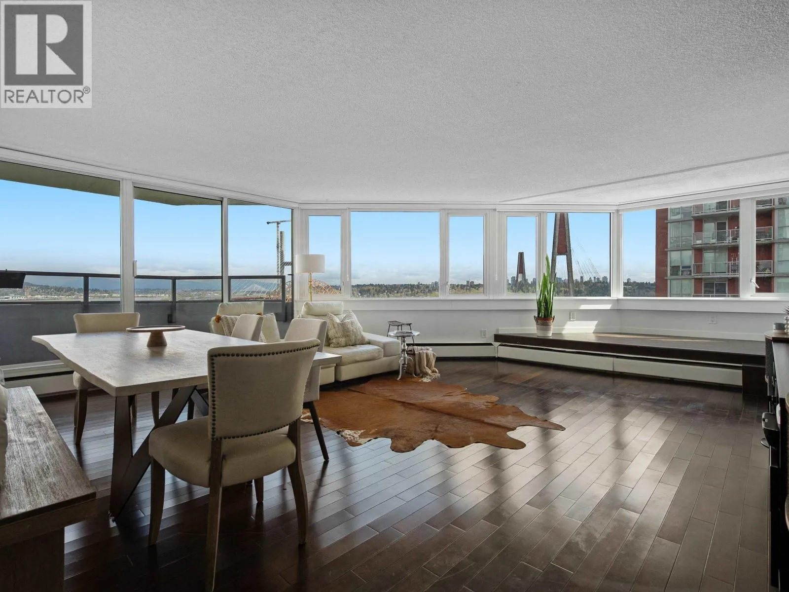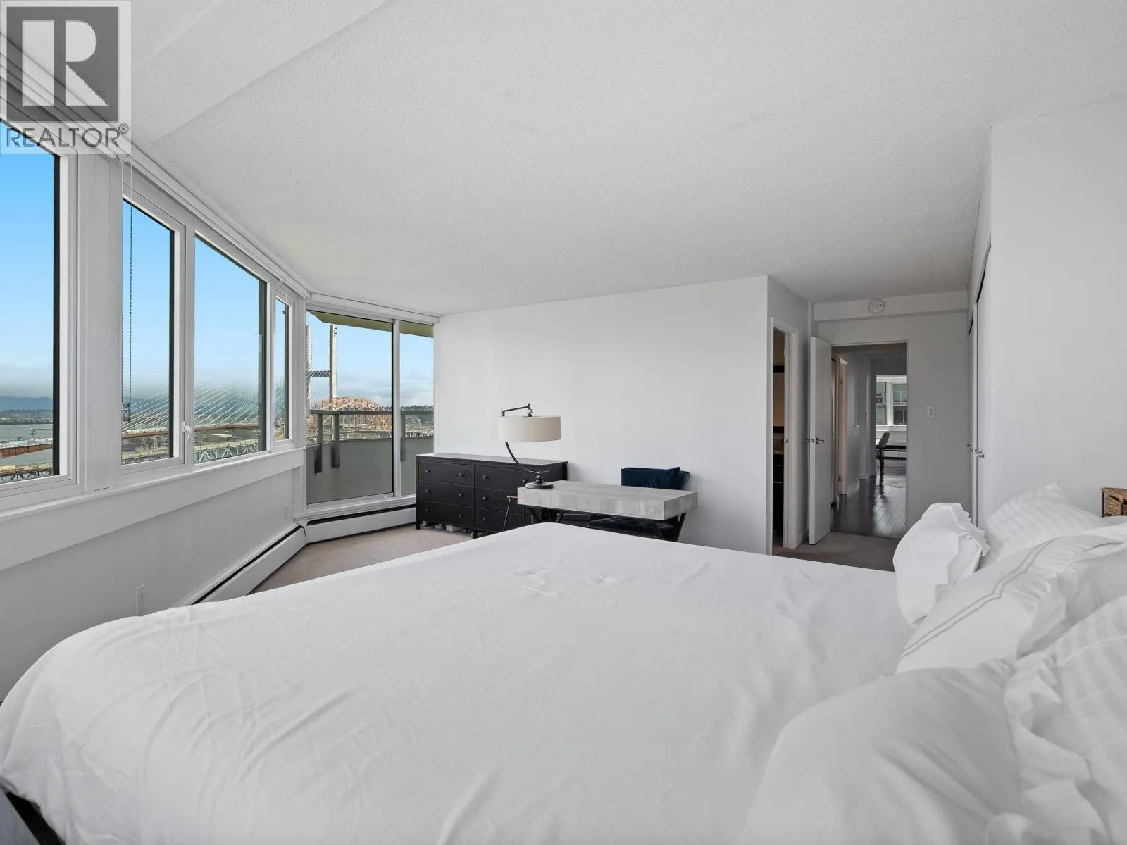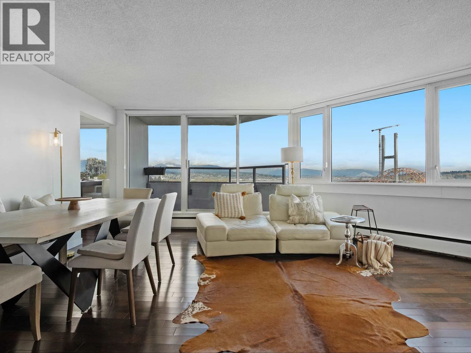 Spacious penthouse living with stunning 180-degree views in downtown New West! One of only 3 top floor units offering panoramic water, mountain and city views with sought-after southwest exposure. Updated home features two balconies, engineered hardwood floors, upgraded stainless steel appliances and in-suite laundry. Spacious primary bedroom offers two large closets, while the second bedroom functions perfectly as a home