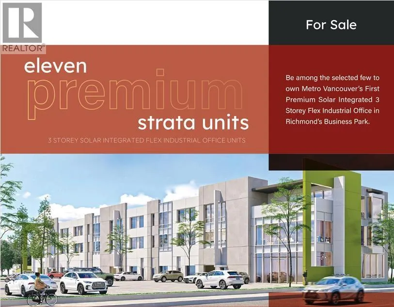 Build the Space of Your Need! Redefining FLEX INDUSTRIAL OFICE SPACE. Metro Vancouver’s first premium solar integrated 3 storey flex industrial office development in Richmond’s Class A Business park. Unit is equipped with private rooftop solar power setup to save electrical cost and reduce carbon footprint, two EV ready parking, shared elevator access to 3rd floor, Ground level 24 ft