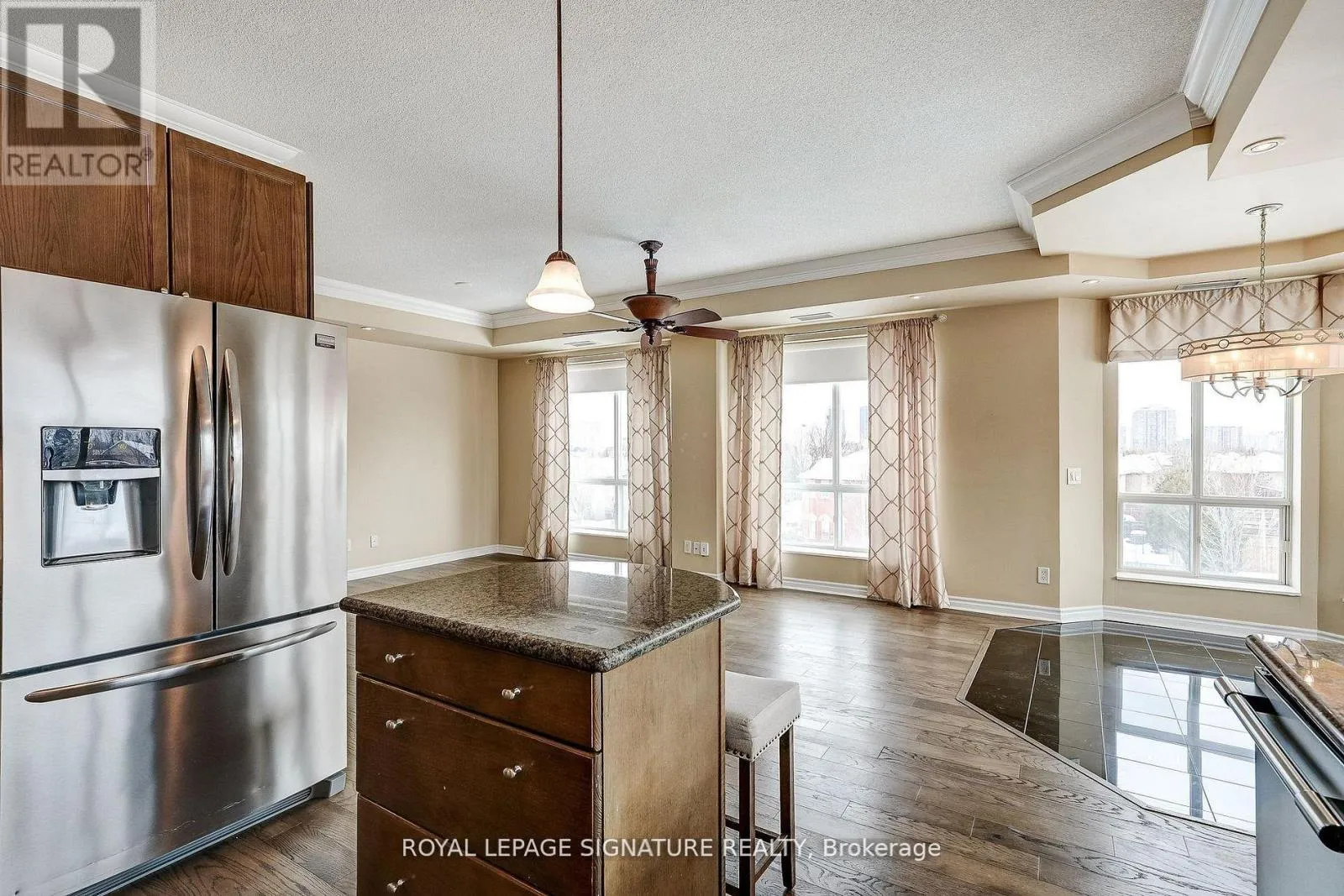 seamlessly connected to the kitchen-ideal for both everyday living and entertaining. The kitchen is equipped with granite countertops, pot lights, under-mount lighting, stainless steel appliances and a centre island. The dining area features a walk-out to a private balcony with a gas line for BBQs. All electric blinds are conveniently operated by remote. The suite includes two generously sized bedrooms and two bathrooms. The primary bedroom features a walk-in closet and a 4-piece ensuite with a separate shower and bathtub. The second bathroom is a 3-piece. Additional highlights include two side-by-side parking spaces located steps to the entrance and one large locker. Building amenities include concierge/security services, visitor parking, guest suites, a party/meeting room and an exercise room. Ideally located near public transit, shops, greenbelt and conservation areas, recreation centres, golf and parks. A must-see home in a highly desirable community-don’t miss your opportunity to make it yours! (id:62650)